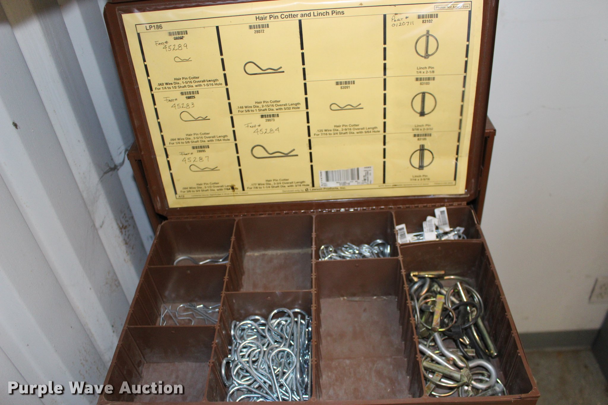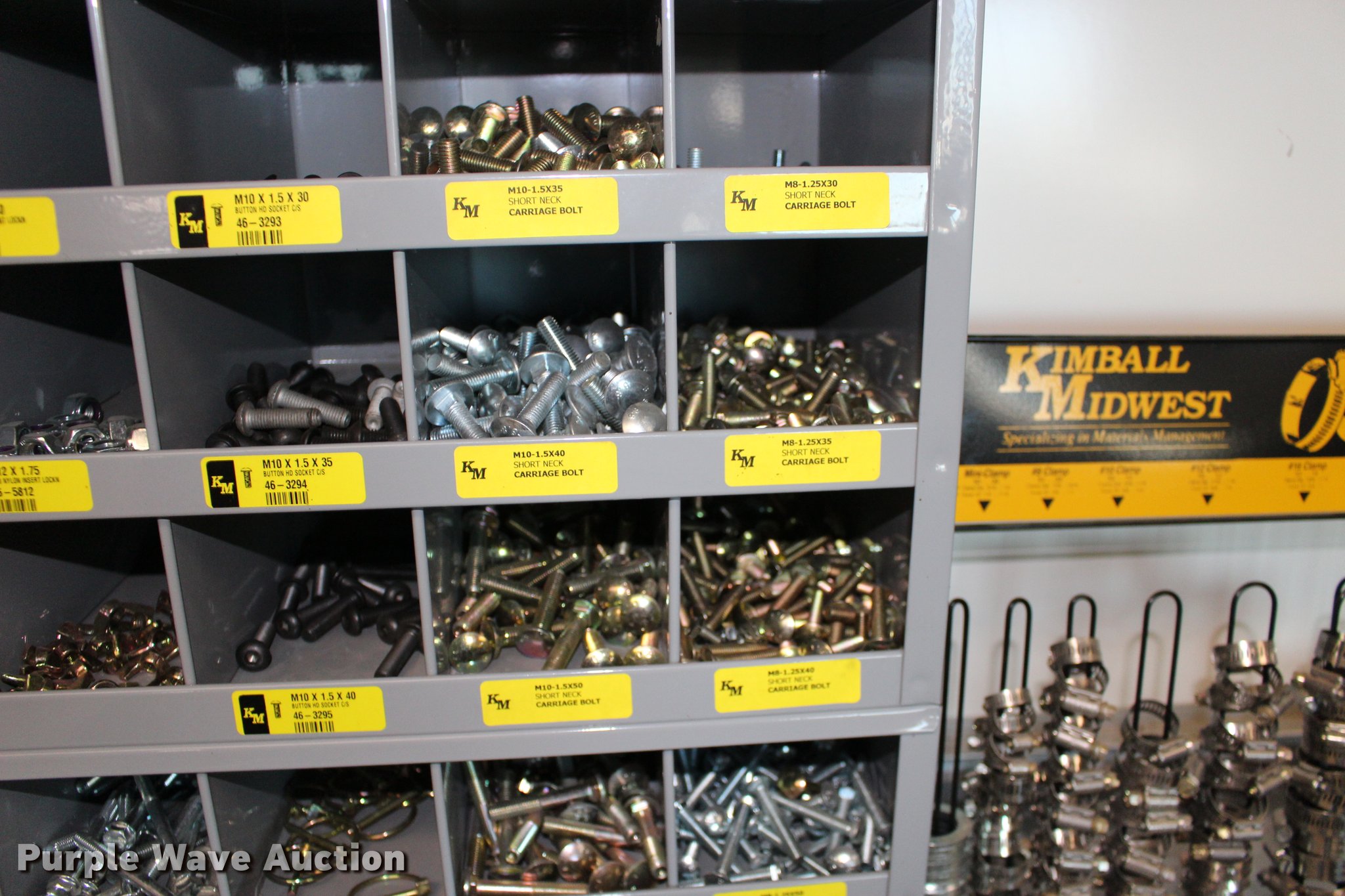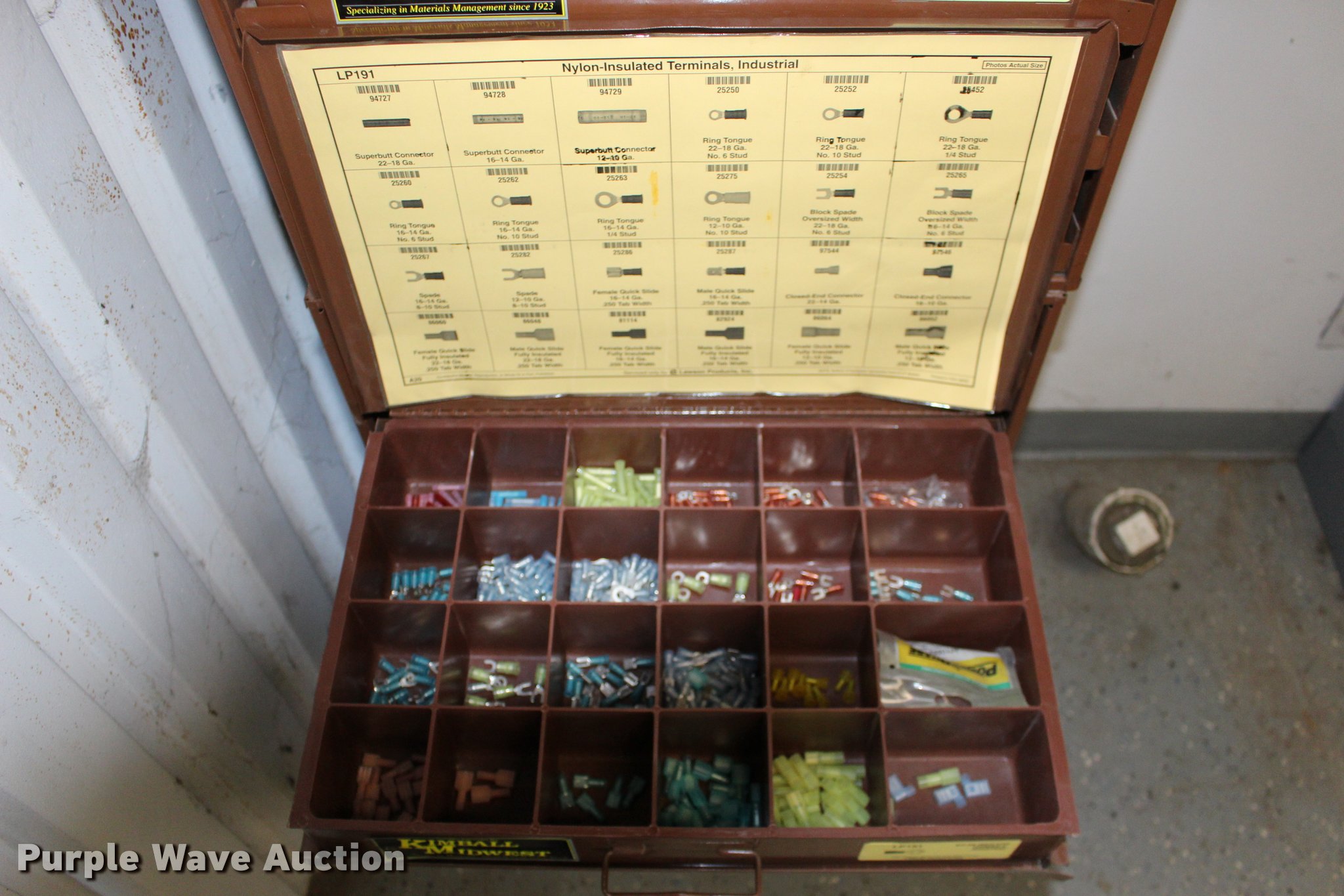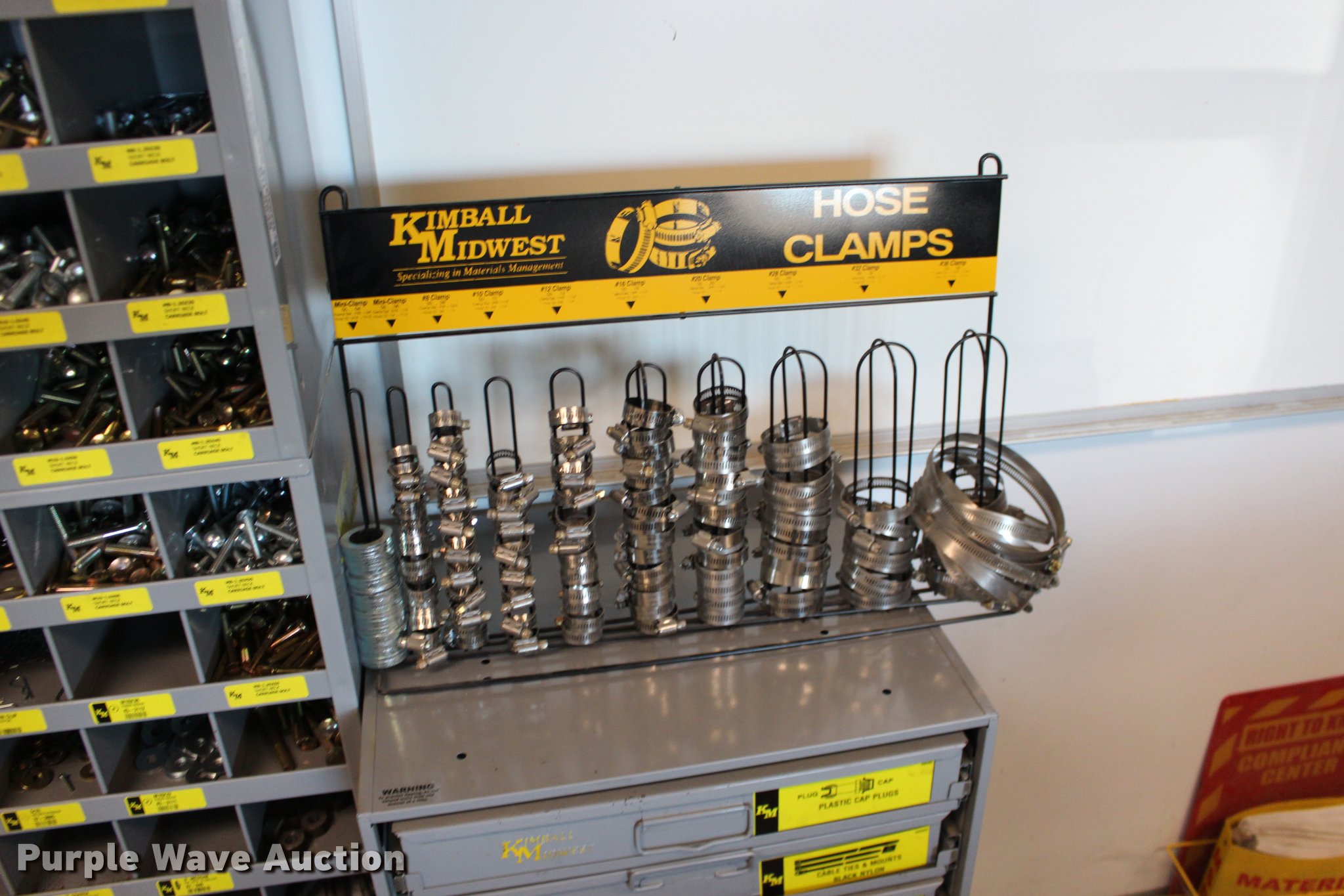 Purple Wave is selling a used Tools in Kansas. This item is a Kimball Midwest bolt bins and hardware cabinets with the following: (20) drawers, Cotter pins, Electrical connectors, Grease fittings, Hose clamps, Metric bolts and nuts, Cap plugs, Socket set screws, Mini fuses, Cable ties