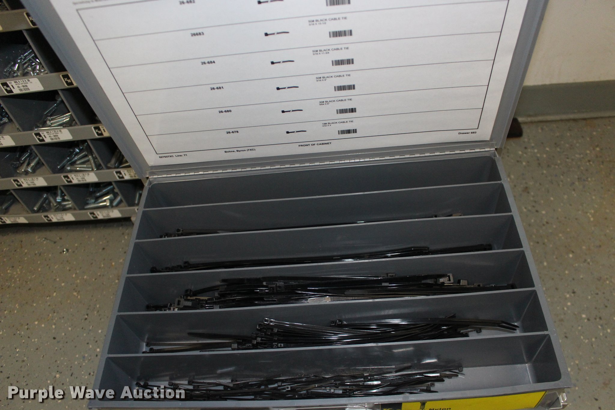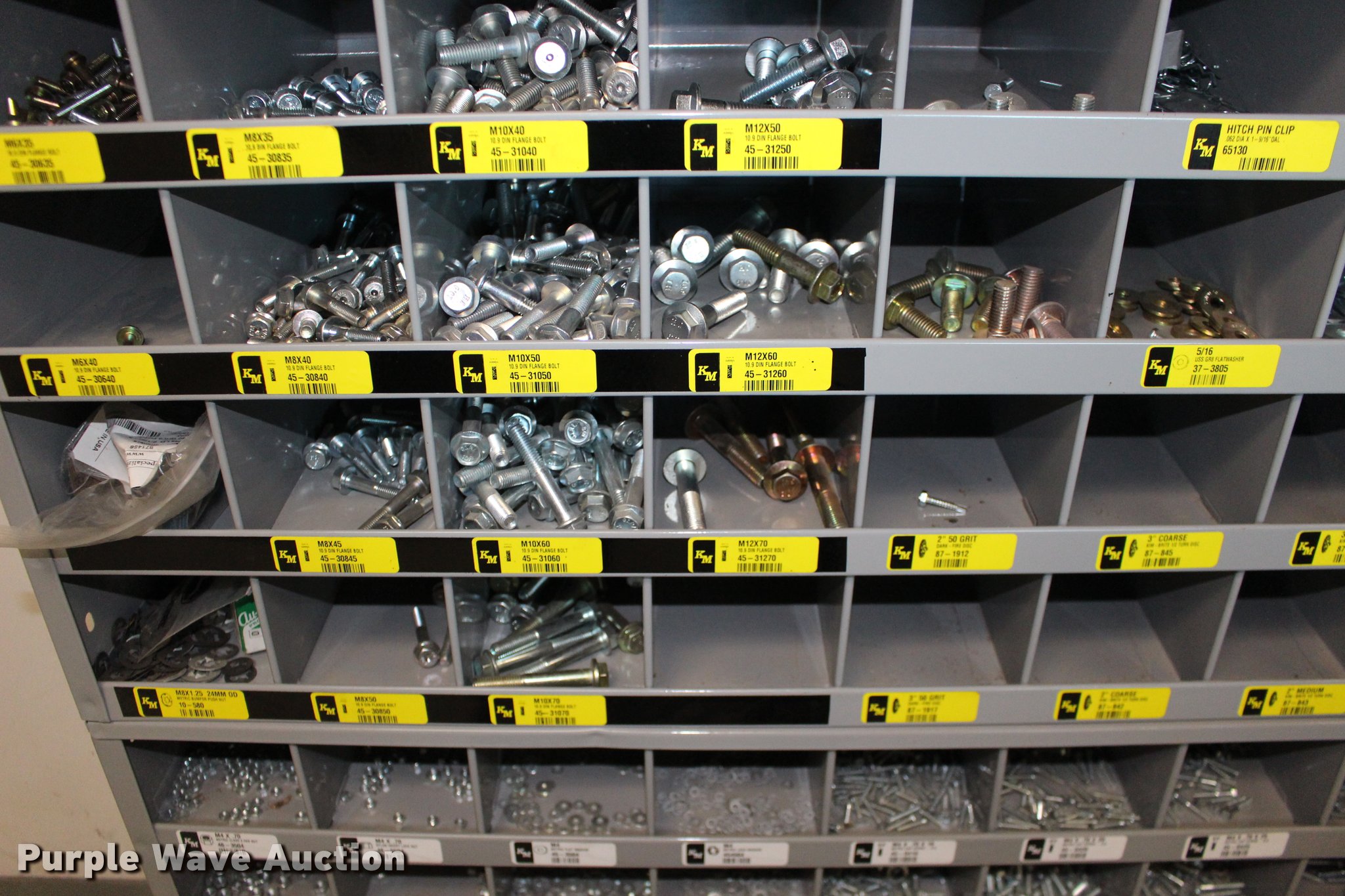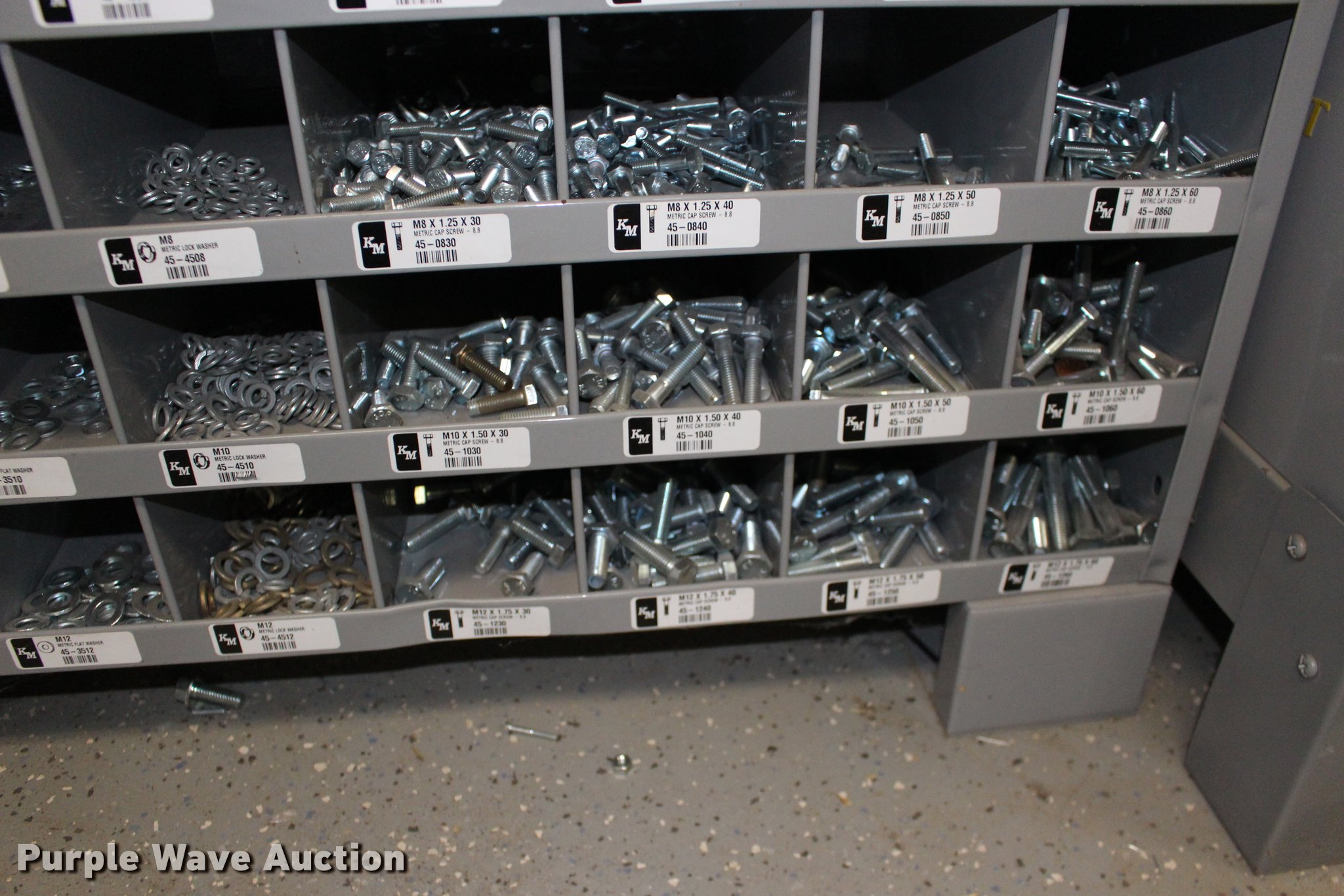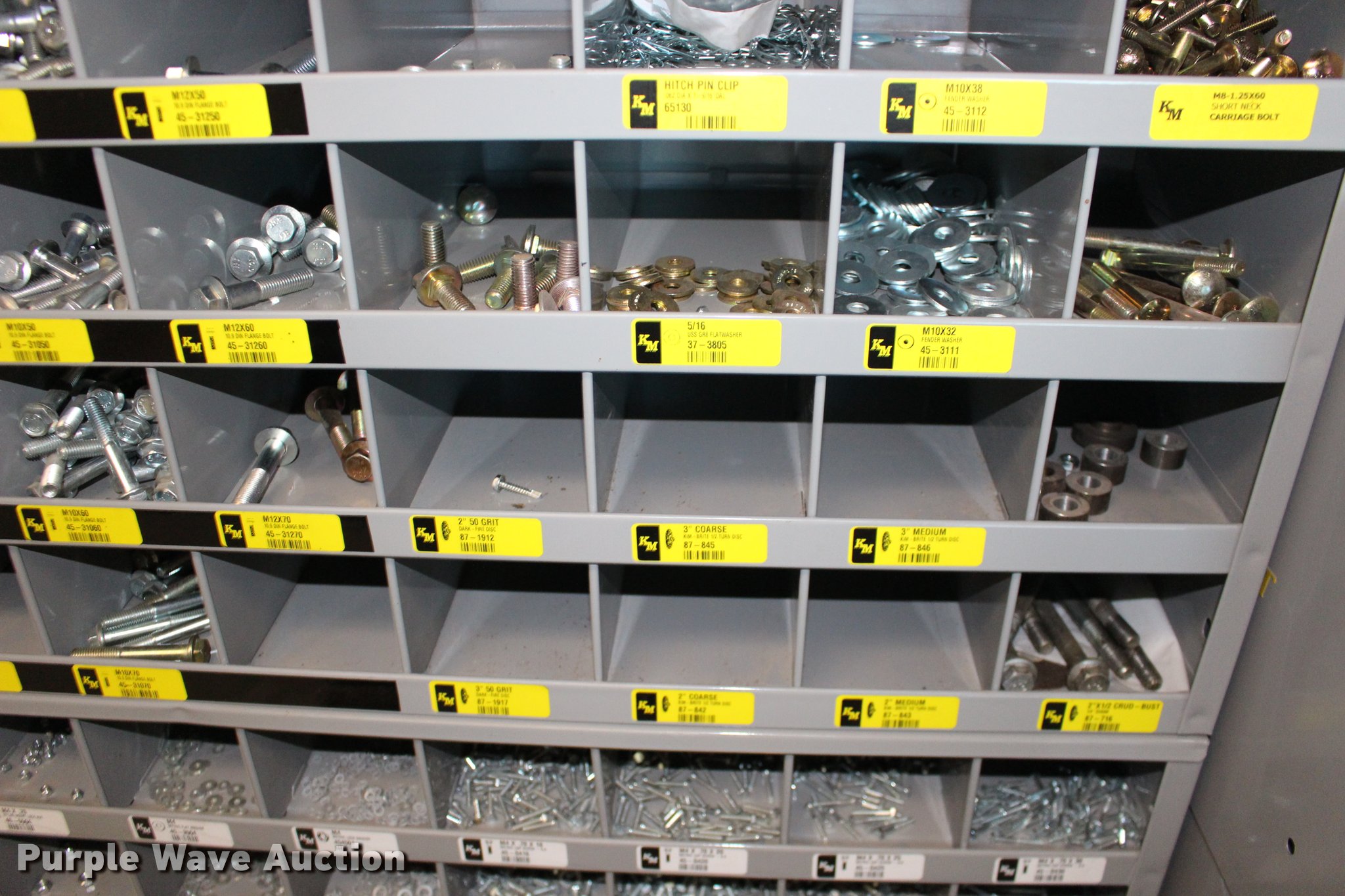 Purple Wave is selling a used Tools in Kansas. This item is a Kimball Midwest bolt bins and hardware cabinets with the following: (20) drawers, Cotter pins, Electrical connectors, Grease fittings, Hose clamps, Metric bolts and nuts, Cap plugs, Socket set screws, Mini fuses, Cable ties