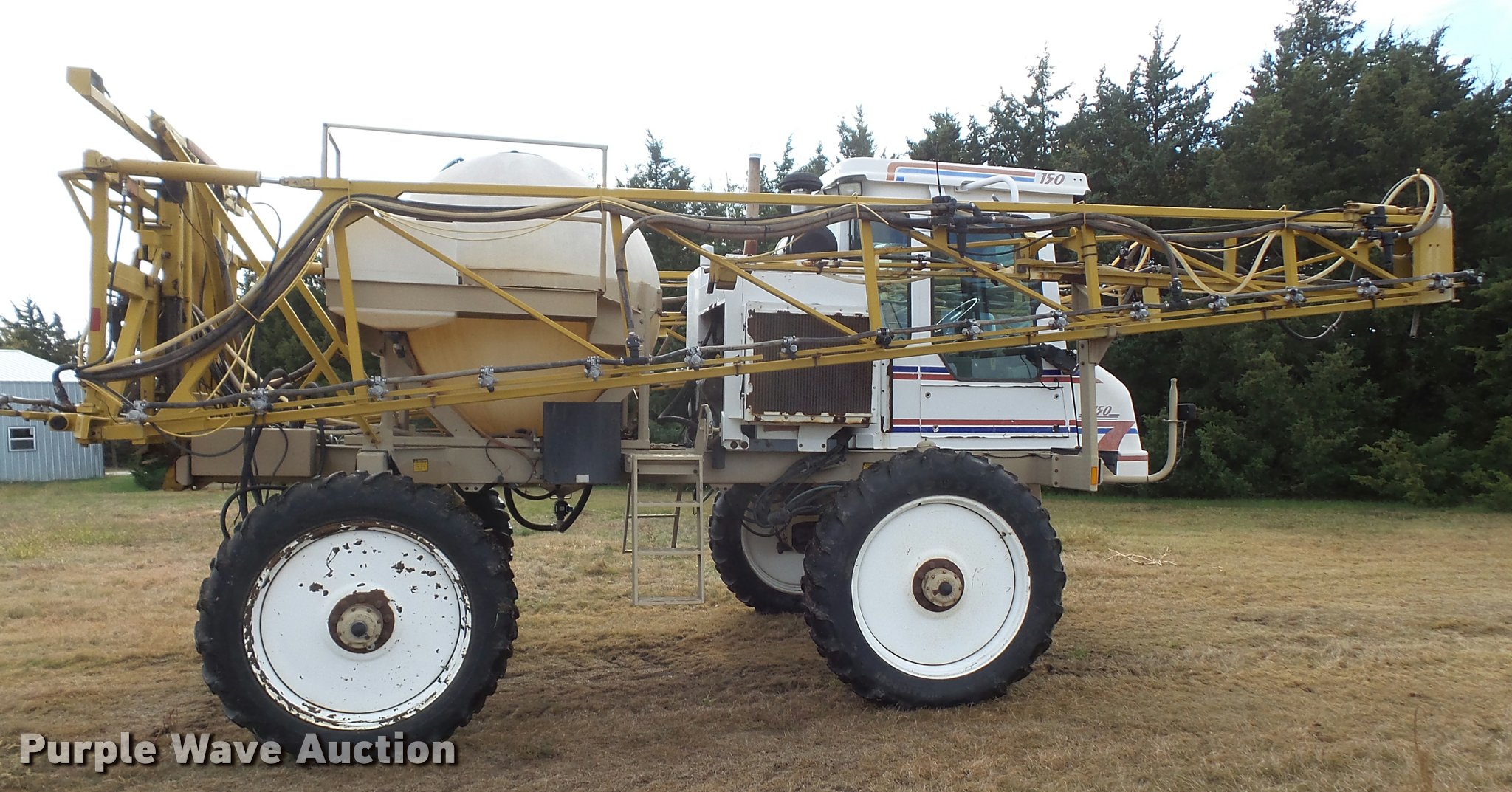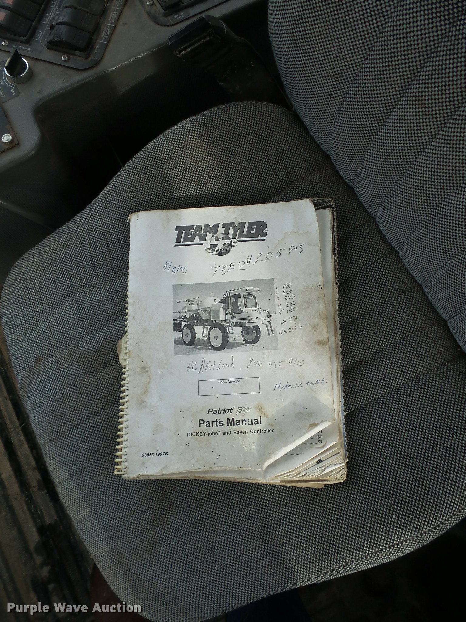 1998 Tyler Patriot 150 self-propelled sprayer. 3,330 engine hours on meter, Deutz BF4M1013C 4.764L four cylinder turbo diesel engine 139 HP, Hydrostatic transmission, Four wheel drive, Hydraulic axle width adjustment, 750 gallon poly solution tank, (3) stainless steel chemical eductor, 35 gallon rinse tank, Foam marker, 35 gallon clean water tank, 90'W boom (5) boom sections, Breakaway boom, Hydraulic boom fold, 20" nozzle spacing, Three-way and five- way nozzle bodies, AC and heat, AM/FM, Suspension seat, Work lights, Raven SCS460 ground radar, 12.4-38 tires, Non-operational hour meter, Non-operational brakes, Serial 7752668D03. Longford, KS 67458