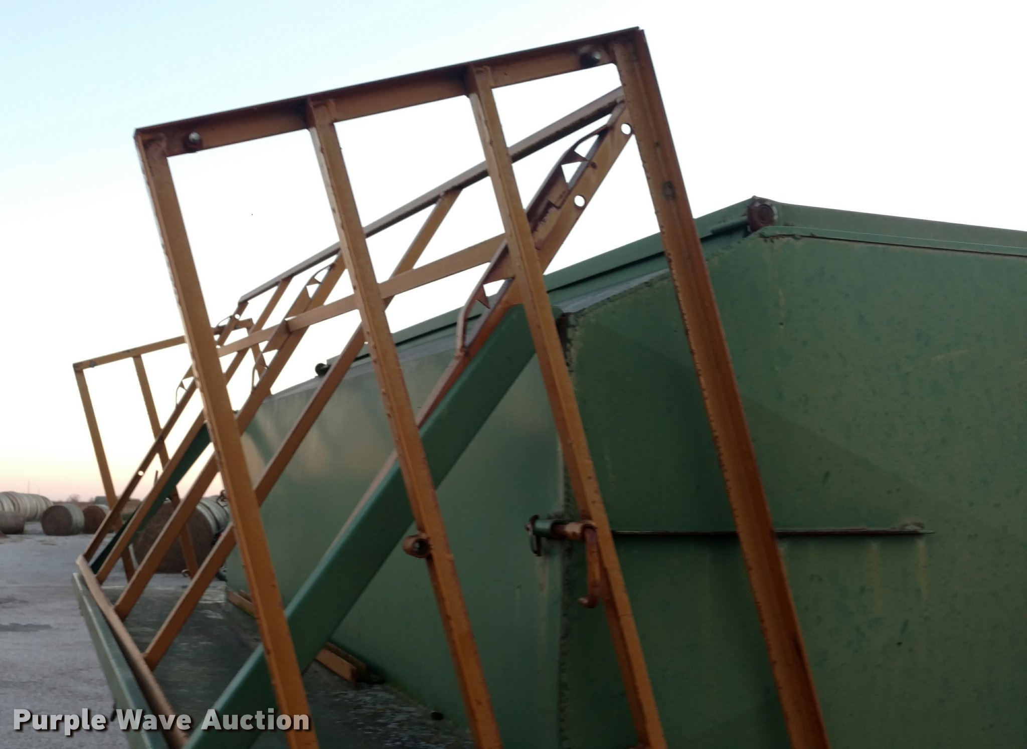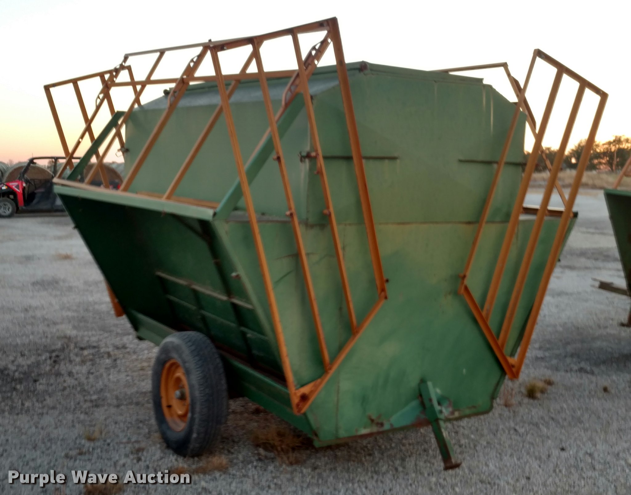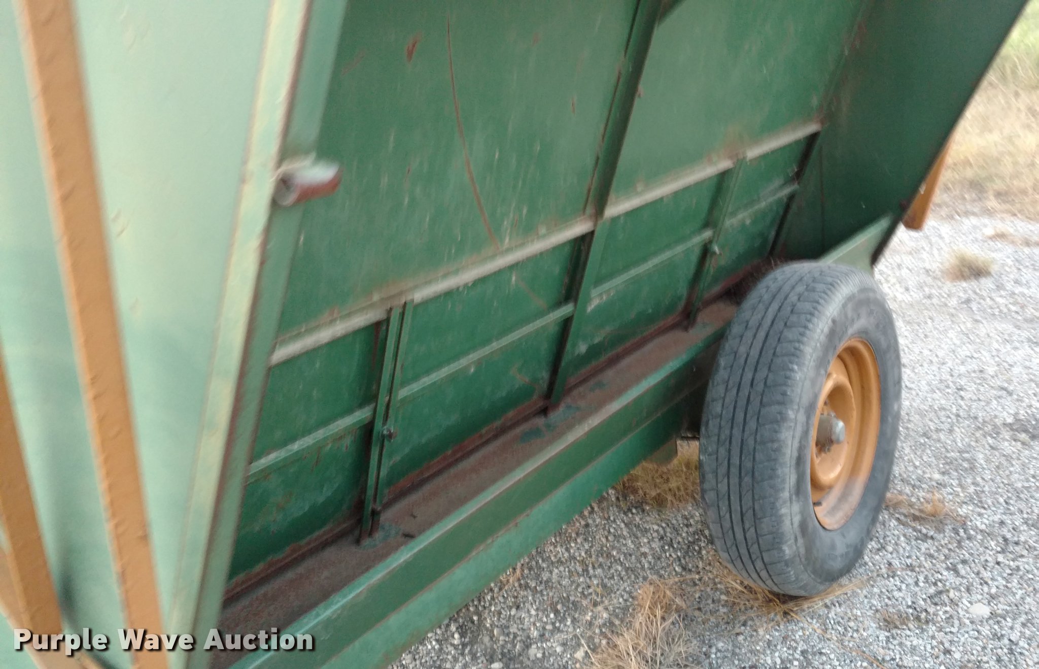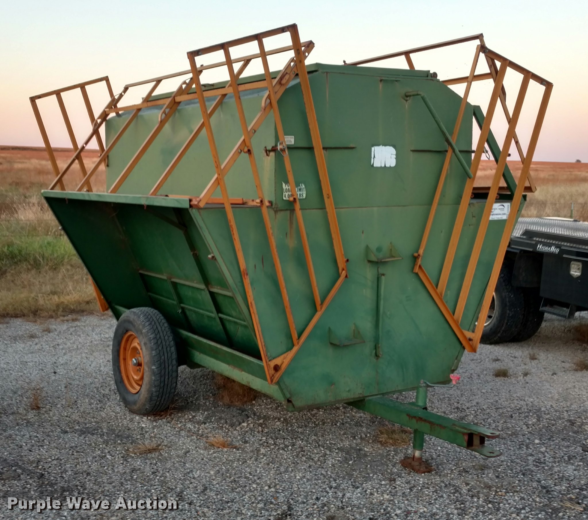 Purple Wave is selling a used Livestock Equip. in Kansas. This item is a Steel creep feeder with the following: 8'L, 4,000 lbs capacity, Pin hitch, Rust