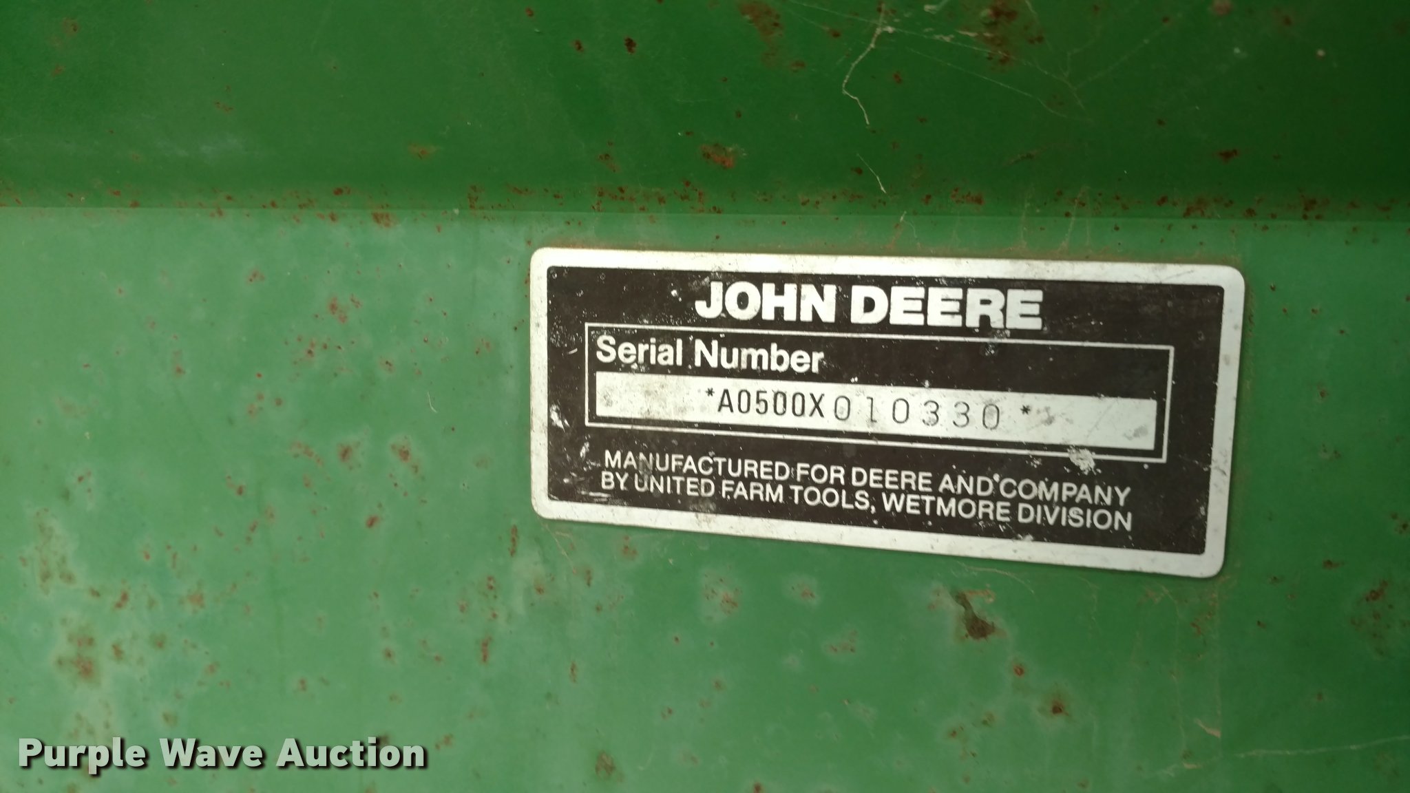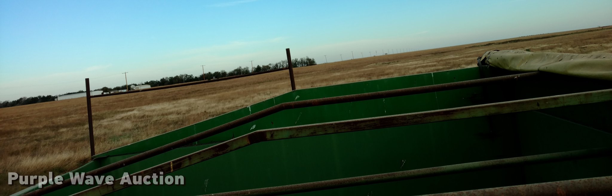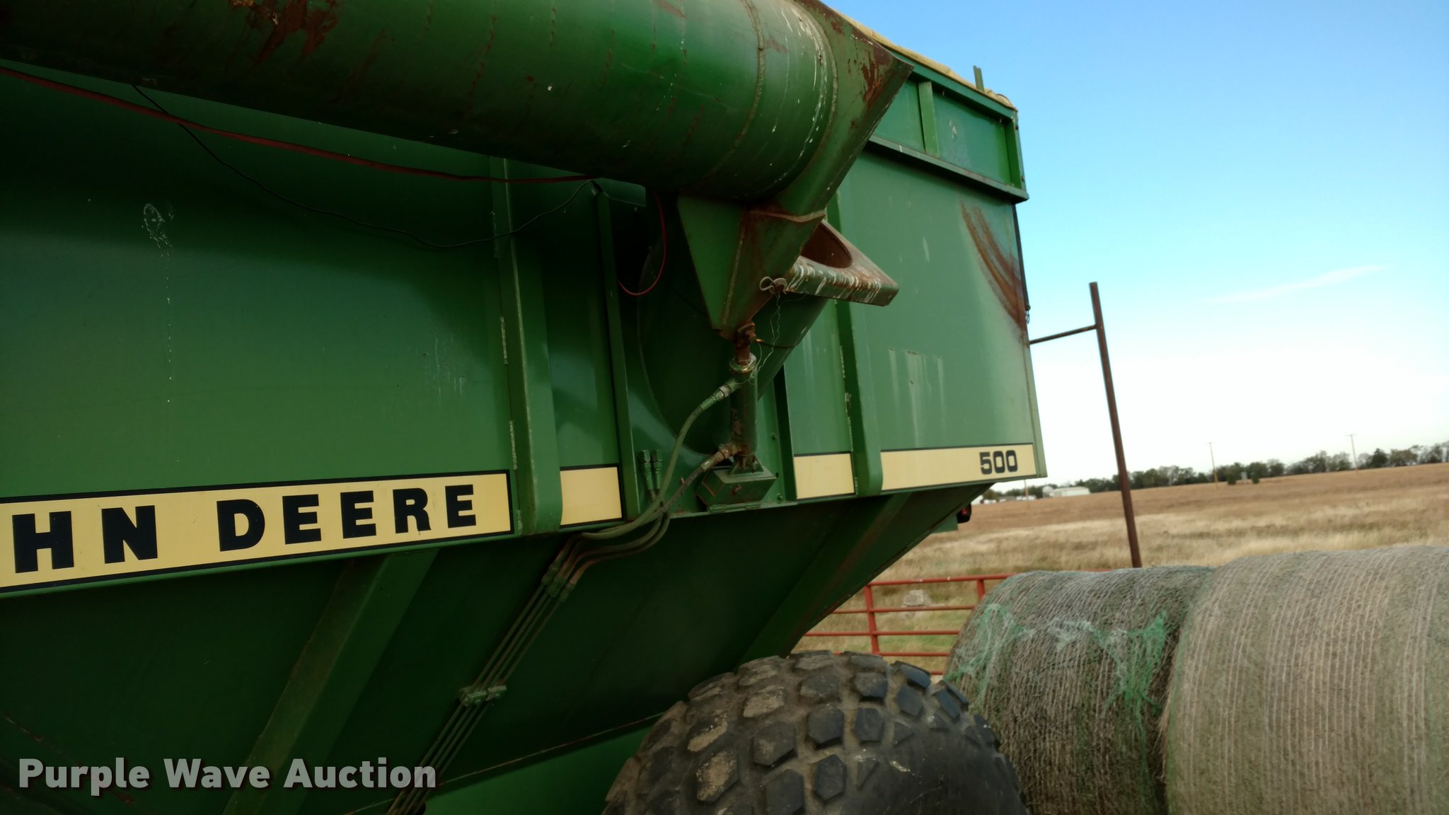 Purple Wave is selling a used Grain Cart or Gravity Wagon in Kansas. This item is a John Deere 500 grain cart with the following: 15" unloading auger, Hydraulic operation, Rollover tarp, 1000 PTO, Pin hitch, 18.4-26 tires, Serial A0500X010330