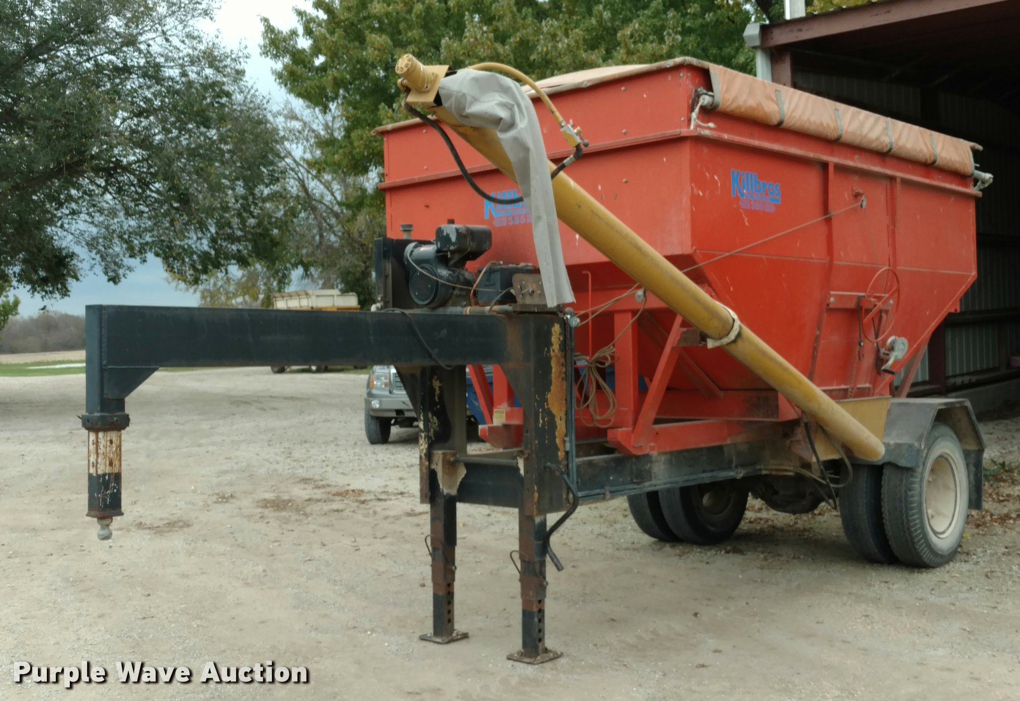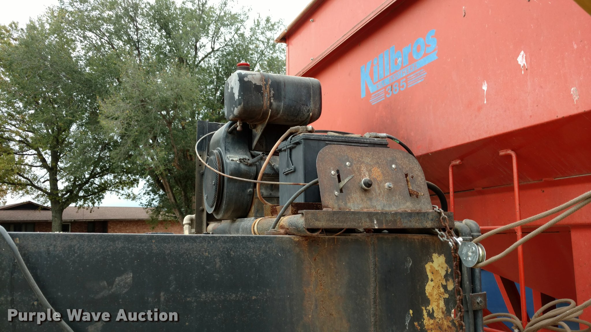 Purple Wave is selling a used Fertilizer or Seed Tender in Kansas. This item is a Killbros 385 seed tender with the following: Tecumseh XL gas engine, Self-contained hydraulics, Unload auger, Rollover tarp, Dual leg landing gear, 9.00R20 tires, Serial D1800262