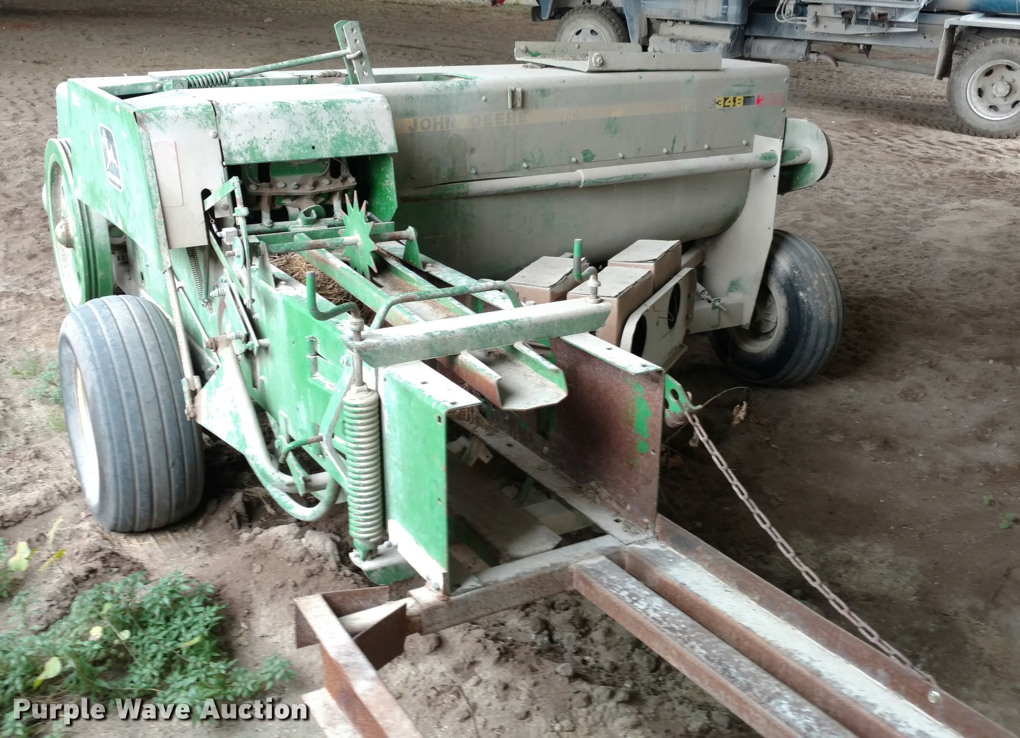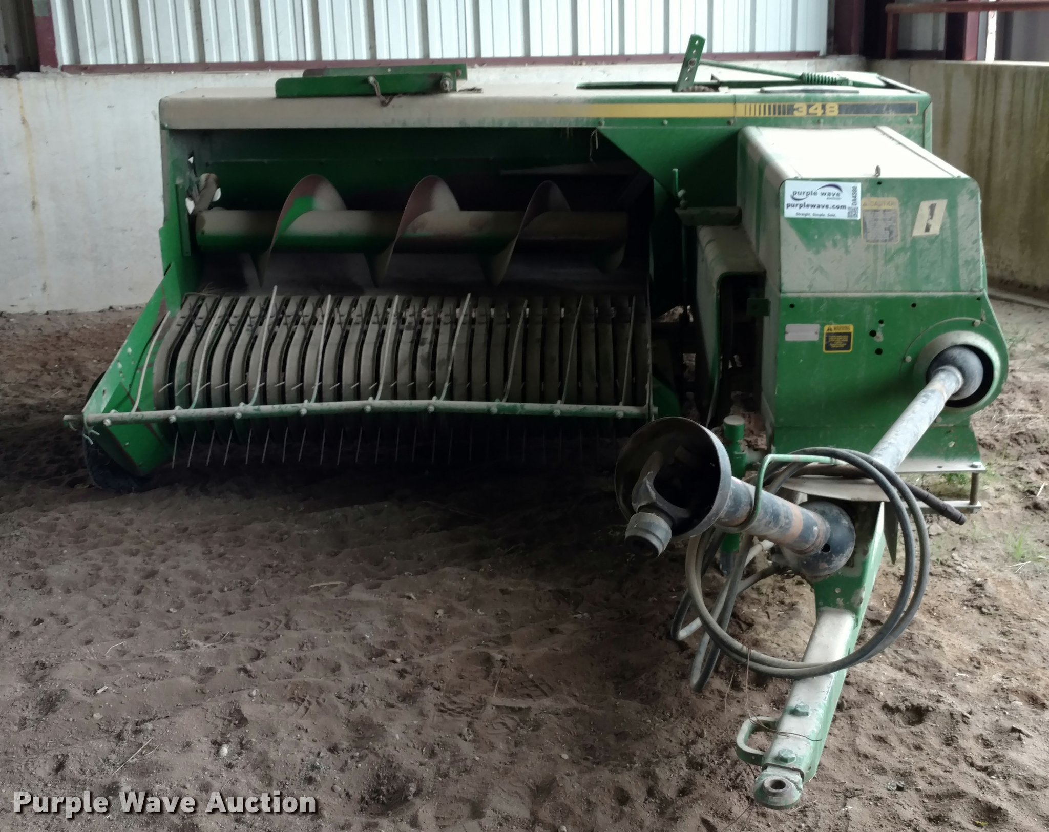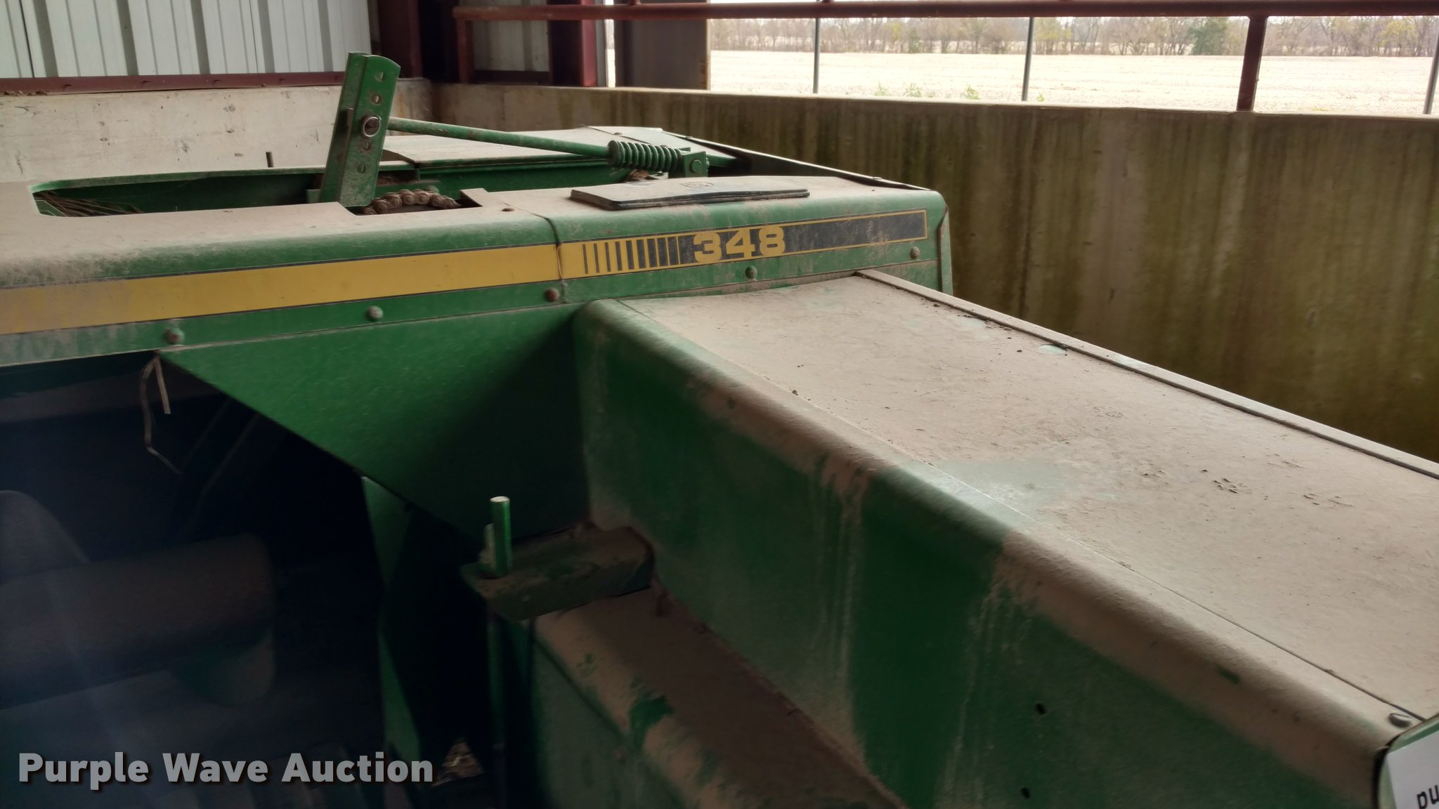Purple Wave is selling a used Square Baler in Kansas. This item is a John Deere 348 small square baler with the following: Wire tire, 540 PTO, Pin hitch, Hydraulic tongue swing, 26x12.00-12 outside pickup tire, 11L-14 tires, Serial E00348X966080