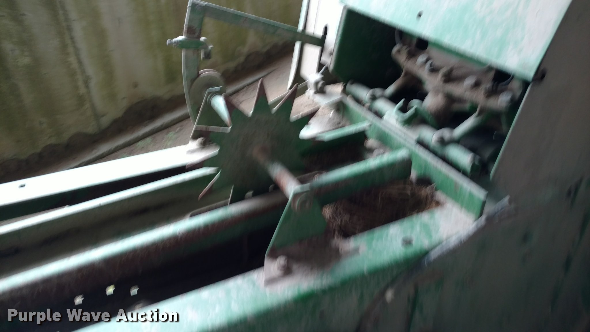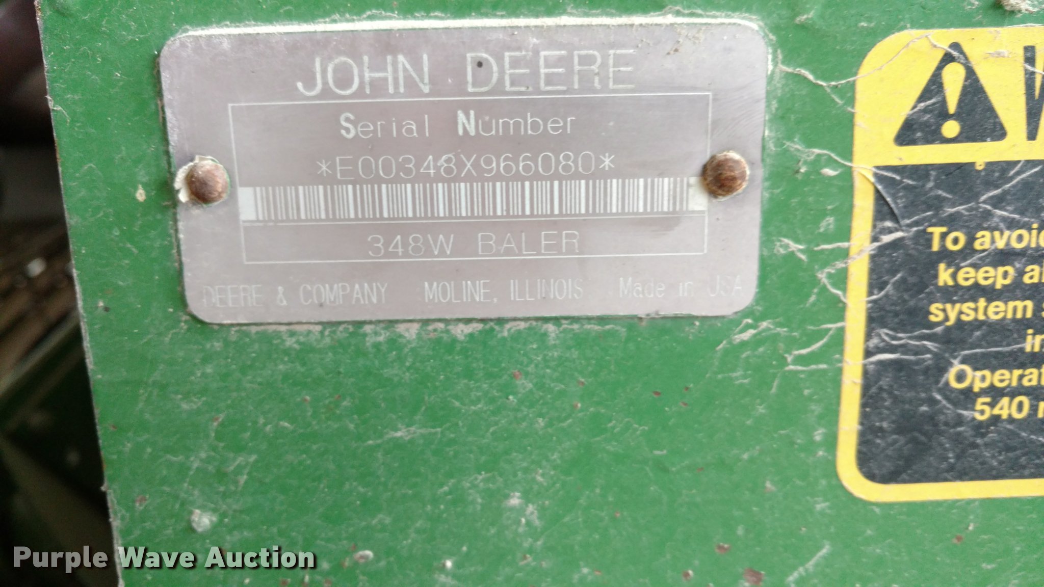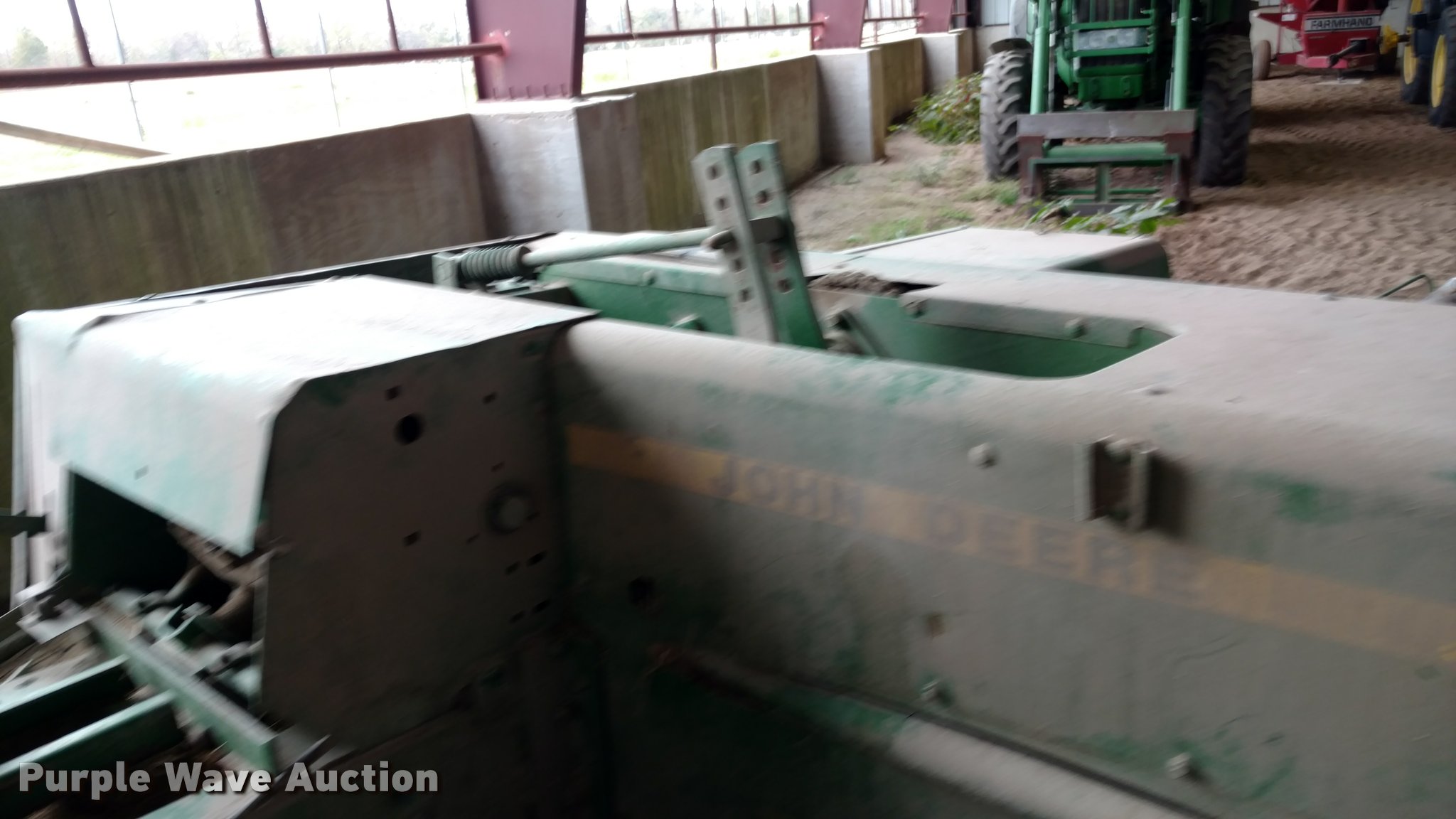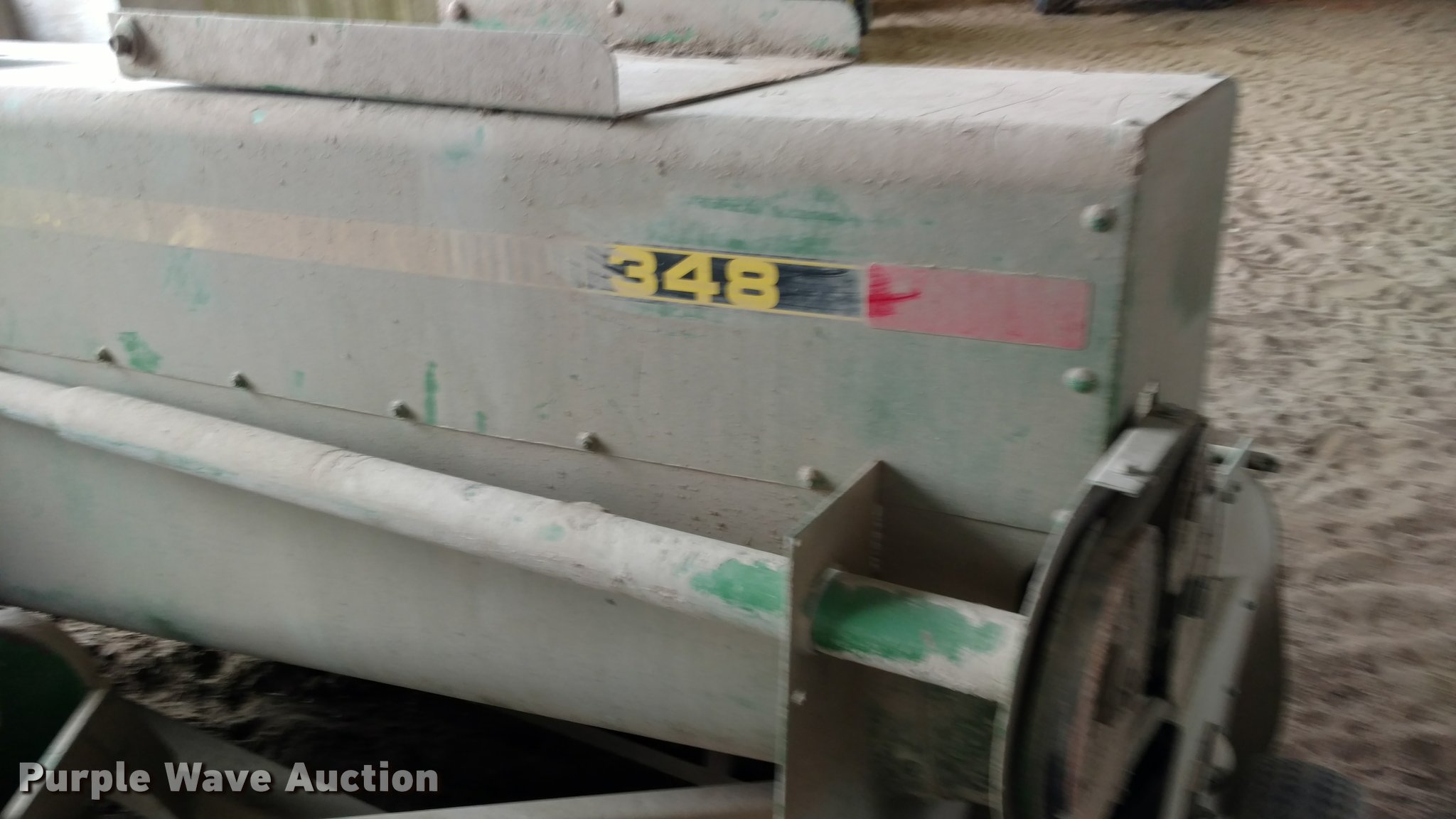 Purple Wave is selling a used Square Baler in Kansas. This item is a John Deere 348 small square baler with the following: Wire tire, 540 PTO, Pin hitch, Hydraulic tongue swing, 26x12.00-12 outside pickup tire, 11L-14 tires, Serial E00348X966080