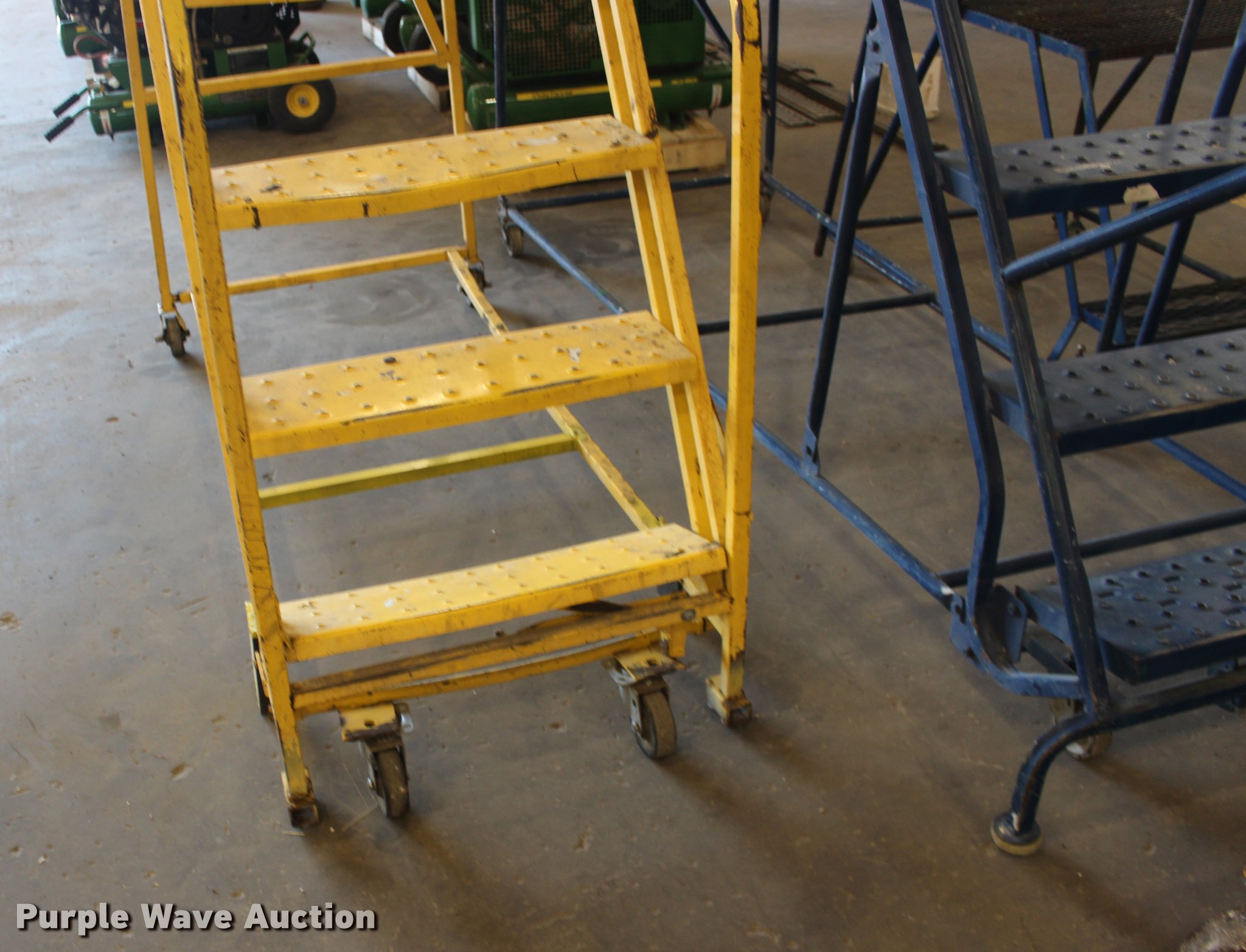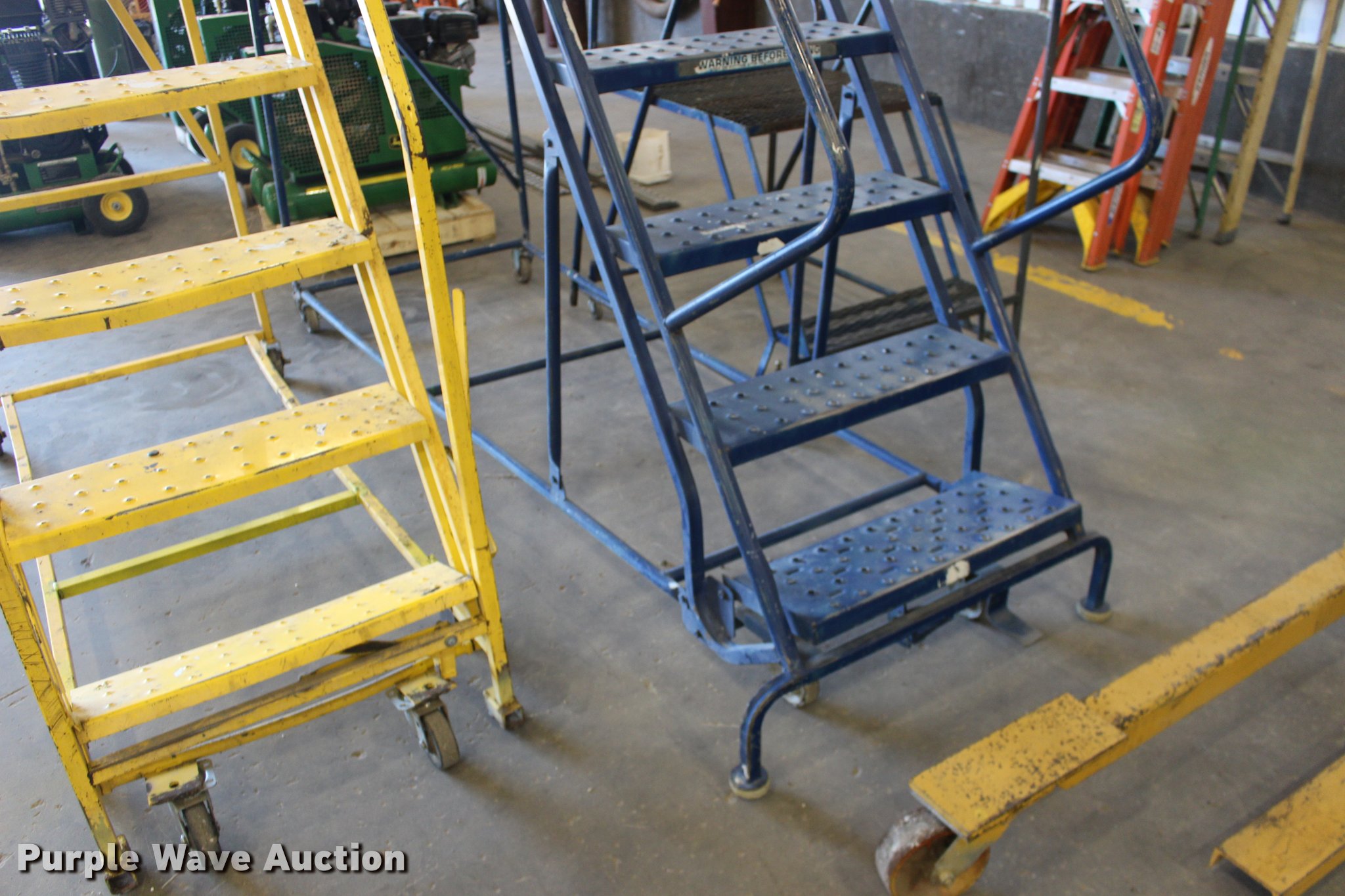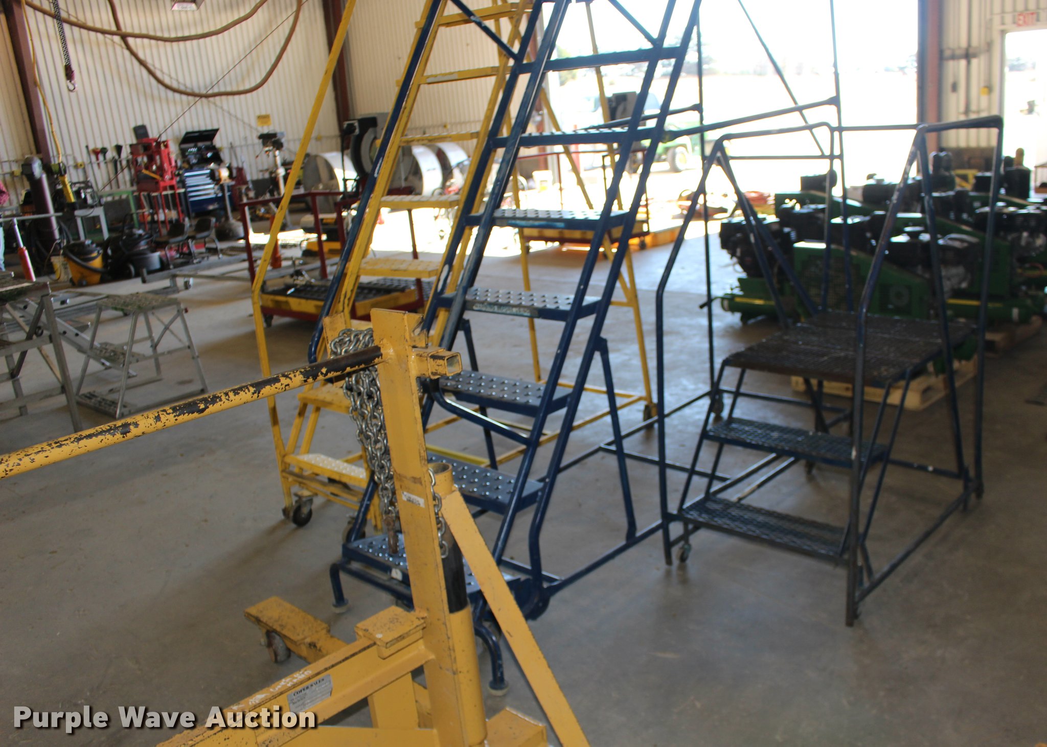 Purple Wave is selling a used Tools in Kansas. This item is a (3) shop ladders with the following: 30" x 24" platform ladder, 28" platform height, 43" x 26" x 58" overall, 8' x 3' x 11', 65" x 26" x 10', Wheels