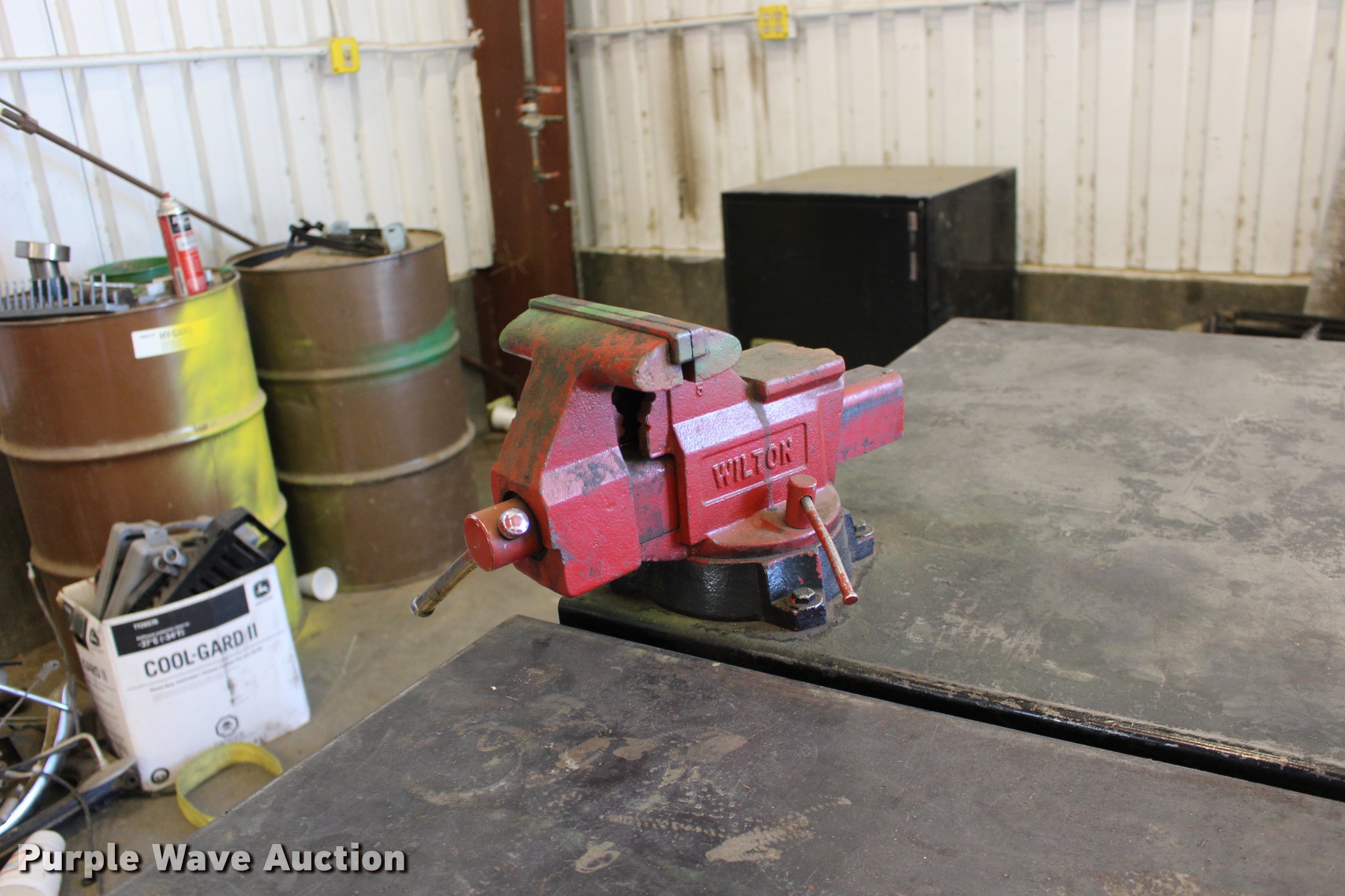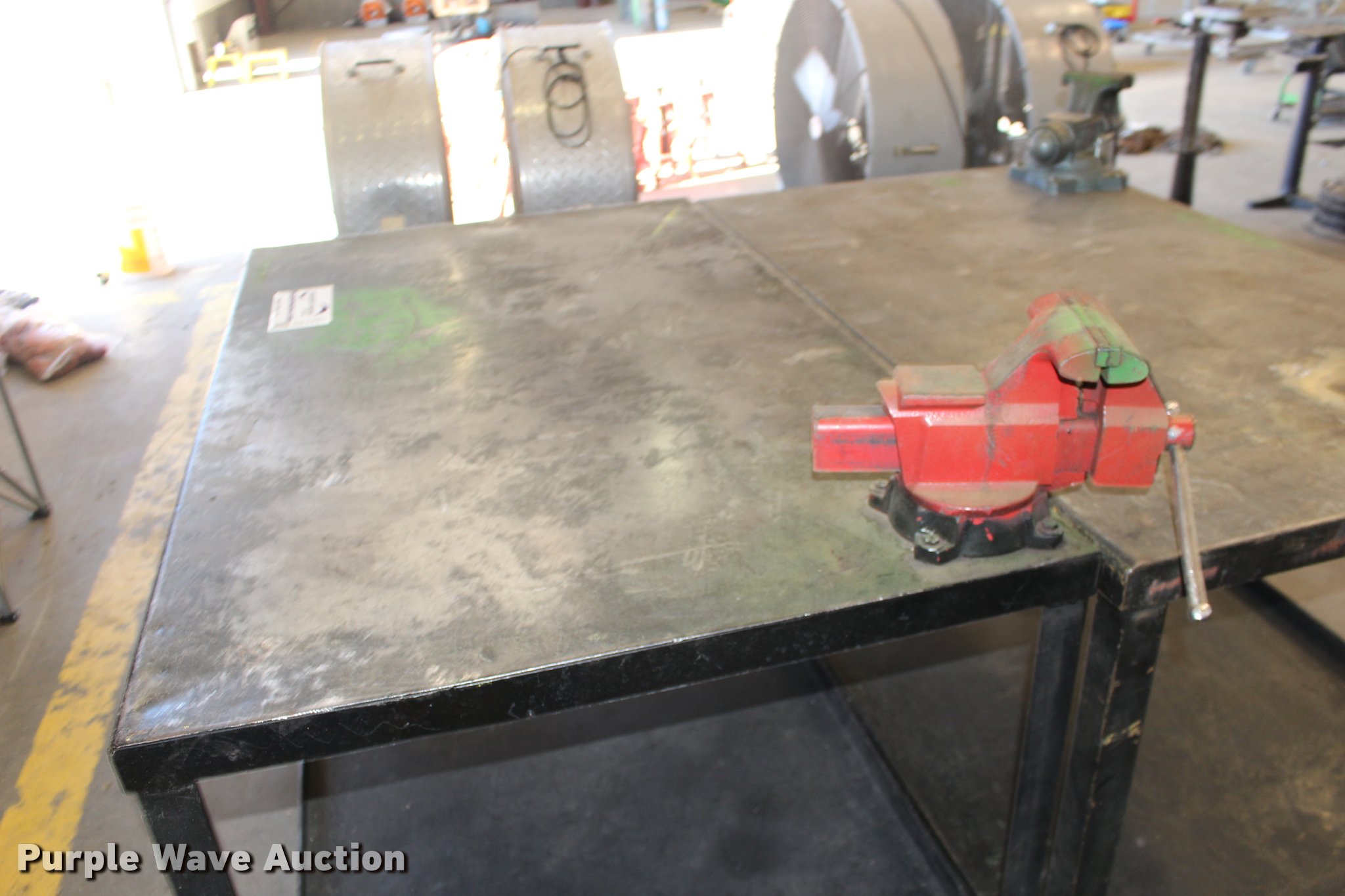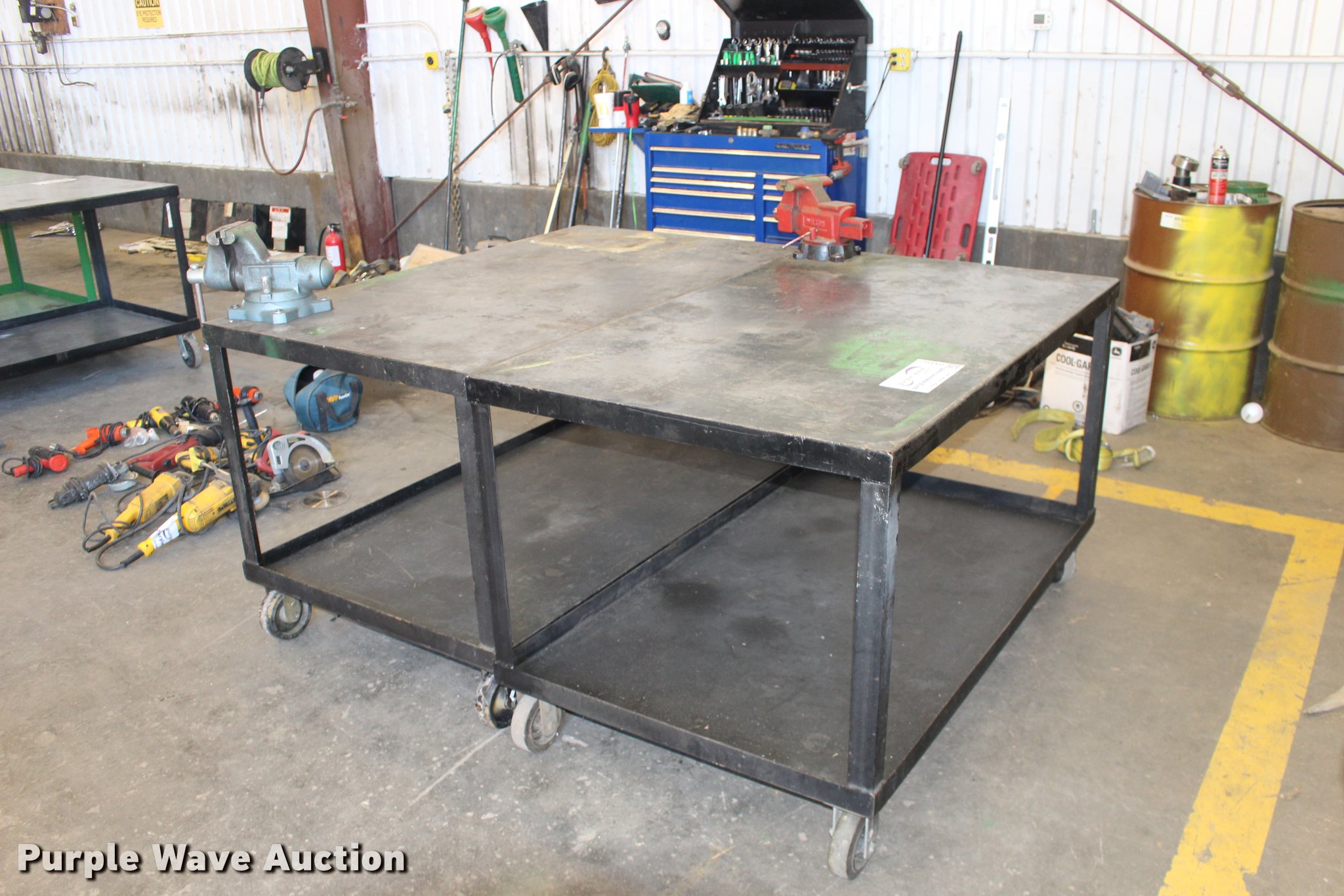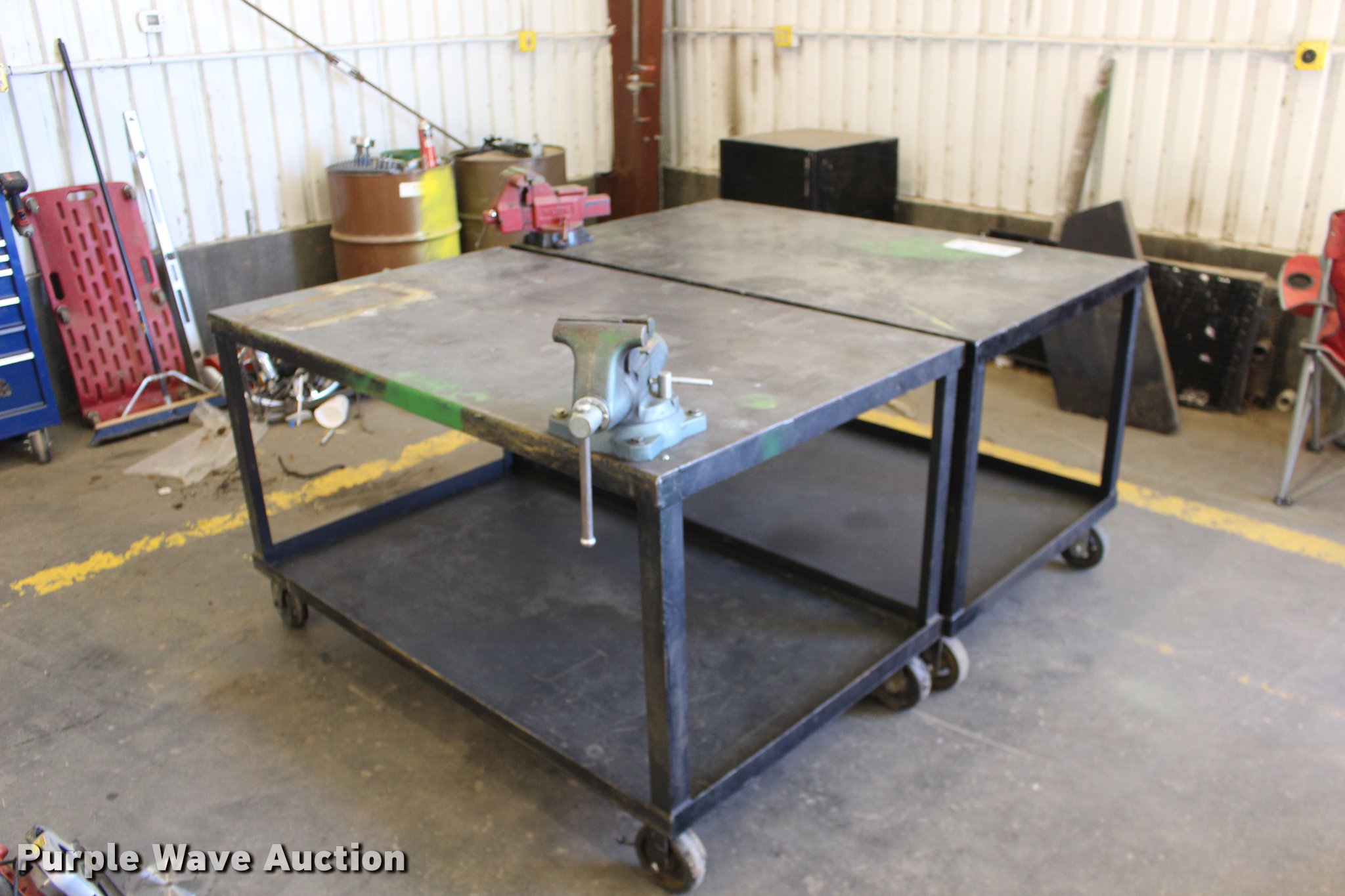 Purple Wave is selling a used Tools in Kansas. This item is a (2) steel shop tables with the following: 3' x 5' x 3', (2) vises, Wheels