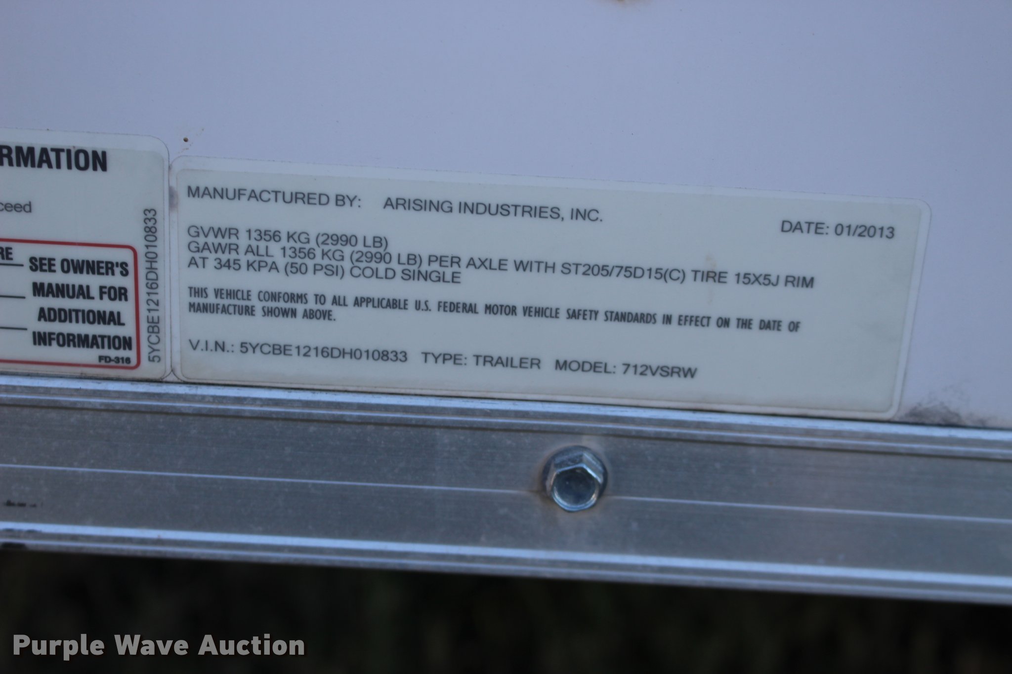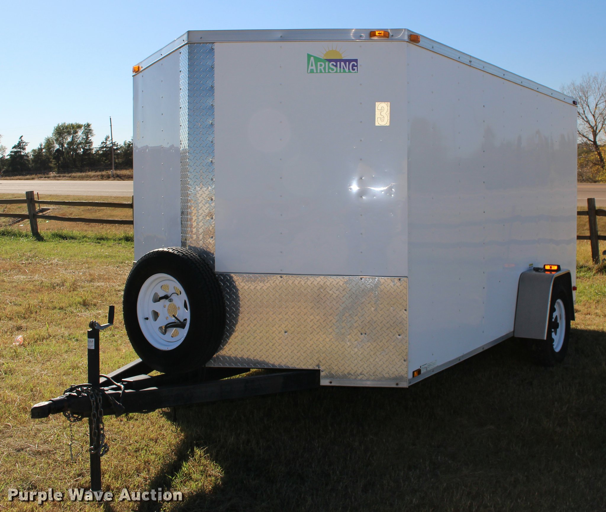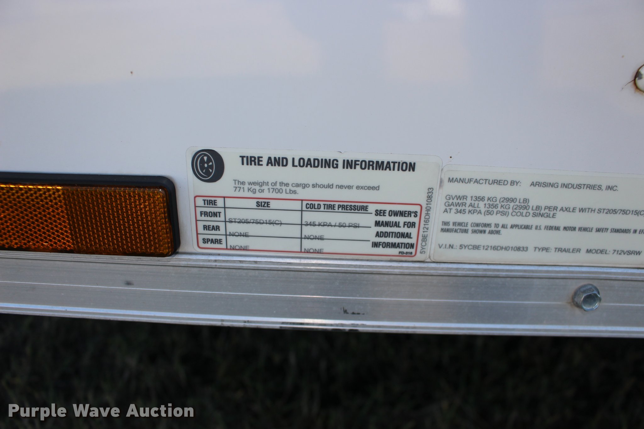 Purple Wave is selling a used Enclosed Cargo Trailer in Kansas. This item is a 2013 Arising 712VSRW enclosed cargo trailer with the following: 14.5'L x 7'W x 78"H, Side entry door, Rear ramp door, V-nose, 2" ball hitch, 205/75R15 tires