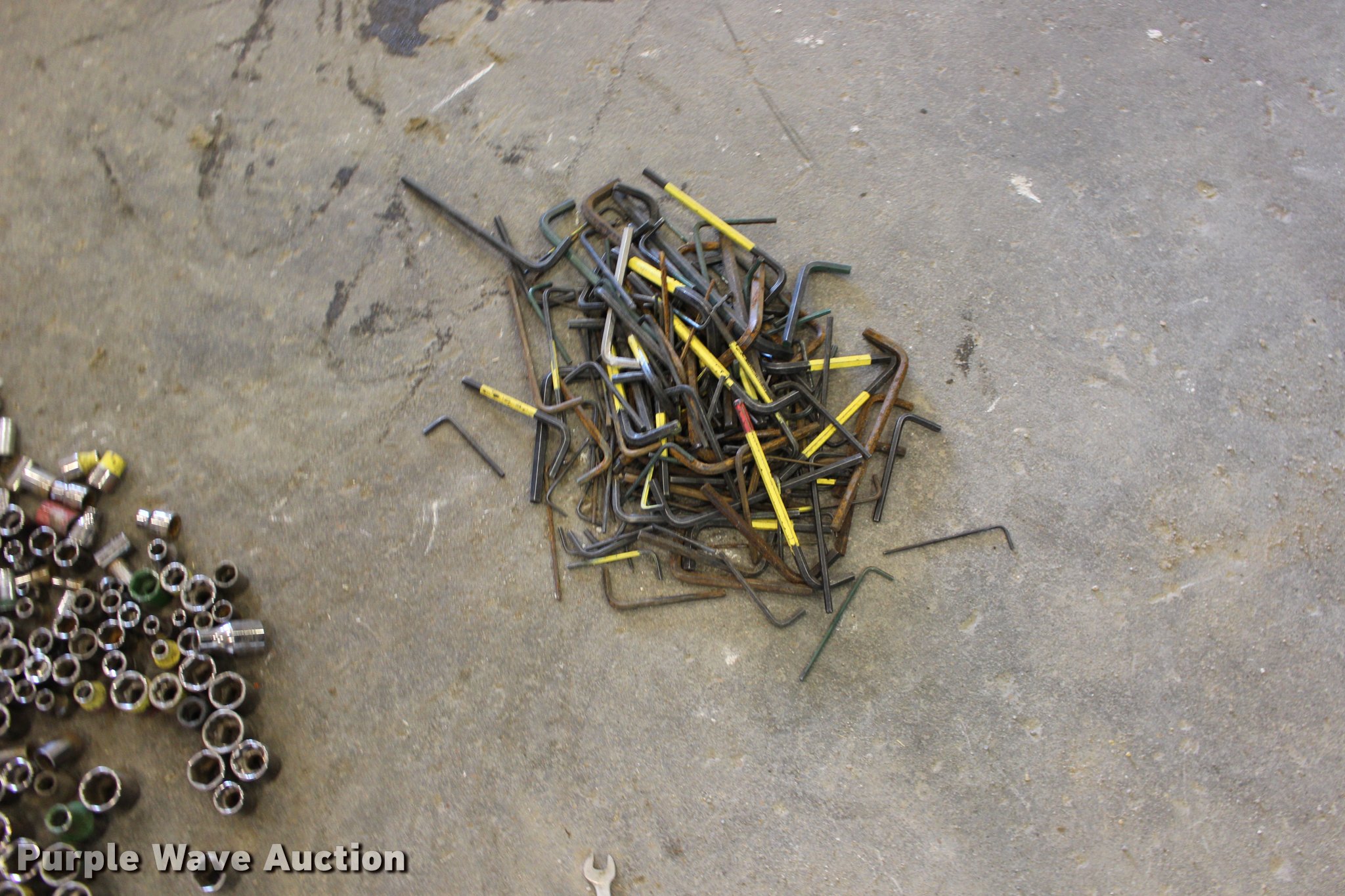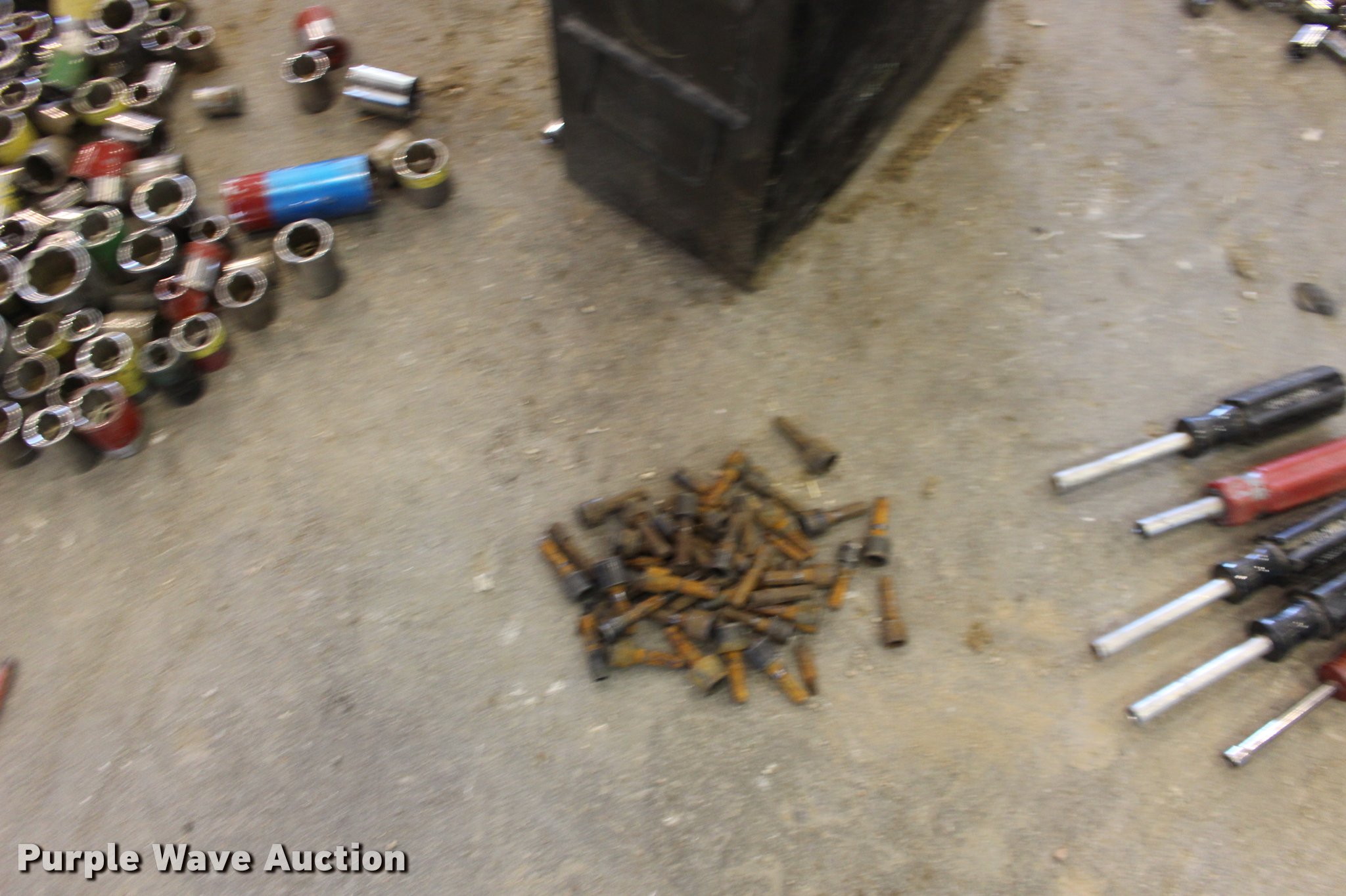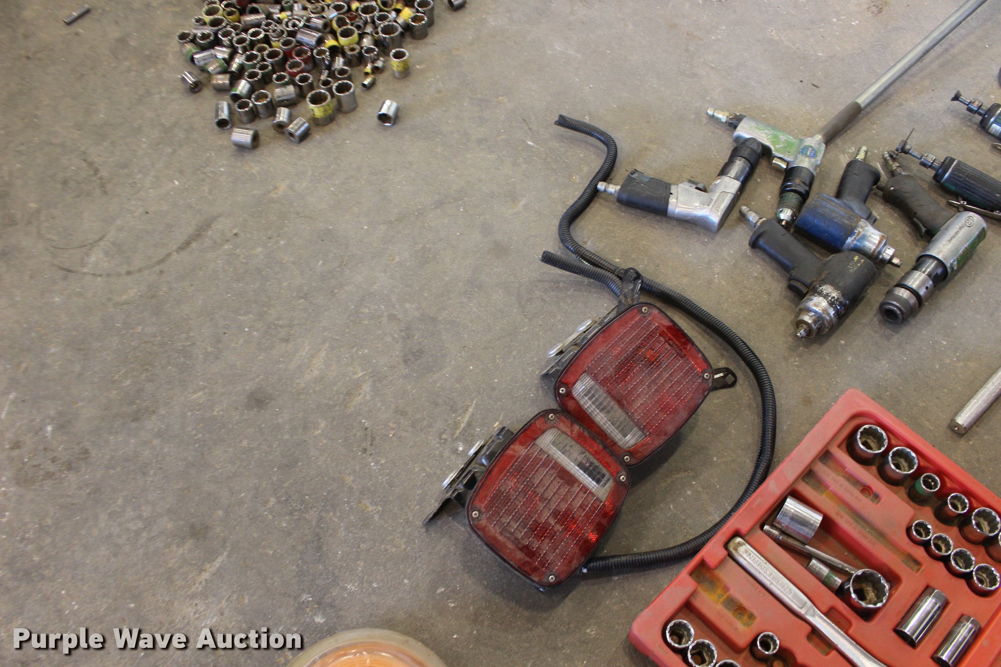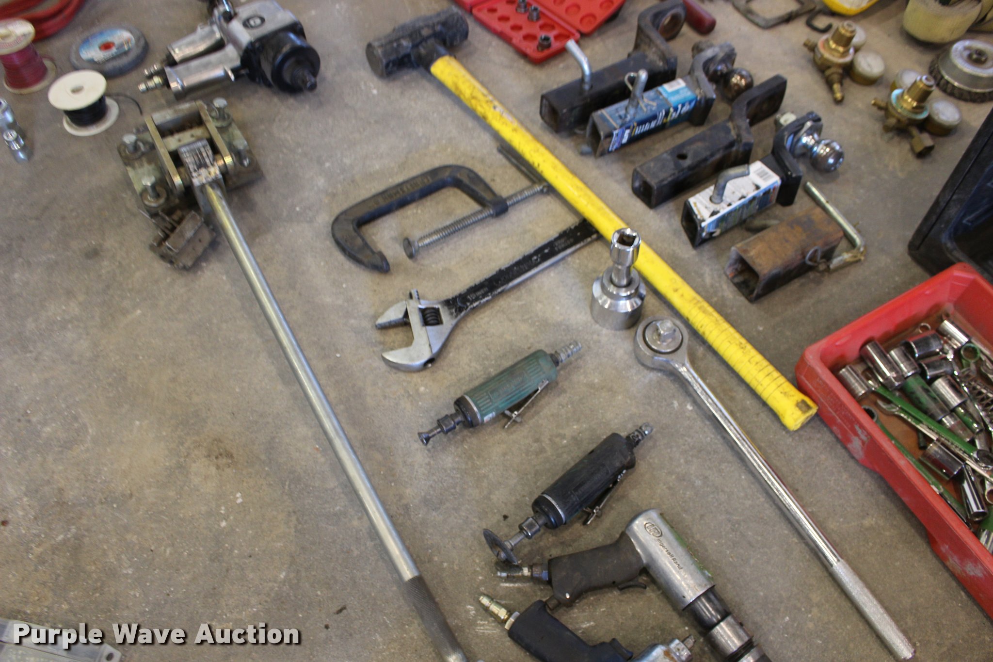 Purple Wave is selling a used Tools in Kansas. This item is a Shop equipment with the following: O-ring kits, Cordless drills, Cordless impact, Lock jaw pliers, Chain hoists, Sockets, Branding iron, Ratchets, Wrenches, Trailer lights, Air tools, Trailer hitches, Chain breaker, Jumper cables, Allen wrenches, Screw drives and more