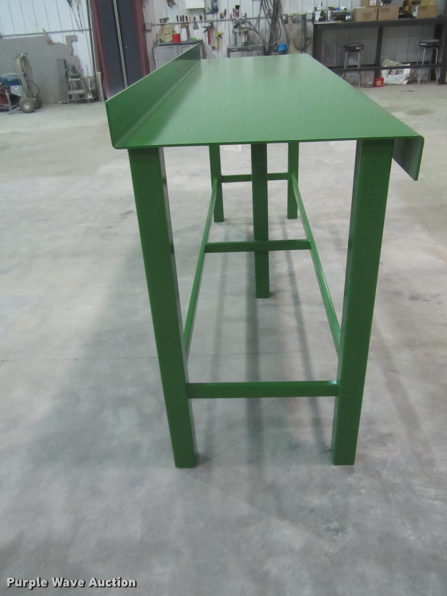 Purple Wave is selling a used Tools in Nebraska. This item is a Kush Manufaturing work bench with the following: 8'L x 28" depth/width, 44" table top height, 4" back splash and front rub, 11,000 lbs, Sandblasted, Two part urethane paint, 1/4" thick bench top, 3" square tube, 11 gauge, Heavy duty legs, Color: Green, All USA steel, full weld, Unused, Stored inside