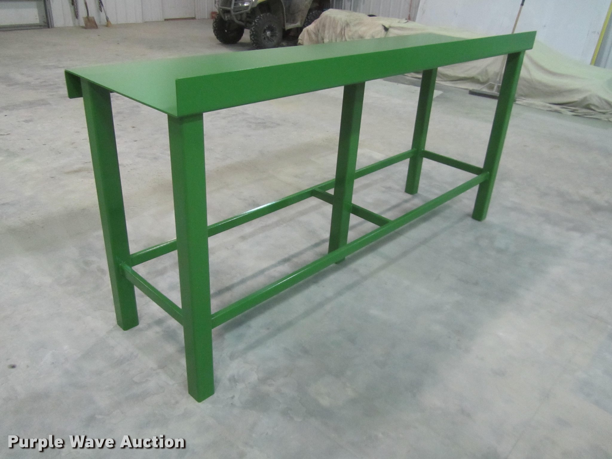 Purple Wave is selling a used Tools in Nebraska. This item is a Kush Manufaturing work bench with the following: 8'L x 28" depth/width, 44" table top height, 4" back splash and front rub, 11,000 lbs, Sandblasted, Two part urethane paint, 1/4" thick bench top, 3" square tube, 11 gauge, Heavy duty legs, Color: Green, All USA steel, full weld, Unused, Stored inside
