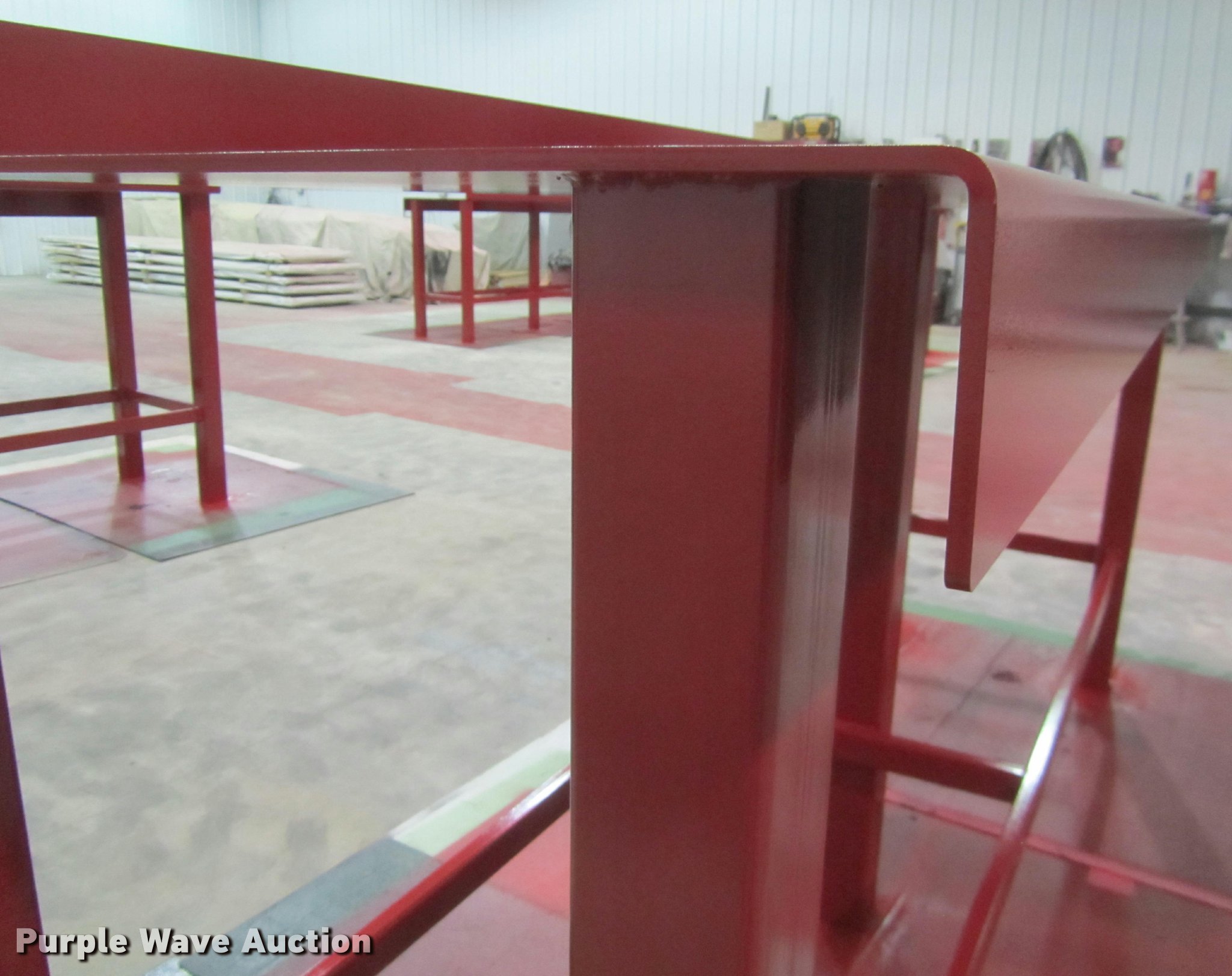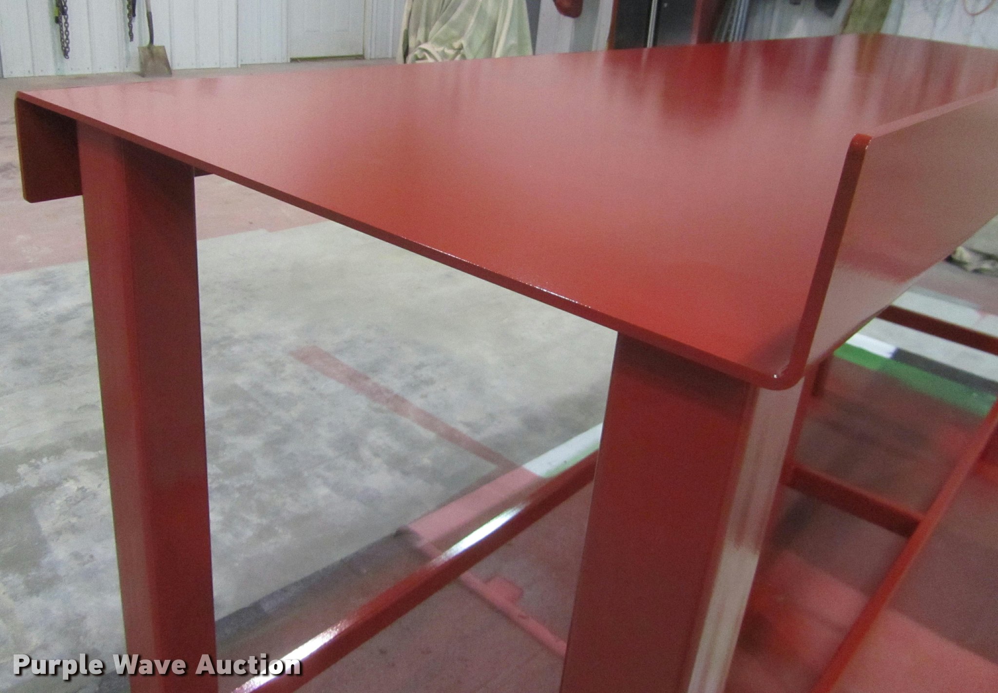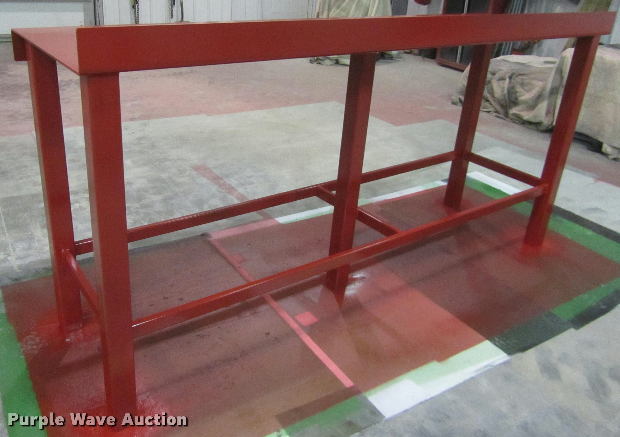 Purple Wave is selling a used Tools in Nebraska. This item is a Kush Manufaturing work bench with the following: 8'L x 28" depth/width, 44" table top height, 4" back splash and front rub, 11,000 lbs, Sandblasted, Two part urethane paint, 1/4" thick bench top, 3" square tube, 11 gauge, Heavy duty legs, Color: Farmall Red, All USA steel, full weld, Unused, Stored inside
