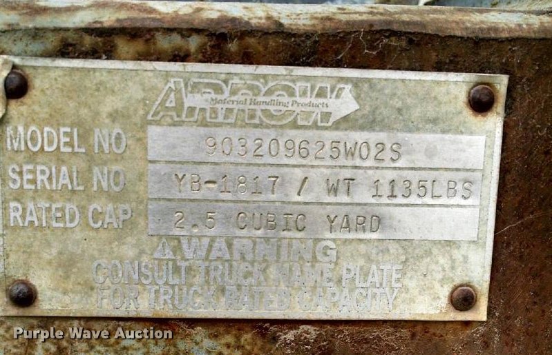 Purple Wave is selling a used Telehandler in Kansas. This item is a Arrow telehandler bucket with the following: Model 903209625W02S, 96"W x 41"H, 2.5 cu. yd. capacity, Serial YB-1817/WT1135LBS