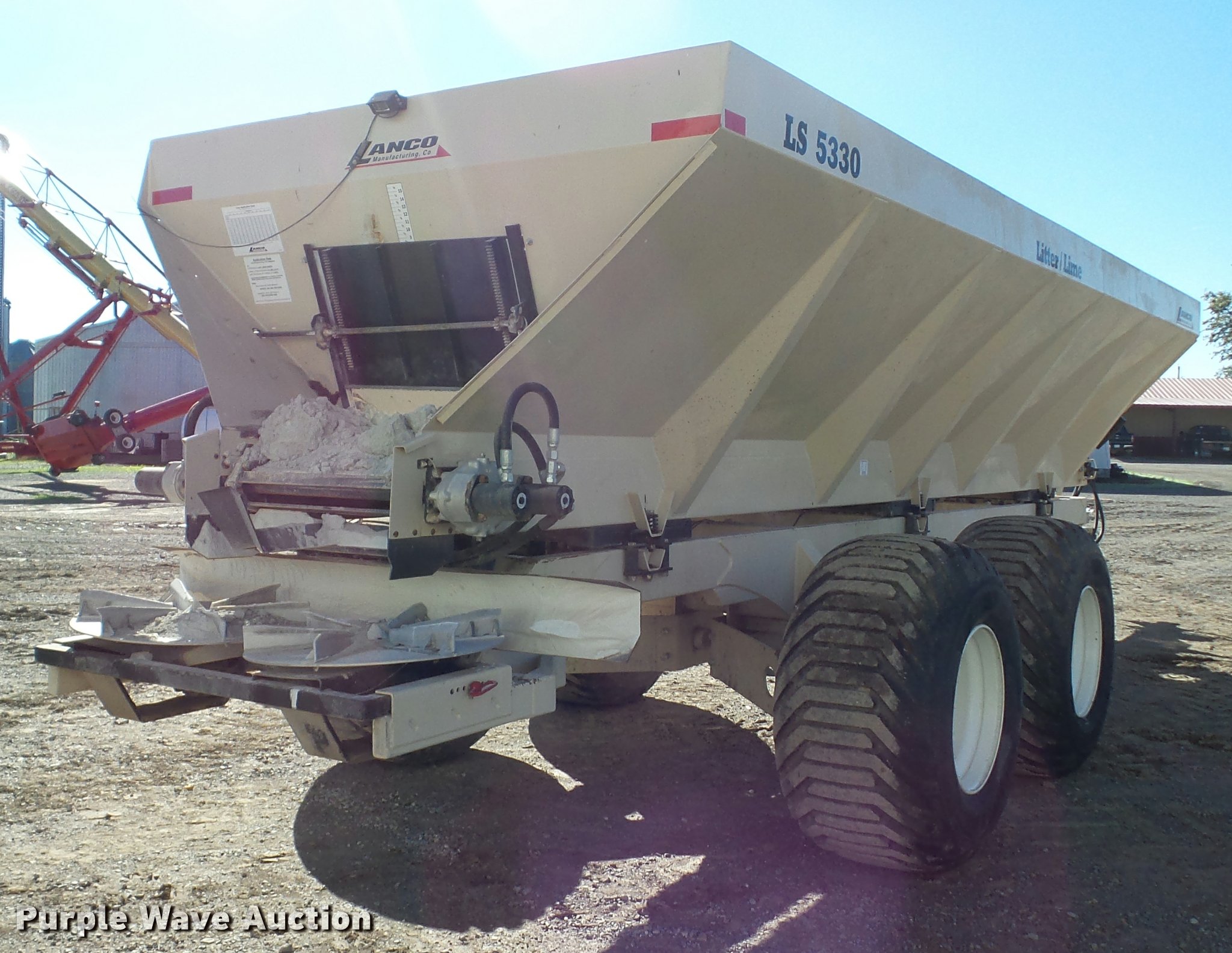 Purple Wave is selling a used Manure Spreader in Kansas. This item is a 2012 Lanco LS5330 manure/lime spreader with the following: 25'L, 32"W chain, Hydraulic drive spinners and chain, Rear camera, Digi-Star NT460 digital scale, Pin hitch, 600-50-22.5 tires, Serial 643
