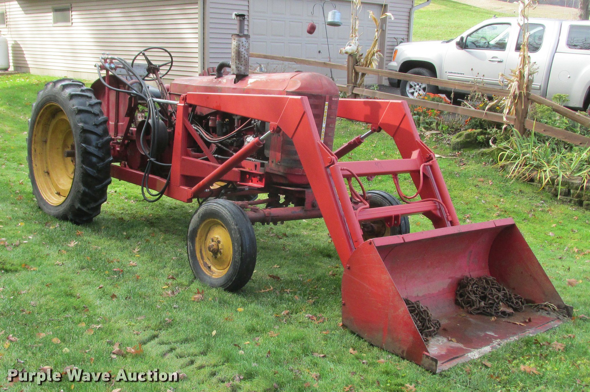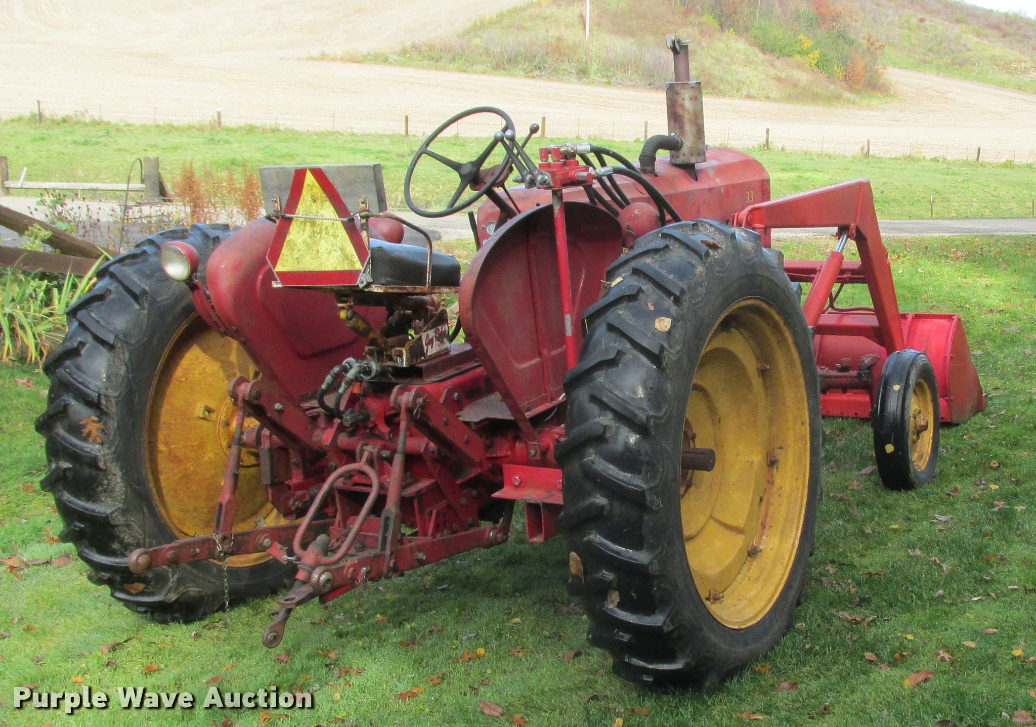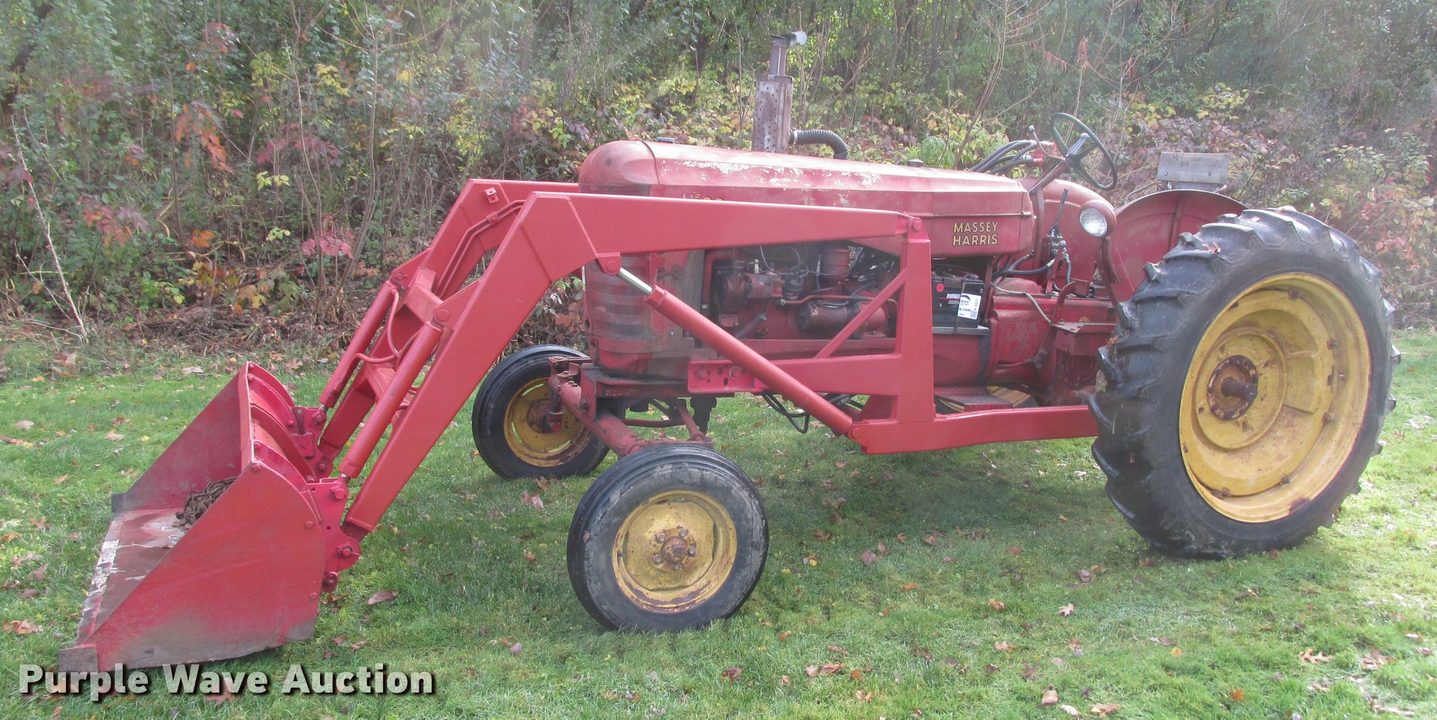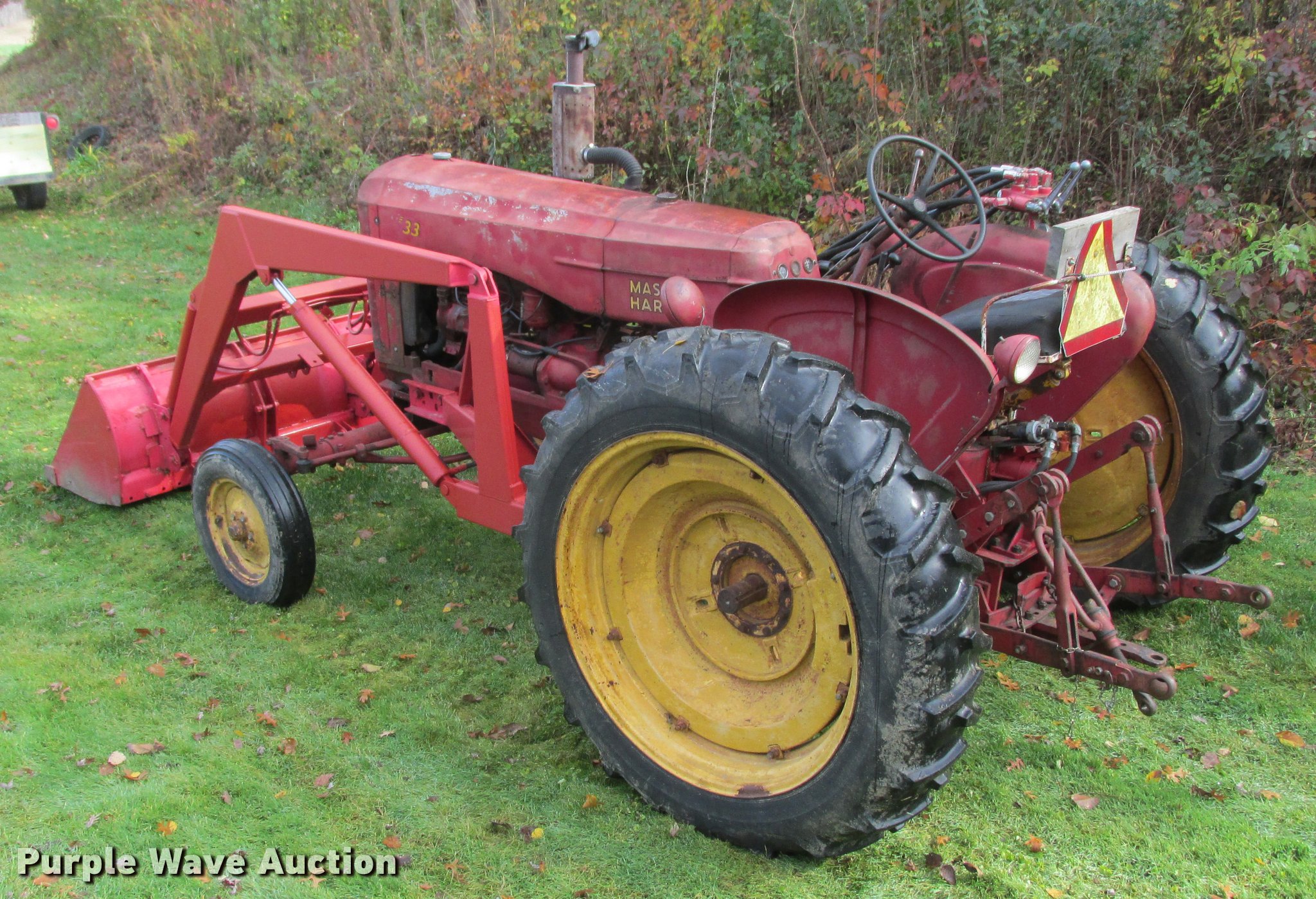 Purple Wave is selling a used Tractor in Wisconsin. This item is a 1953 Massey-Harris 33 tractor with the following: Four cylinder gas engine, 33 HP, Manual transmission, 5F-1R gears, Differential lock, Suspension seat, Power steering, Loader, 65"W bucket, Weld-on cutting edge, Two-lever controls, Three point, 540 PTO, Draw bar, Rear hydraulic remote sets, 5.50-15 front tires, Adjustable front tires, 12.4-38 rear tires, Tire chains, Manual