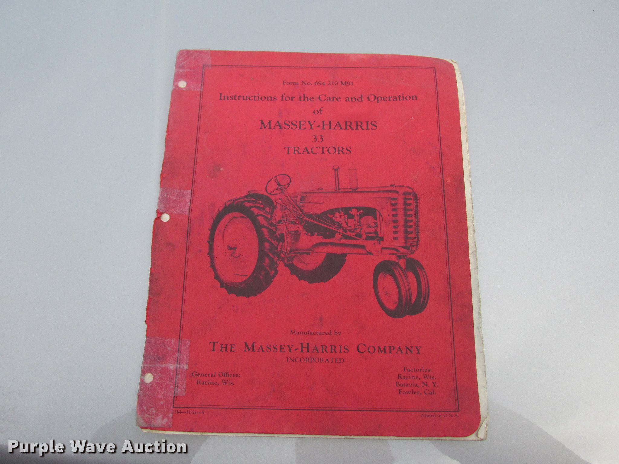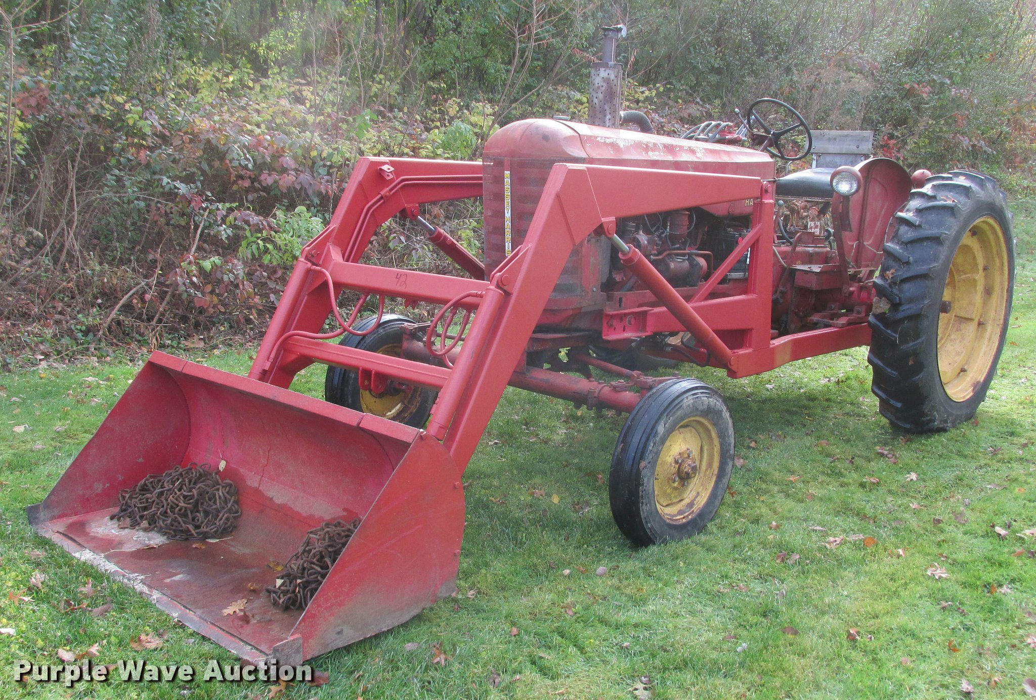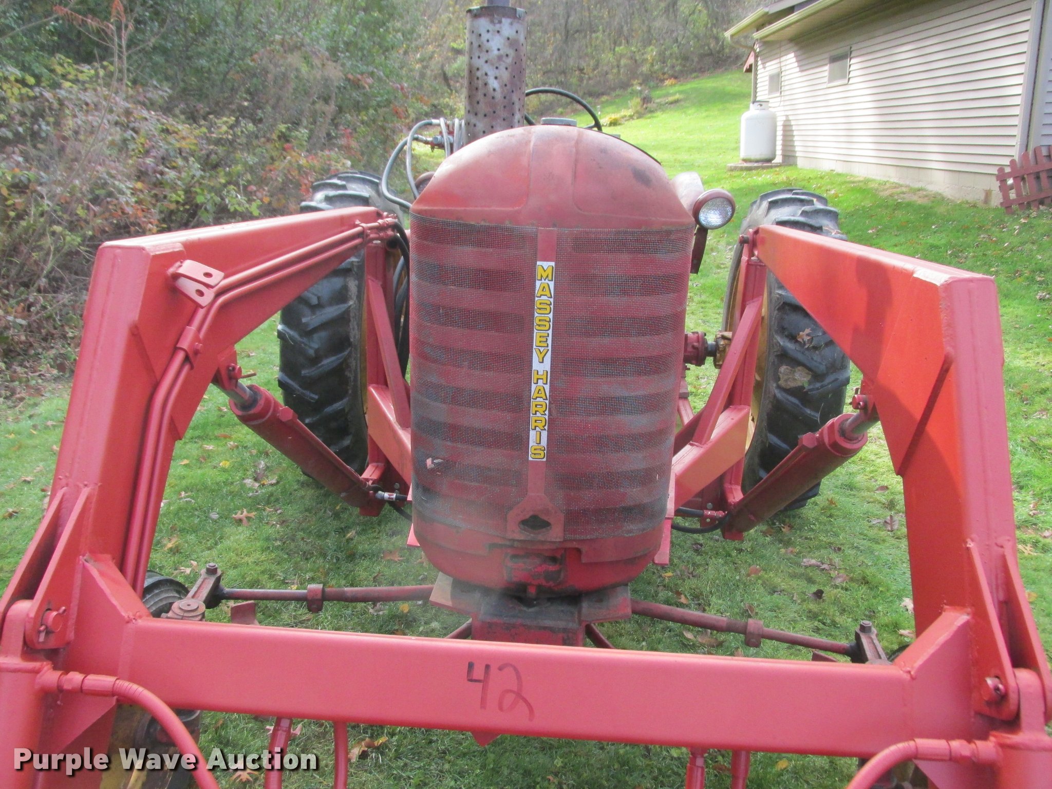 Purple Wave is selling a used Tractor in Wisconsin. This item is a 1953 Massey-Harris 33 tractor with the following: Four cylinder gas engine, 33 HP, Manual transmission, 5F-1R gears, Differential lock, Suspension seat, Power steering, Loader, 65"W bucket, Weld-on cutting edge, Two-lever controls, Three point, 540 PTO, Draw bar, Rear hydraulic remote sets, 5.50-15 front tires, Adjustable front tires, 12.4-38 rear tires, Tire chains, Manual