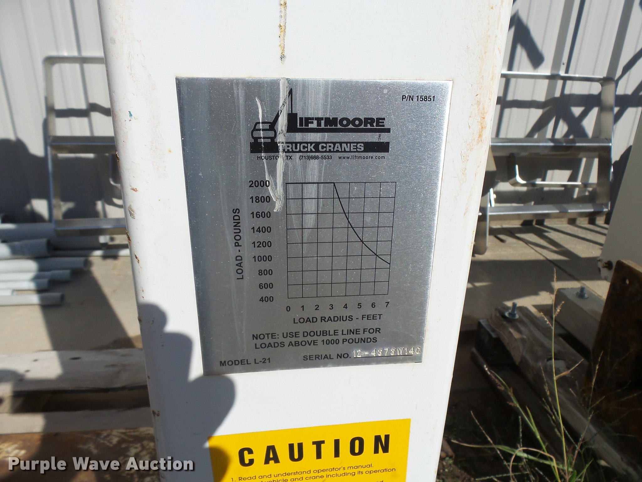 Purple Wave is selling a used Truck Part and Attach. in Kansas. This item is a Liftmoore L21 truck crane with the following: 4' boom length, Extendable, 2,000 lbs capacity, Controls, Serial 12-4373W140