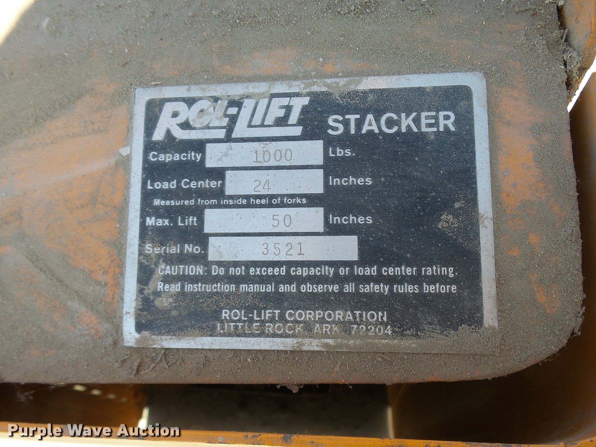 Rol-lift stacker. Electric operation, 1,000 lbs capacity, 24" load center, 50" lift height, 30" forks, Serial 3521. Belles & Associates Retirement. 2148 S Hoover Rd. Wichita, KS 67277