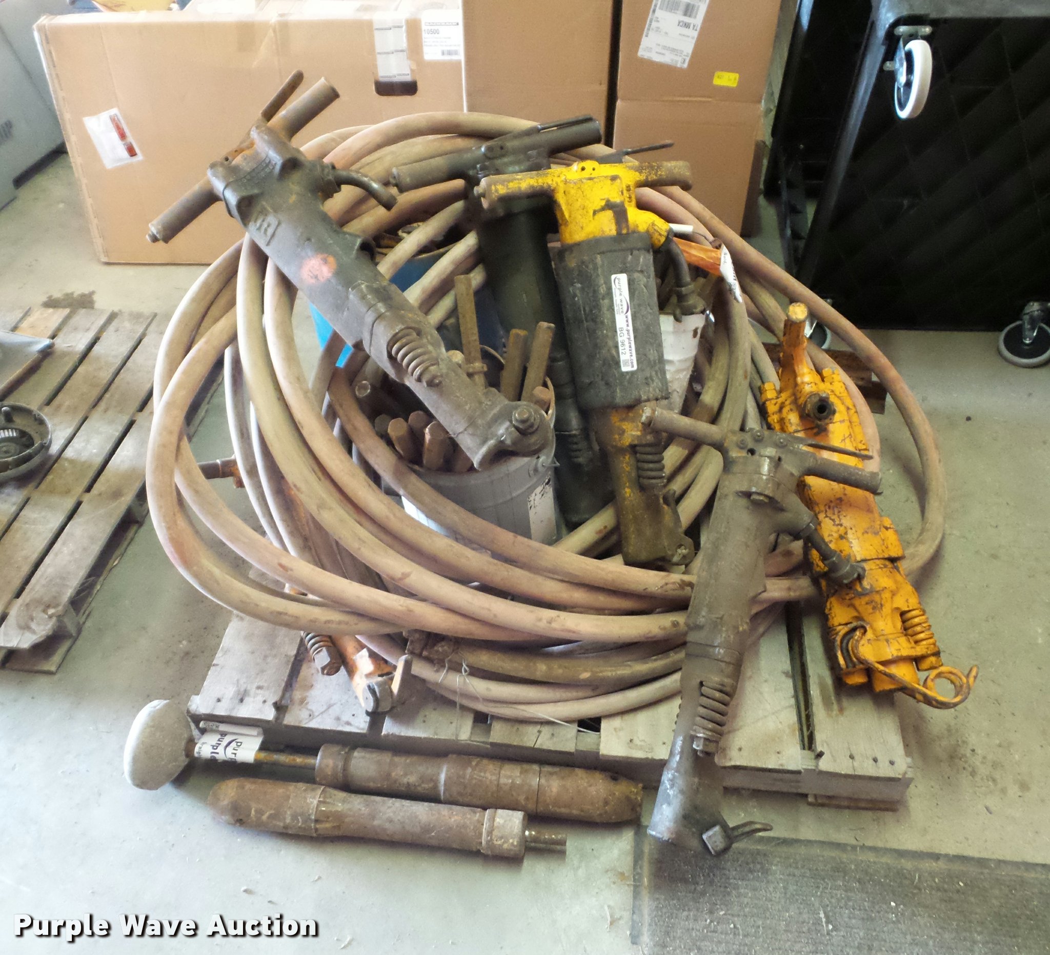 Purple Wave is selling a used Tools in Missouri. This item is a Pneumatic jack hammers with the following: Air hose, Various bits, Unknown operating condition