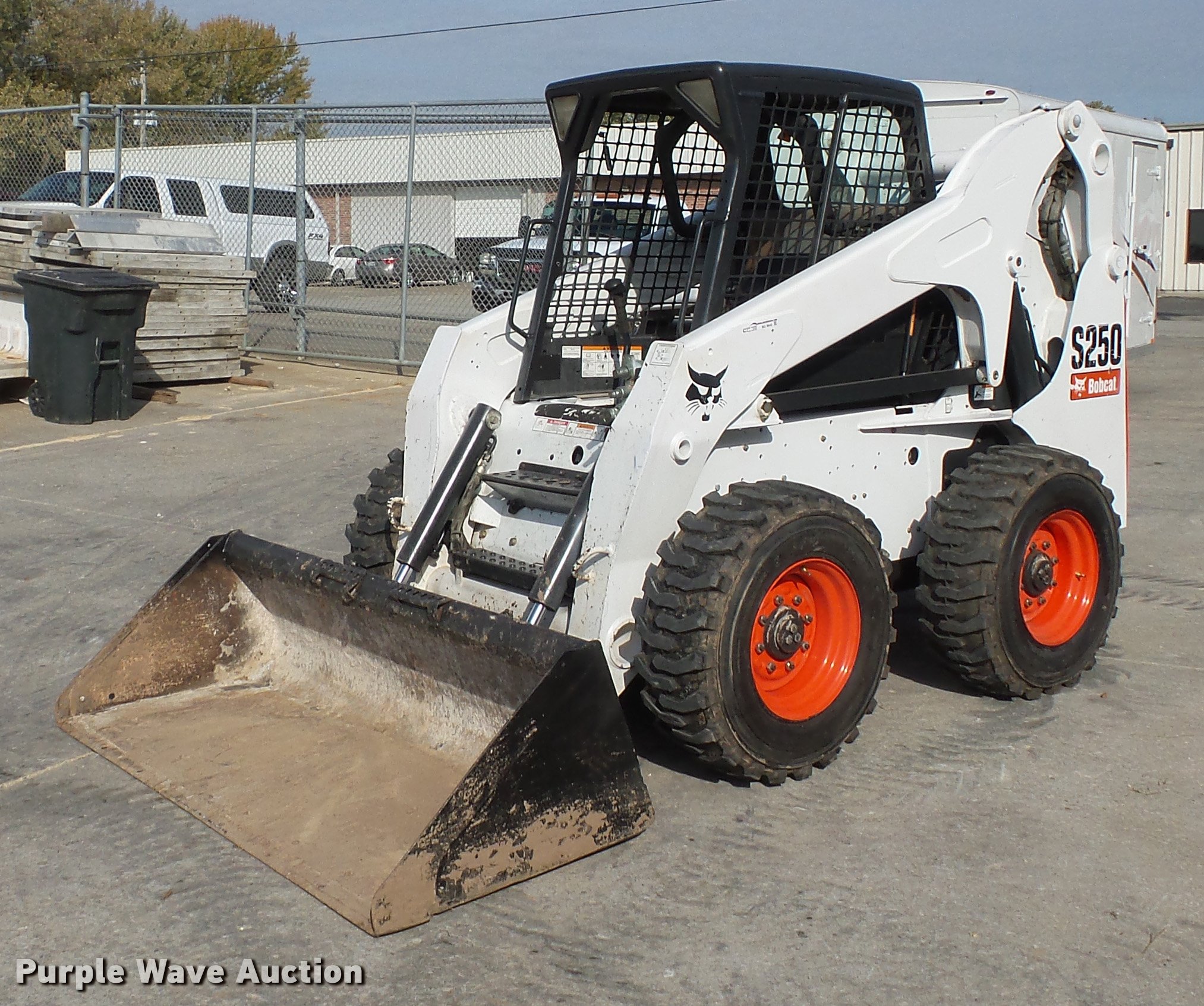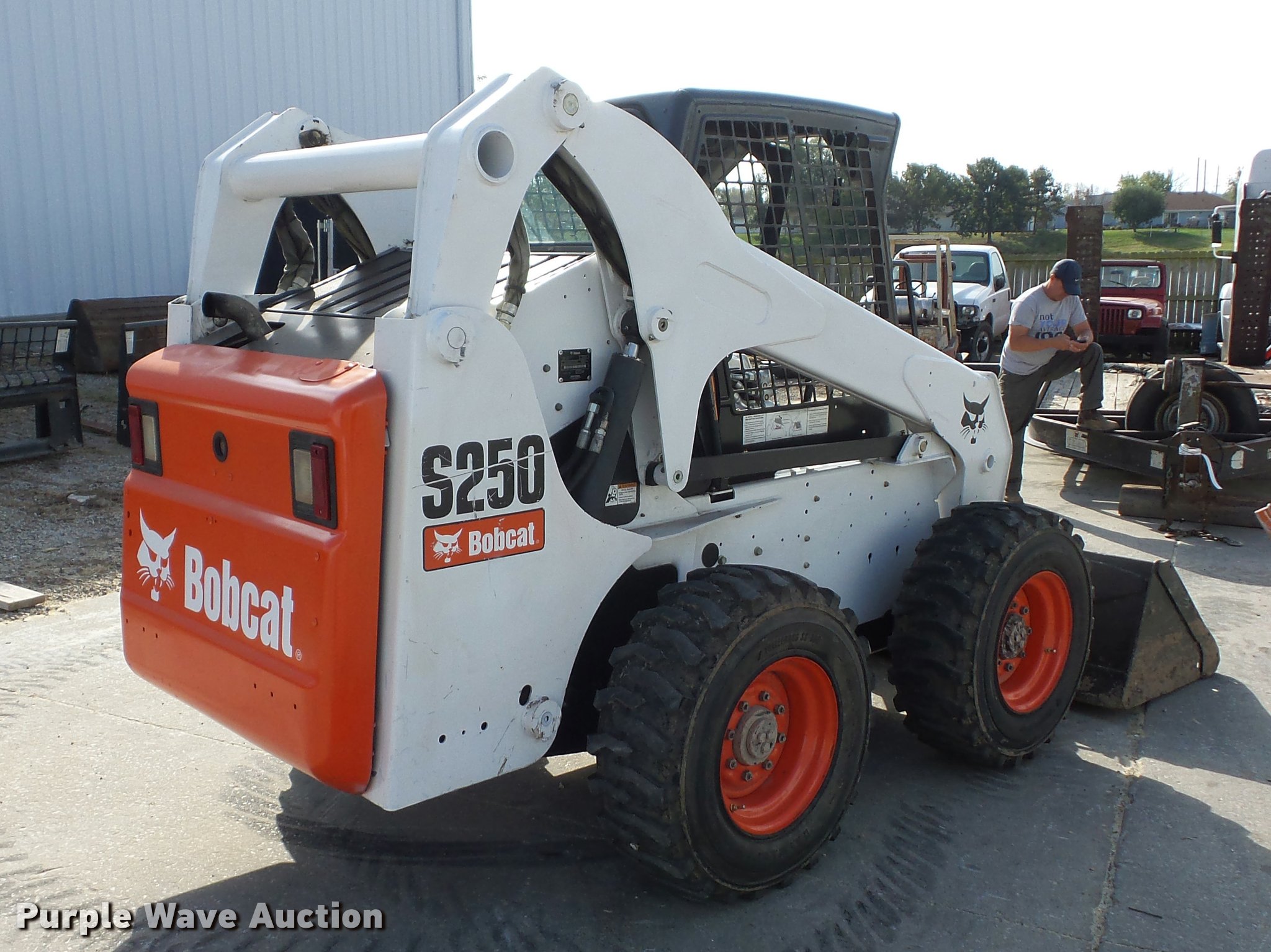 Purple Wave is selling a used Skid Steer Loader in Missouri. This item is a 2011 Bobcat S250 skid steer with the following: 895 hours on meter, Four cylinder diesel engine, Hydrostatic transmission, EROPS, Hand and foot controls, Front and rear work lights, Auxiliary hydraulics, 74"W bucket, 12-16.5 tires, Serial A5GM37606
