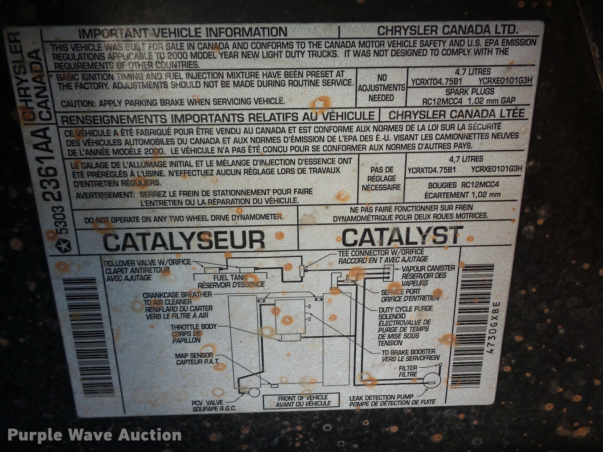 Purple Wave is selling a used Passenger Vehicle in Kansas. This item is a 2000 Dodge Durango SUV with the following: 181,726 miles on odometer, 4.7L V8 SOHC 16V gas engine, Automatic transmission, Four wheel drive, AC and heat, Tilt, Cruise, AM/FM, Power windows, locks, and mirrors, Vinyl interior, 31x10.50-15 tires, Dead battery, Low tire, Unknown operating condition