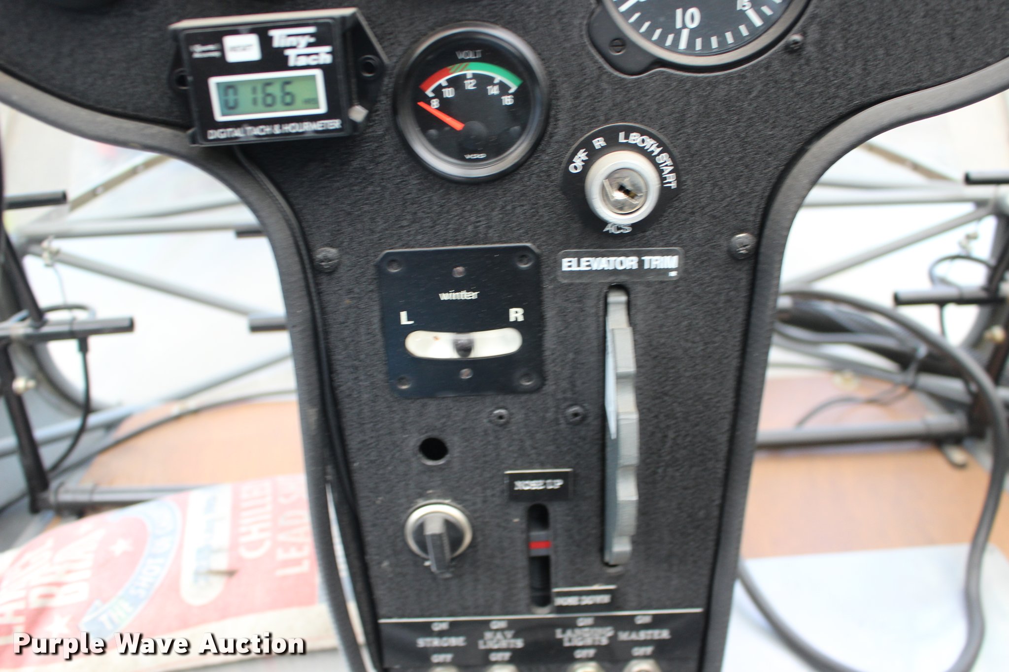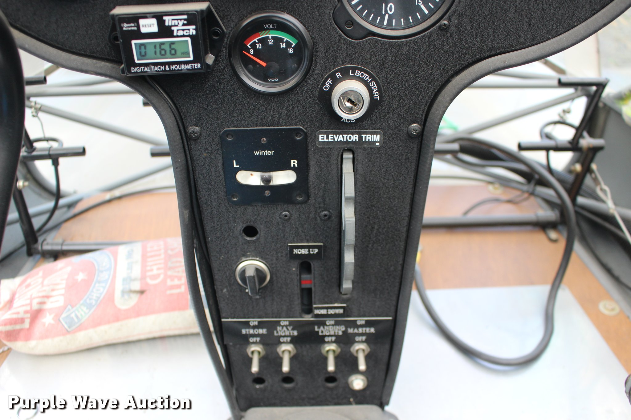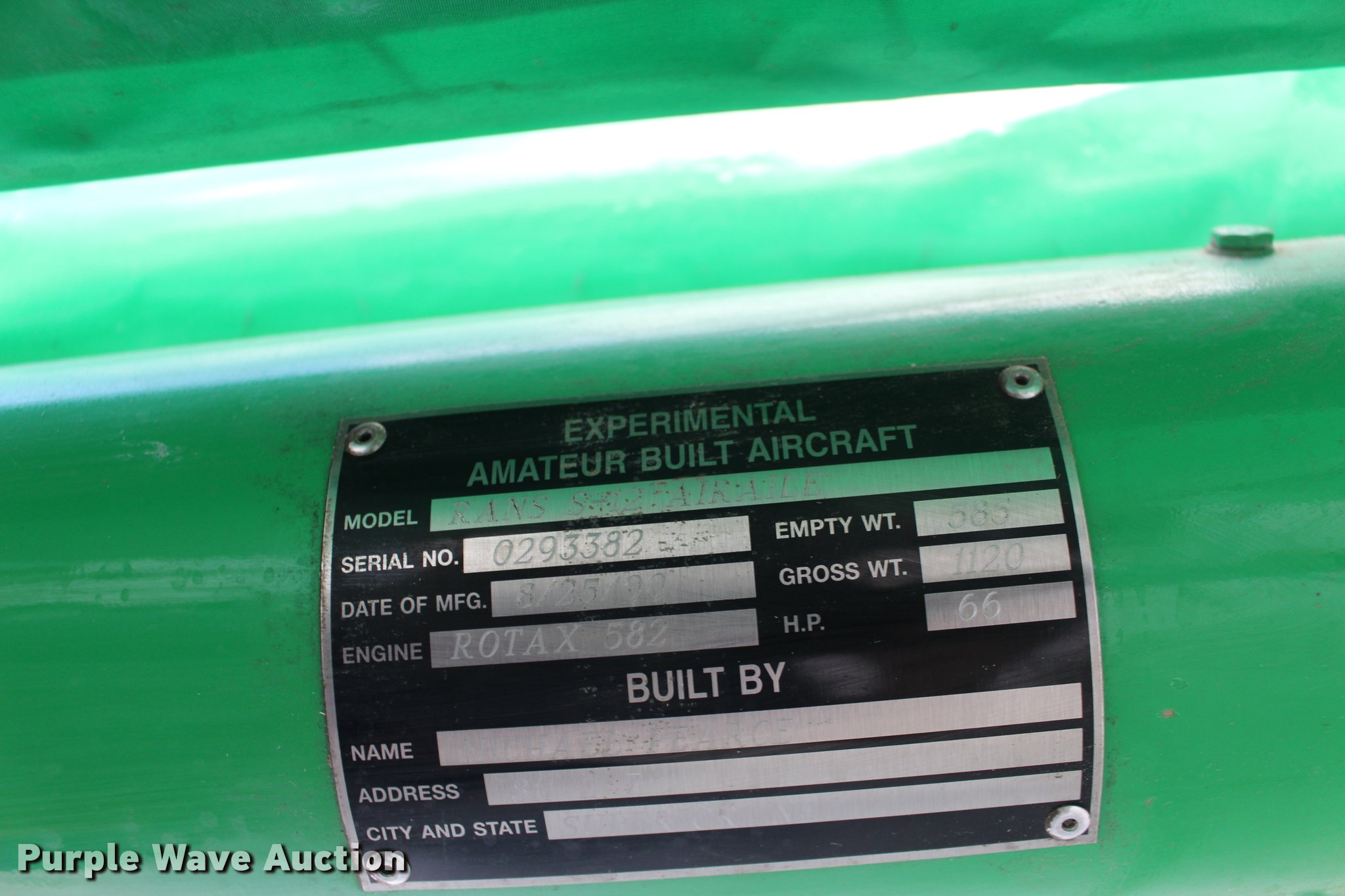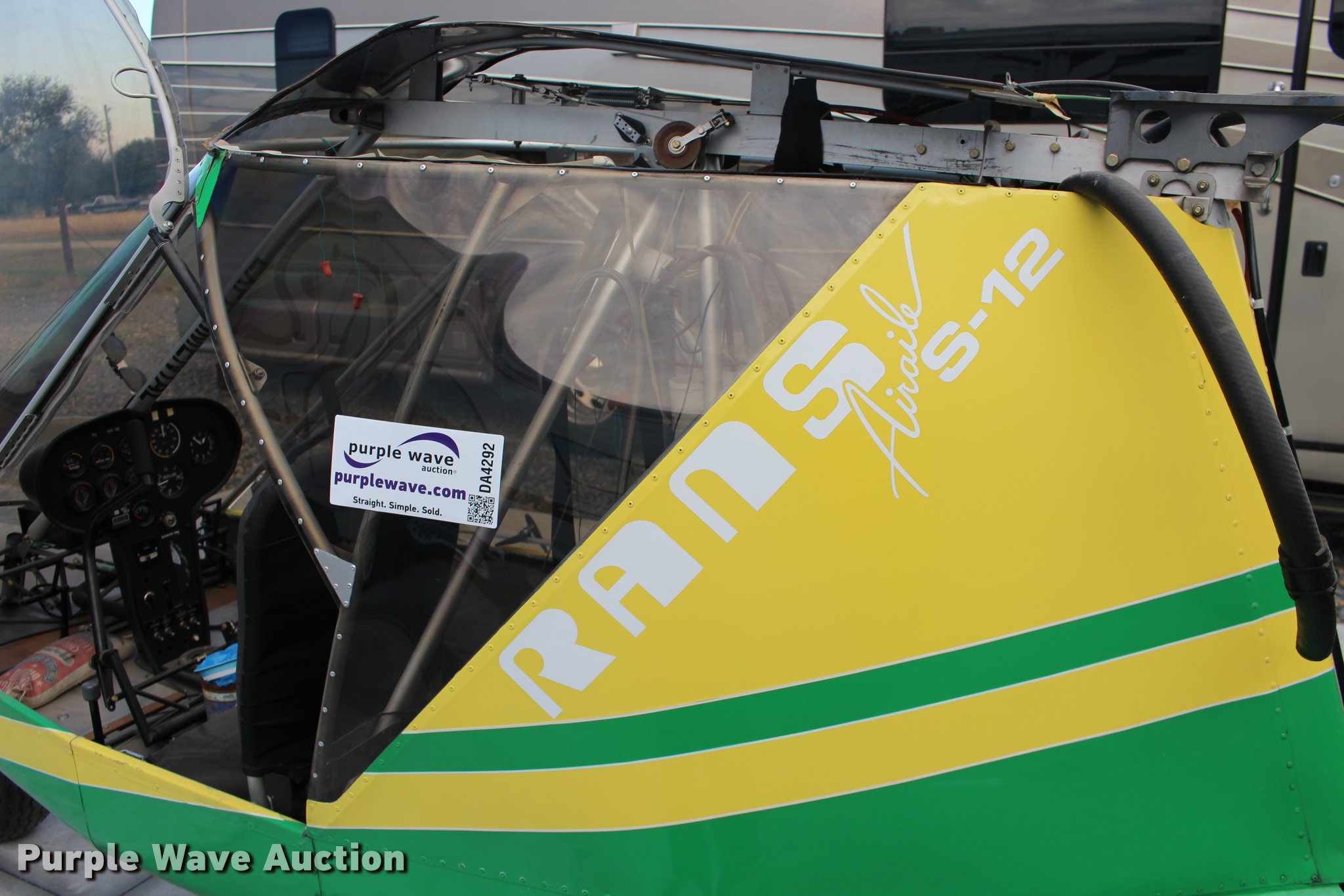 Purple Wave is selling a used Aircraft in Kansas. This item is a 2000 Rang S12 ultra light airplane with the following: 289 hours on meter, Rotax 582 engine, Enclosed cockpit, Heat, Instrument panel, Two passenger capacity, (2) fuel tanks, Trim adjustment, Warp drive prop, New style landing gear, Thunder tires, Serial 0293382