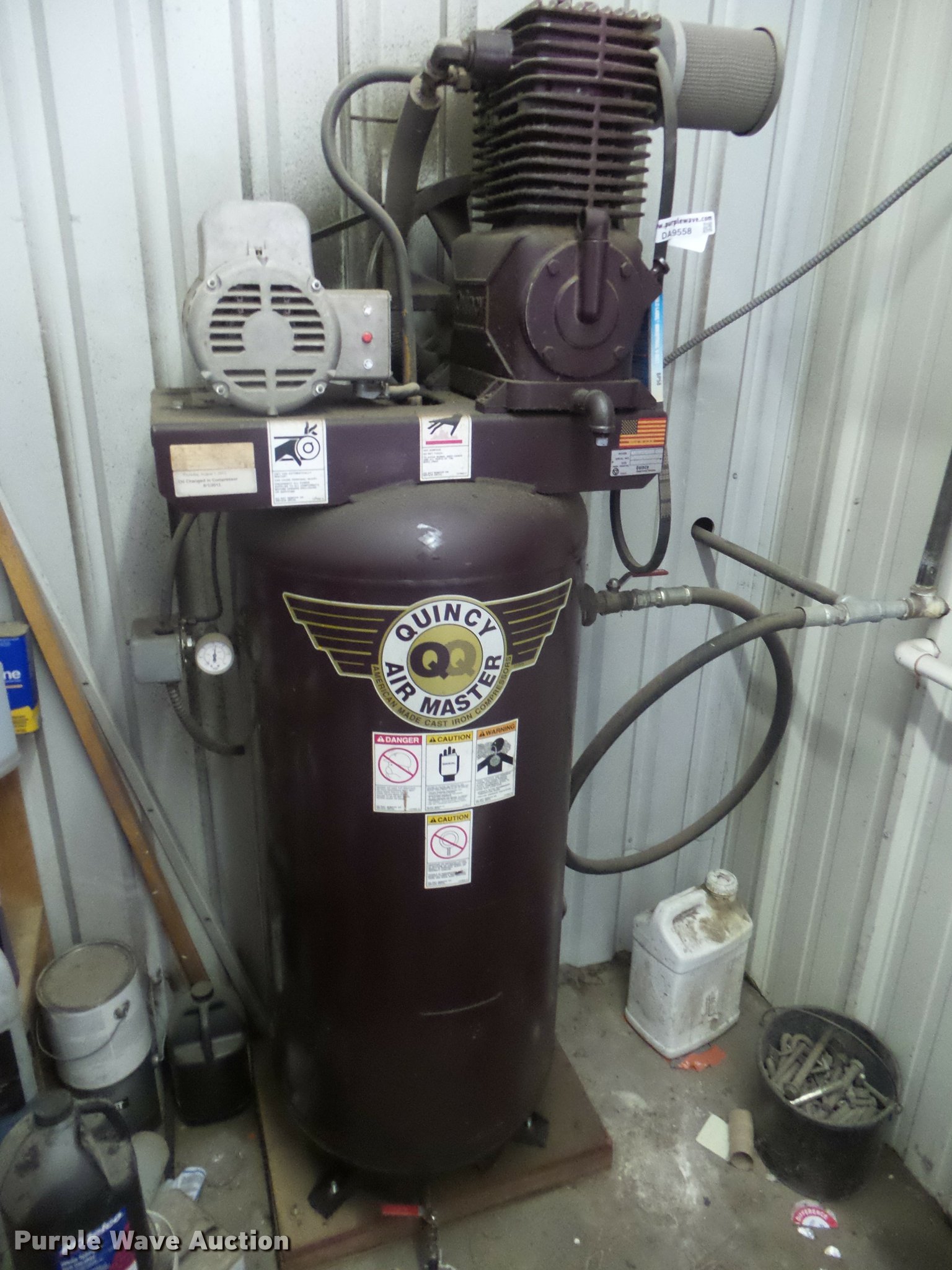 Quincy 241060VC air compressor. 5 HP, Two stage, 240V, Single phase, Cast iron head, 160 psi, 60 gallon tank, Serial 5042605. The North Shop Inc. Retirement. 330 Highway 212. Quinter, KS 67752