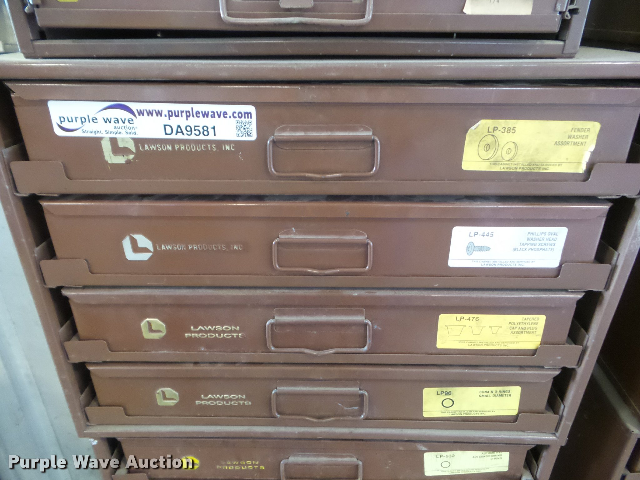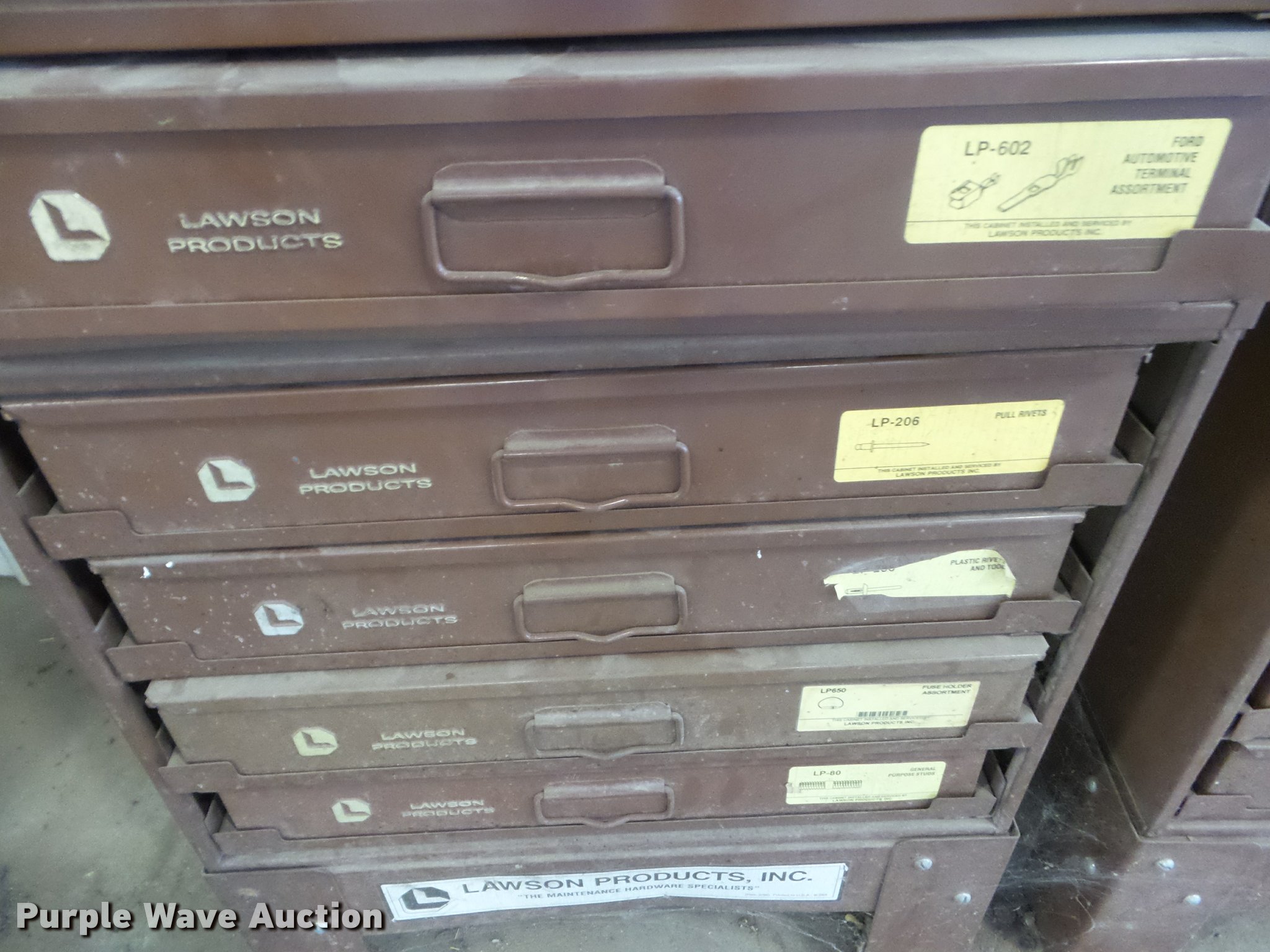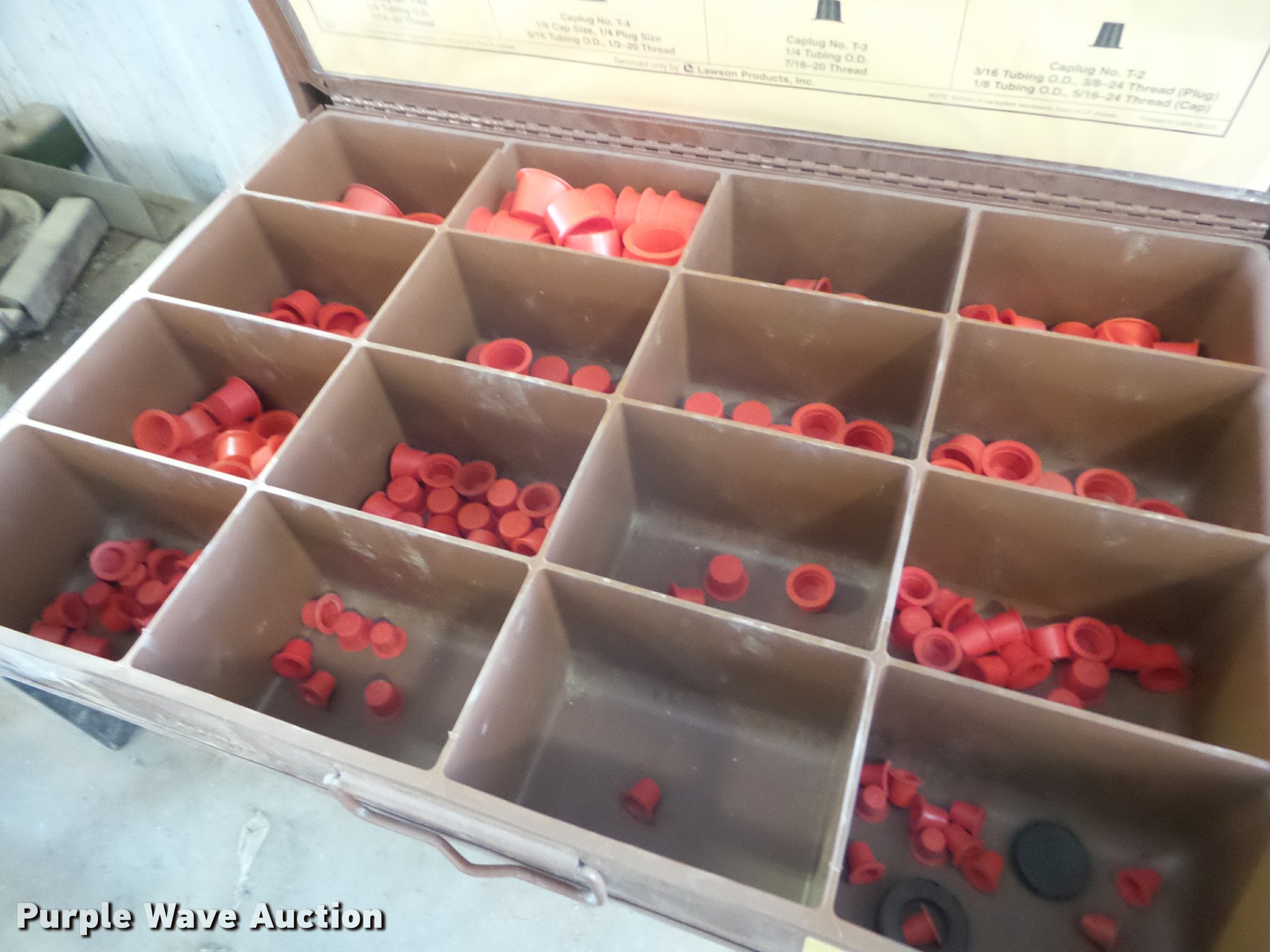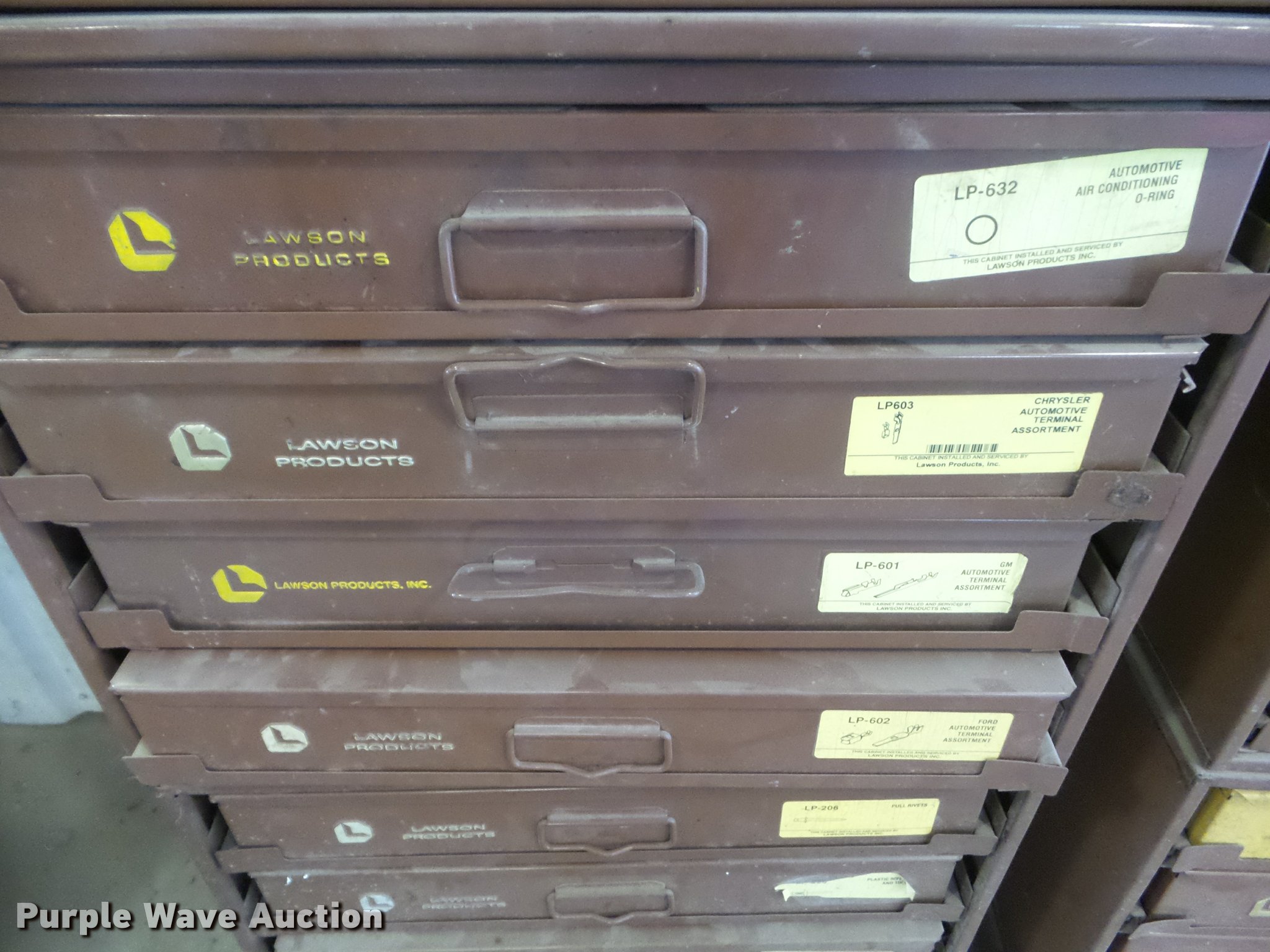 Purple Wave is selling a used Tools in Kansas. This item is a Lawson cabinet and hardware with the following: (18) drawers, O-rings, Terminal clips, Studs, Caps, Plugs, Lock nuts, Brake parts