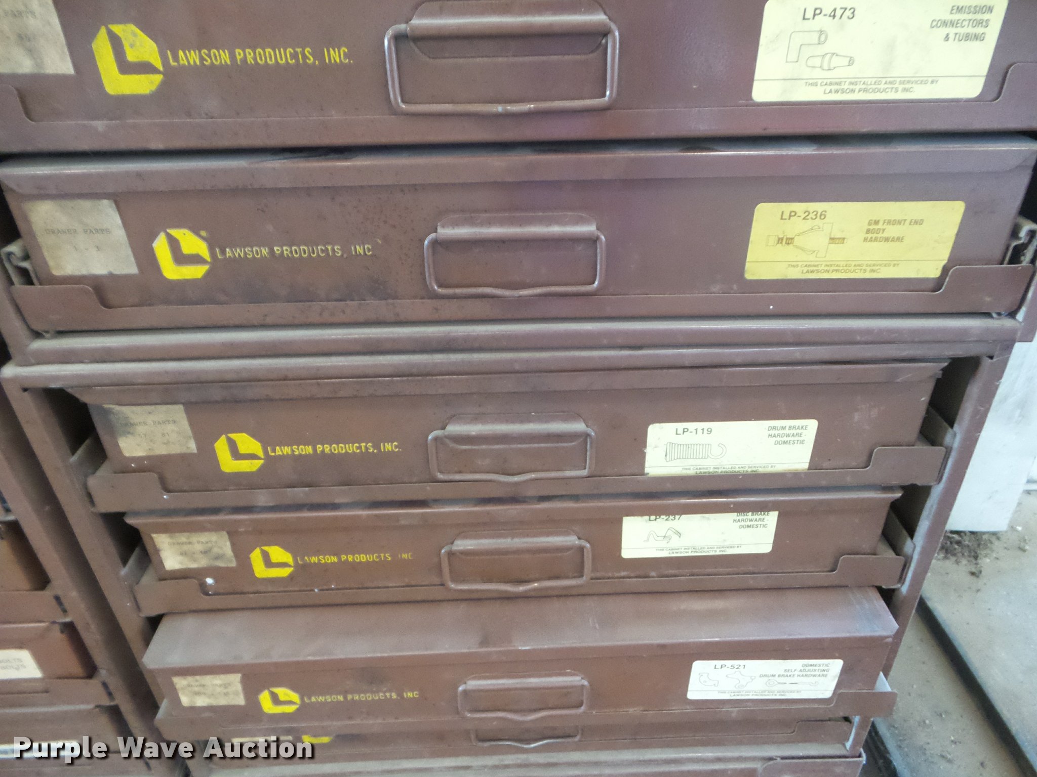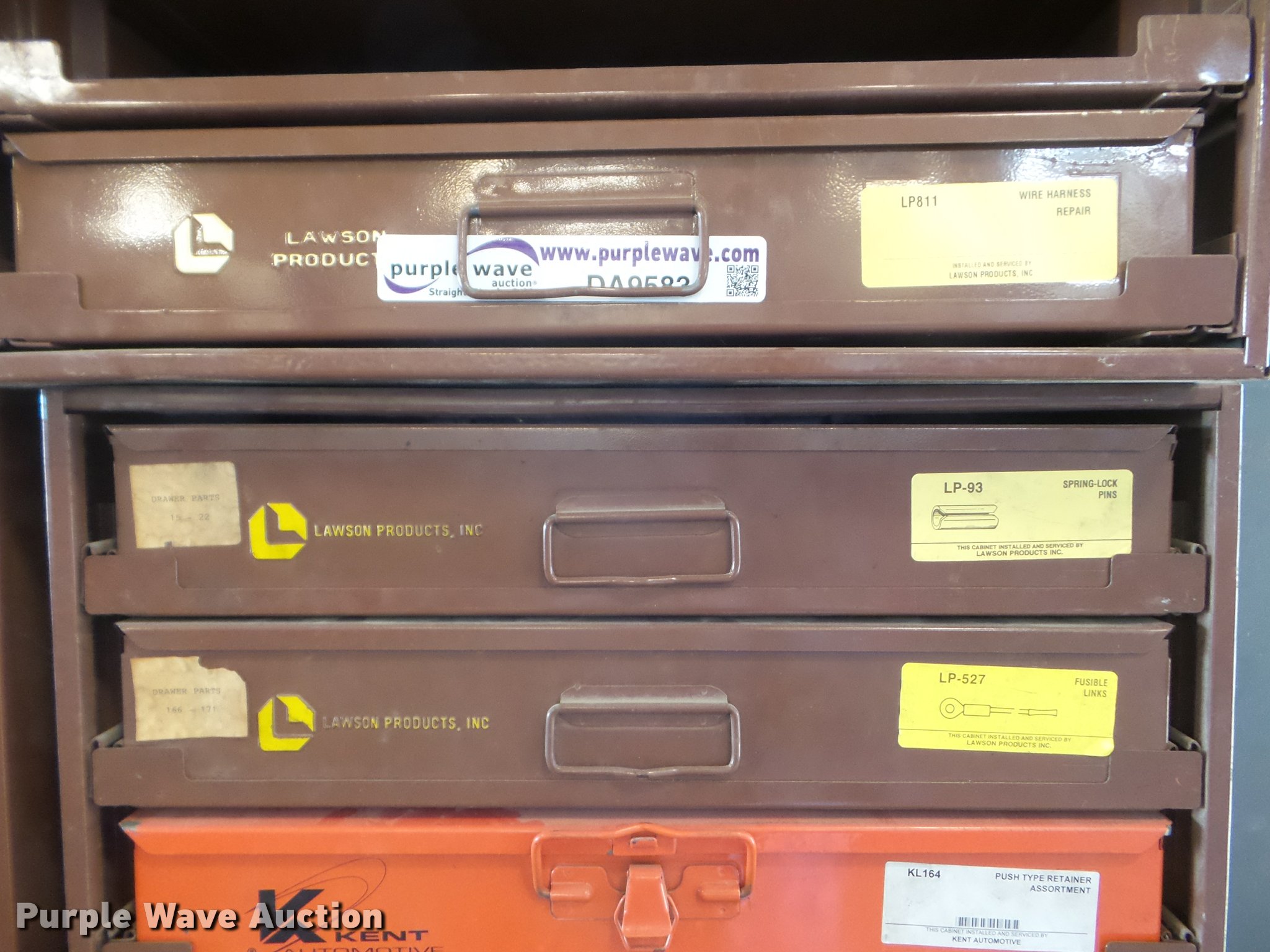 Purple Wave is selling a used Tools in Kansas. This item is a Lawson cabinet and hardware with the following: (17) drawers, Harness components, Brass fittings, Push retainers, Battery lugs, Hose connectors, Springs, Fuel line components