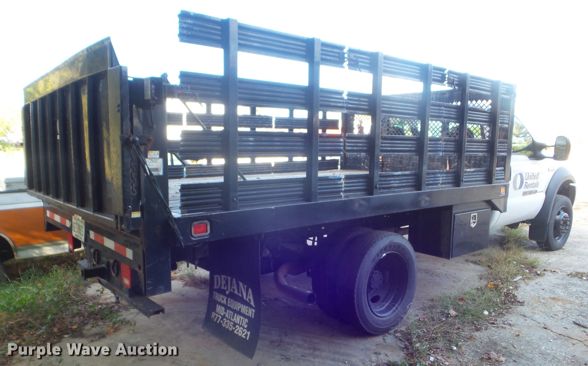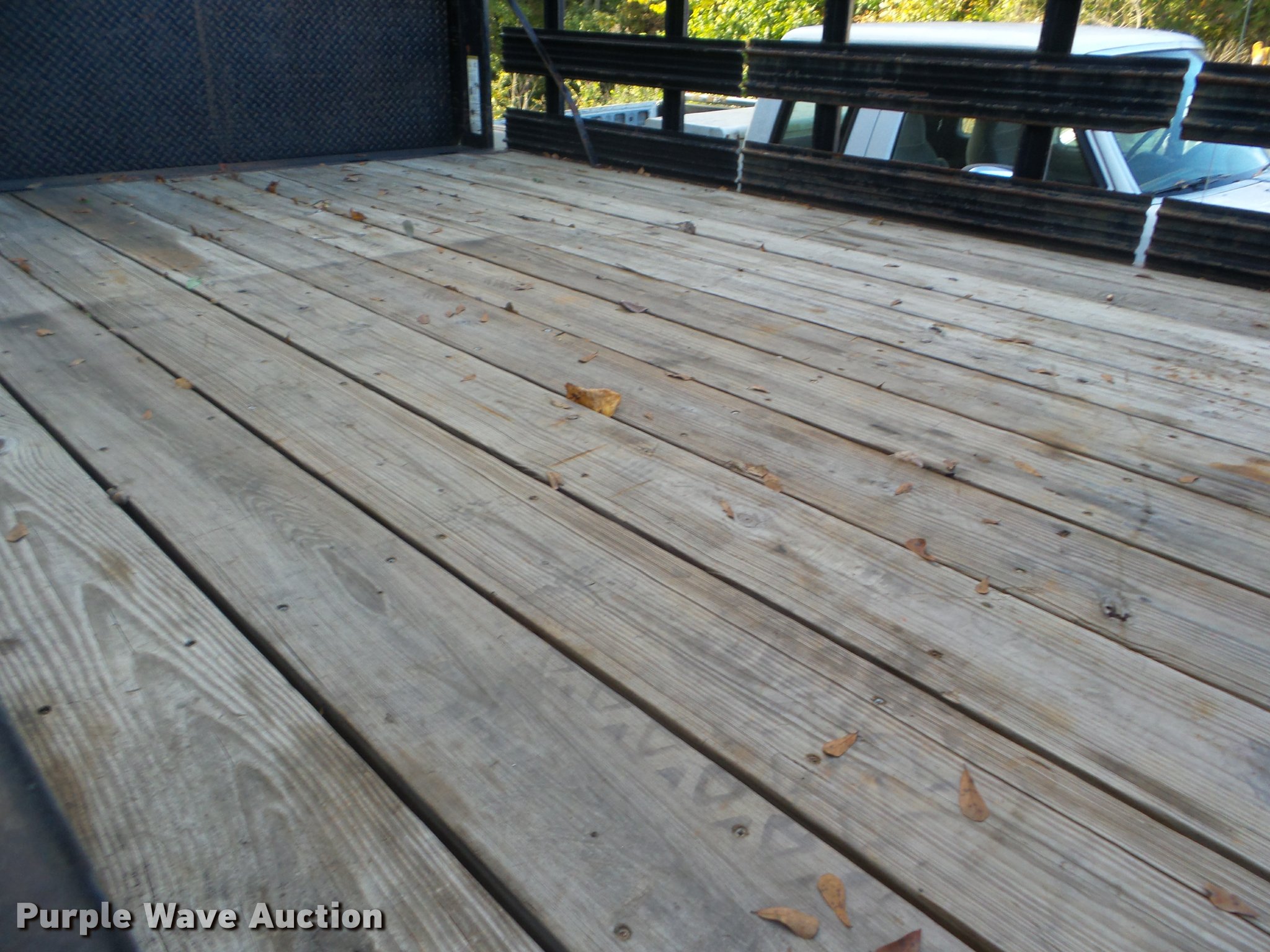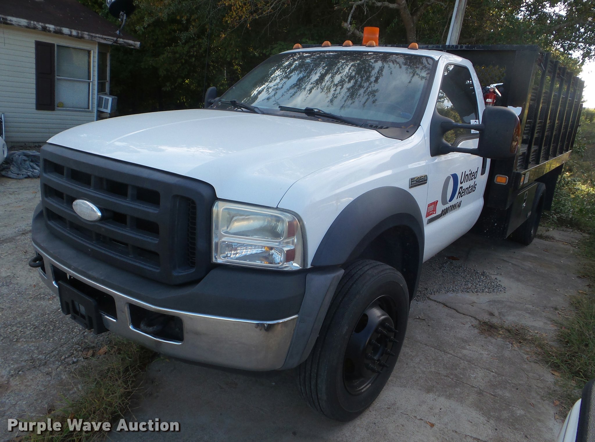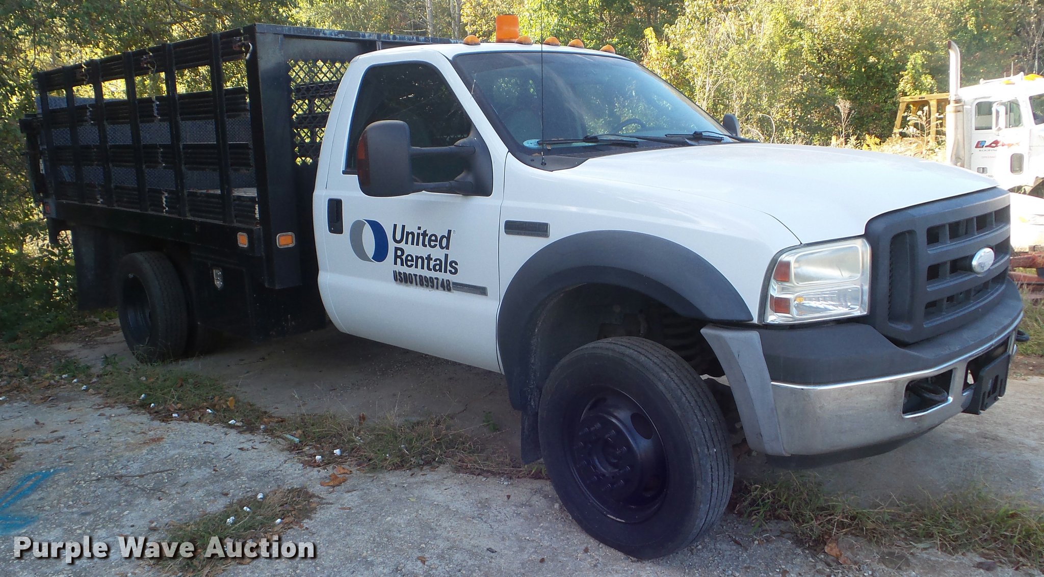 Purple Wave is selling a used Flat Bed Truck in South Carolina. This item is a 2007 Ford F450 Super Duty flatbed truck with the following: 101,669 miles on odometer, 6.0L V8 OHV 32V diesel engine, Automatic transmission, Four wheel drive, AC and heat, Tilt, Cruise, AM/FM, Power windows, locks, and mirrors, Vinyl interior, Front tow hooks, 13'L x 8'W stake side bed, 40" side height, Wood floor, Under mounted toolboxes, Tommy Gate lift end gate, Receiver hitch, 225/70R19.5 tires, Head gasket needs to be replaced, EIN 950596