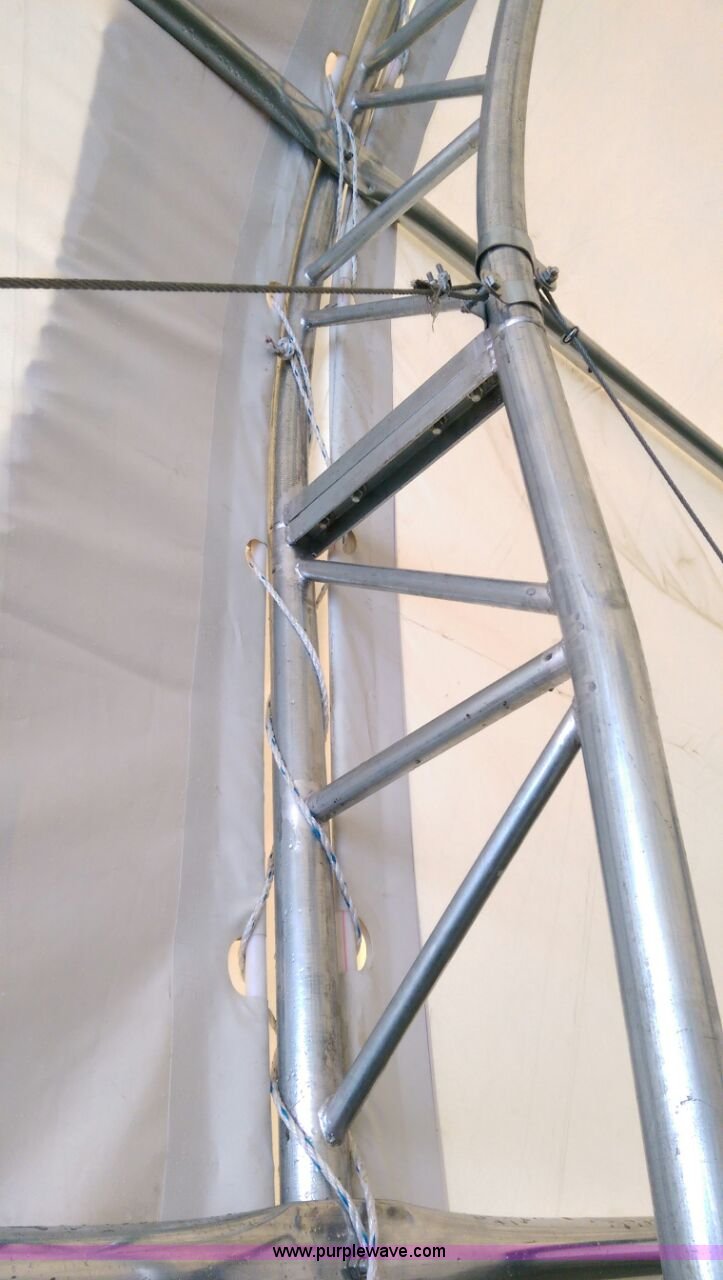 Purple Wave is selling a used Building Materials in Kansas. This item is a Premium Storage Building™ with the following: Model 50x100x23DT, 5,000 sq. ft., 18'W x 16'H doors, (2) semi hard steel/fabric track frame double doors, Steel winch, Wire tension frame bracing, Heavy double truss galvanized steel frame, Quad ratchet tension system, Basic anchoring system, UV and fire resistant fabric cover, 2.65 oz PVC rip stop fabric covering, 750 gsm, 10' arch distance, Bolt together arches, Double truss frame