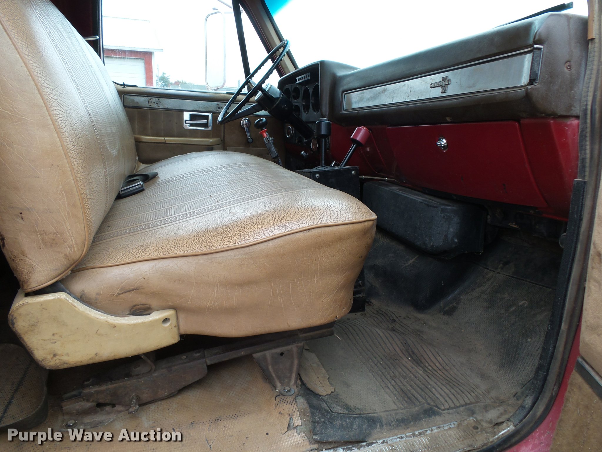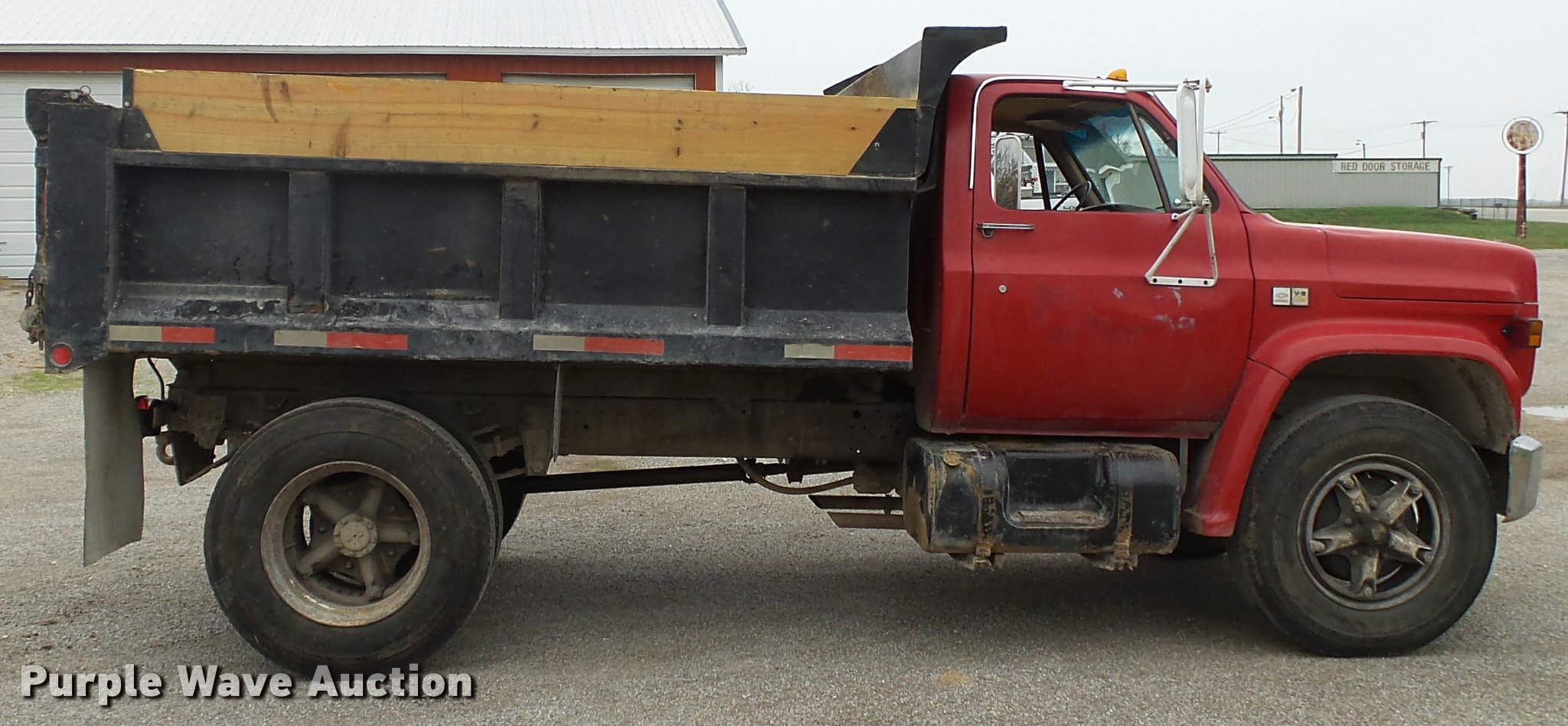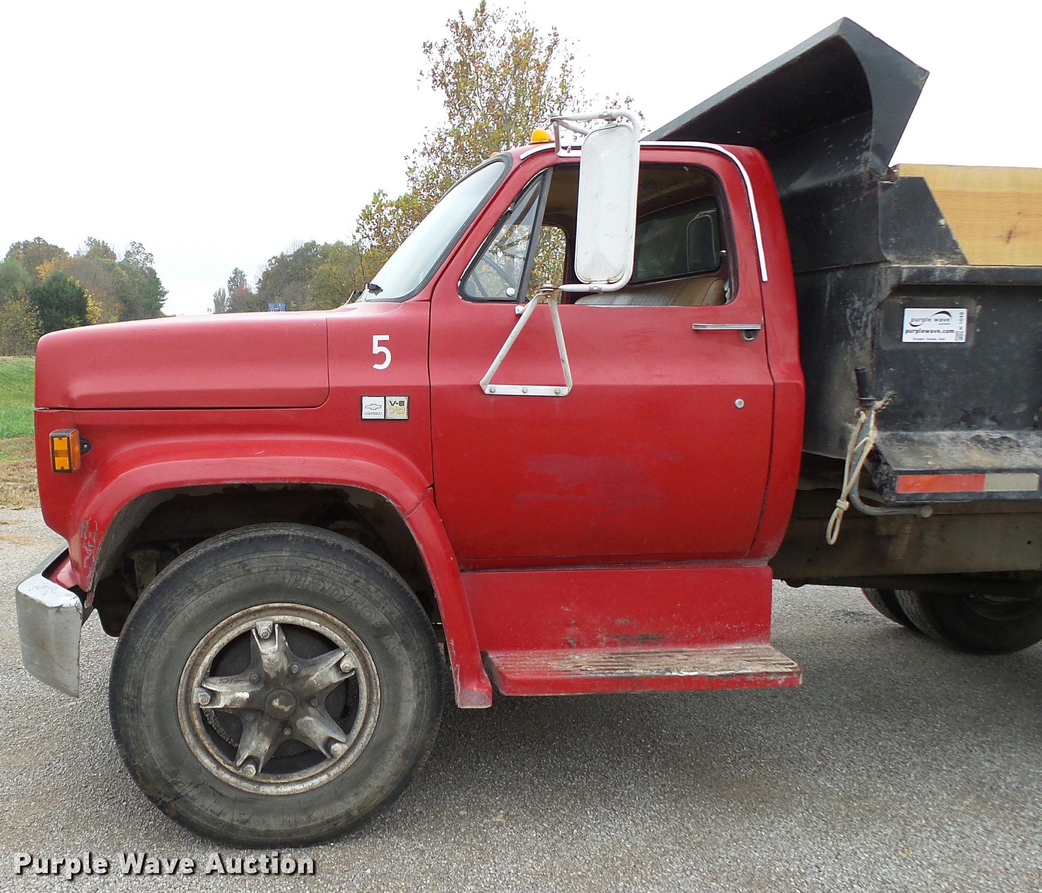Purple Wave is selling a used Construction Dump Truck in Missouri. This item is a 1982 Chevrolet C70 dump truck with the following: 86,983 miles on odometer, Eight cylinder gas engine, Model 366, Eight speed manual transmission, Single axle, Heat, AM/FM, PTO, 10'L x 96"W steel dump bed, 26" side height, 12" side board height, Manual rollover tarp, Single ram hoist, Single fuel tank, Pintle hitch, Spring suspension, Hydraulic brakes, 10R22.5 tires, GVWR 24,500 lbs, Interior stains, Unit# 5