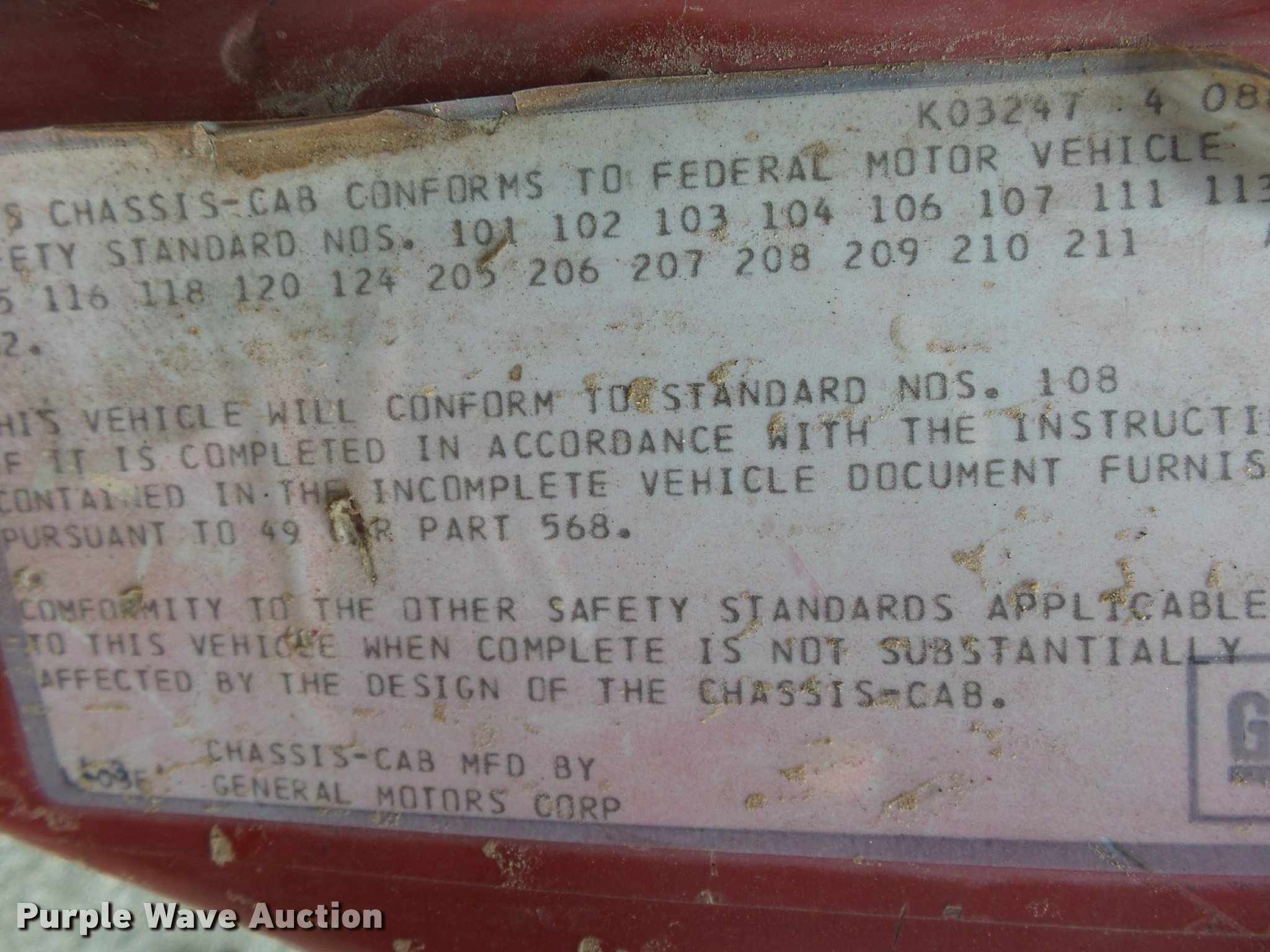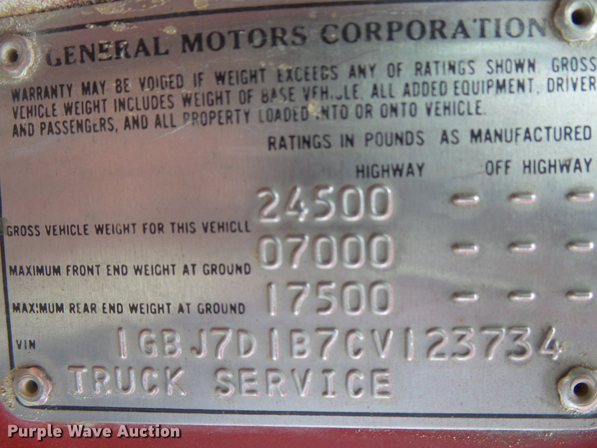 1982 Chevrolet C70 dump truck. 86,983 miles on odometer, Eight cylinder gas engine Model 366, Eight speed manual transmission, Single axle, Heat, AM/FM, PTO, 10'L x 96"W steel dump bed 26" side height, 12" side board height, Manual rollover tarp, Single ram hoist, Single fuel tank, Pintle hitch, Spring suspension, Hydraulic brakes, 10R22.5 tires, GVWR 24,500 lbs, Interior stains, Unit# 5. Missouri title. 1GBJ7D1B7CV123734. Lawrence County. 126 Dogwood Circle. Bois D'Arc, MO 65612