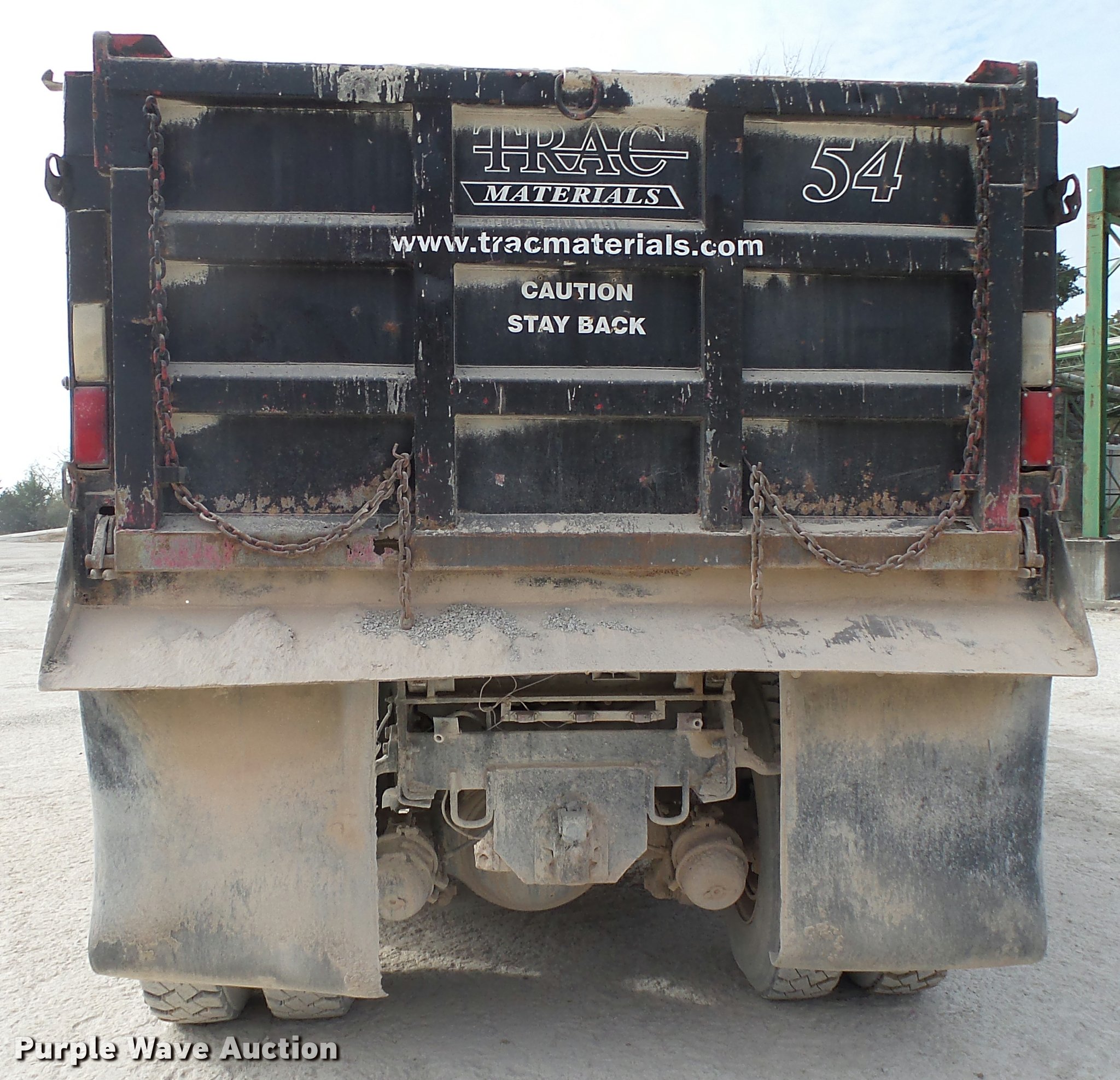 1995 Ford L9000 dump truck. 148,668 miles on odometer, 1,648 hours on meter, Cummins M11 six cylinder turbo diesel engine 280 HP, Eaton Fuller Hi-Ranger nine speed manual transmission, Tandem axle, Inter-axle differential lock, Heat, AM/FM, Suspension seat, Front mounted PTO, Gallion 502F-2 steel dump bed 13'L x 96"W, 39" side height, 12" side board height, Air operated end gate, Single ram hoist, Single fuel tank, Spring suspension, Air brakes, 385/65R22.5 front tires, 11R22.5 rear tires, FAWR 13,180 lbs, RAWR 40,000 lbs, Radio not included, Unit# 54. Missouri title. 1FDYU90V9SVA79175. Table Rock Asphalt Construction Co., Inc.. 3269 Hwy 248. Branson, MO 65616