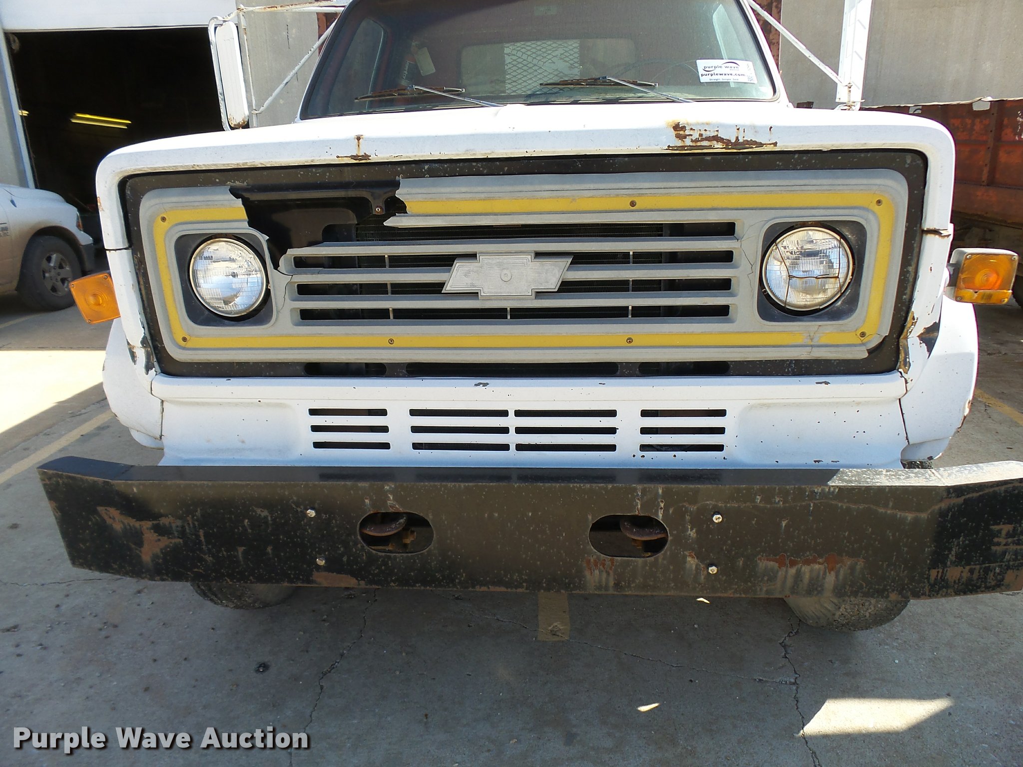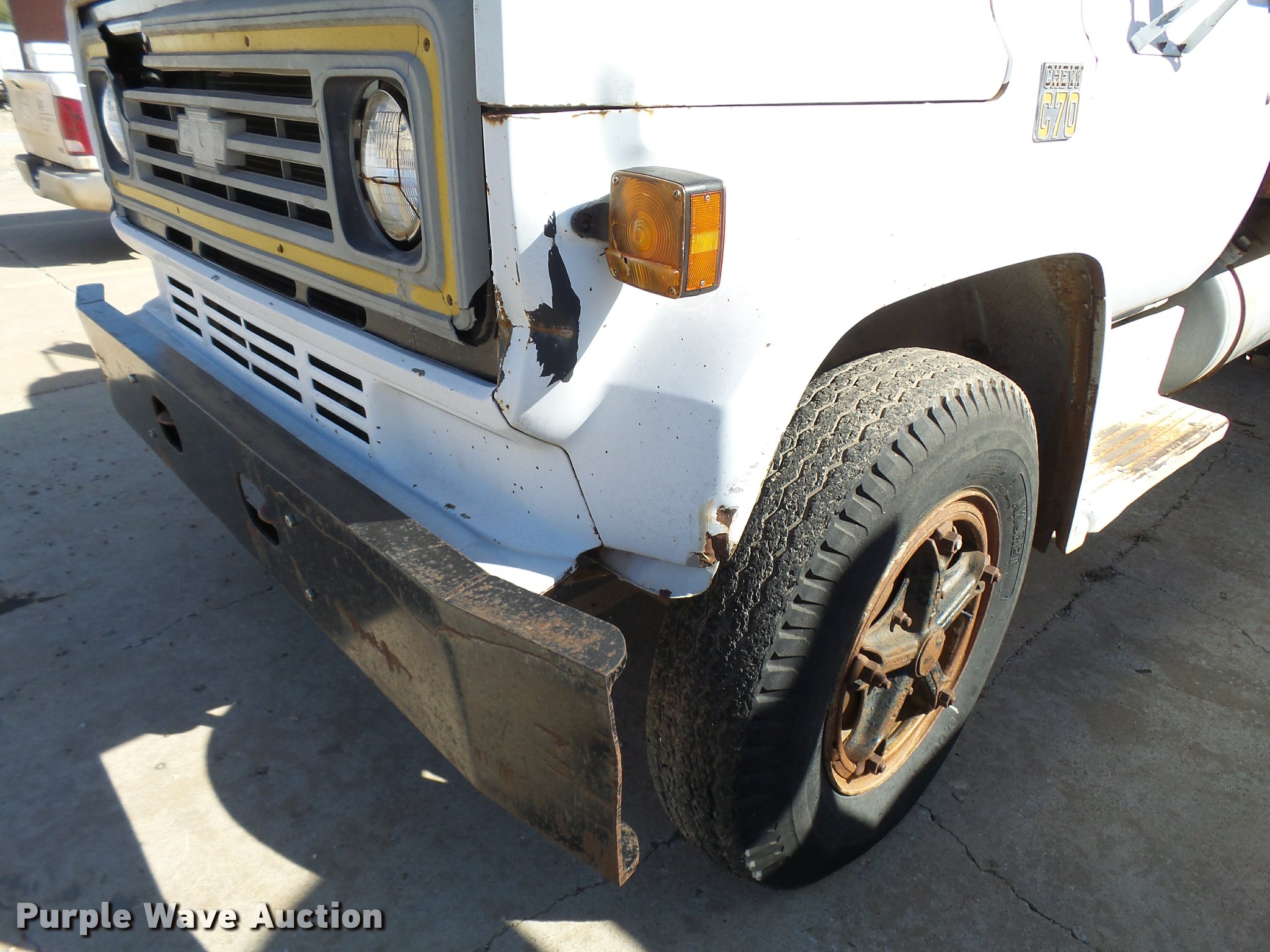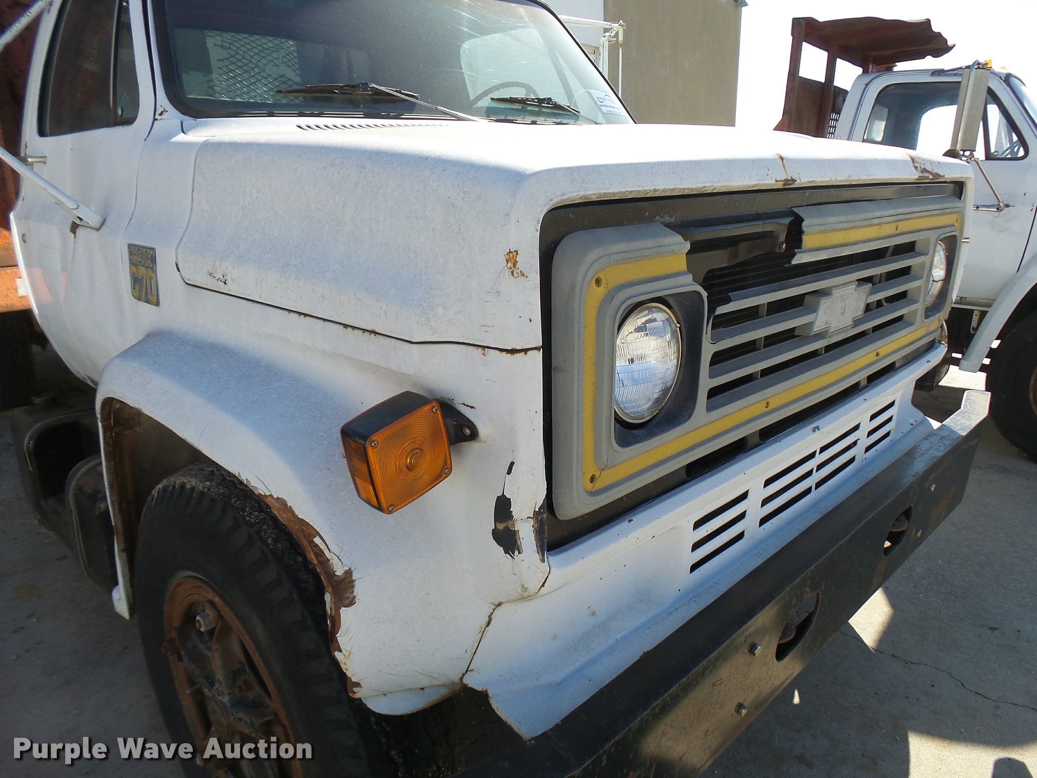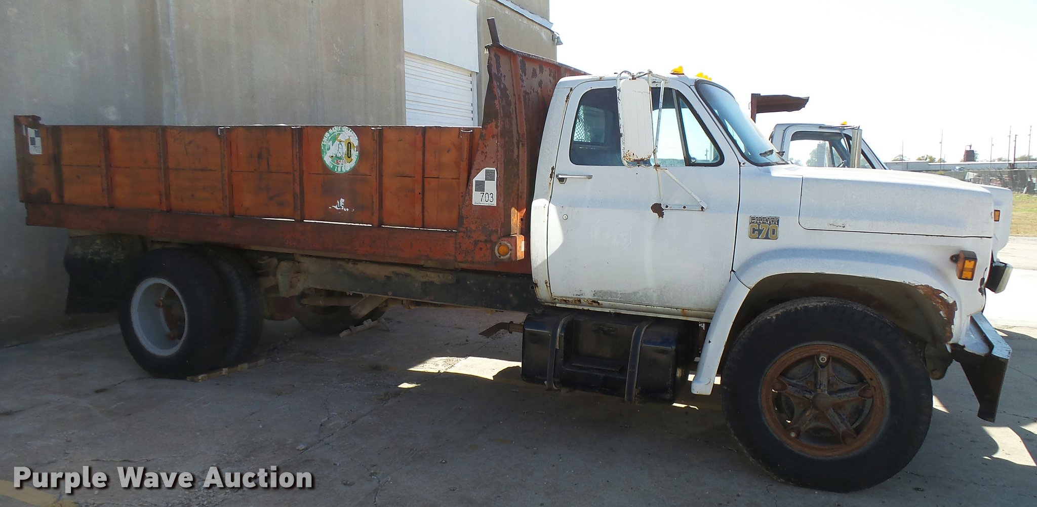 Purple Wave is selling a used Flat Bed Truck in Kansas. This item is a 1979 Chevrolet C70 flatbed truck with the following: 83,158 miles on odometer, Eight cylinder gas engine, Five speed manual transmission, Two speed rear end, Single axle, Heat, AM/FM, Manual windows and locks, Vinyl interior, PTO, 14'L x 91"W steel flatbed, Hoist, Single fuel tank, 9.00-20 tires, GVWR 23,160 lbs, Rust, Unit starts hard, Runs rough, No brakes
