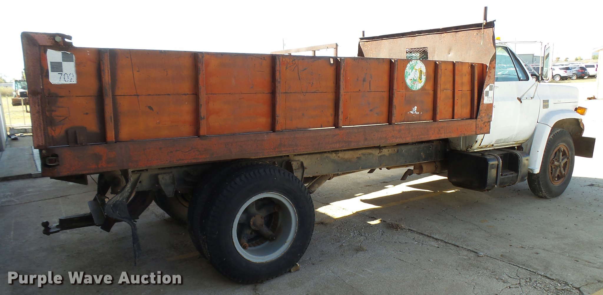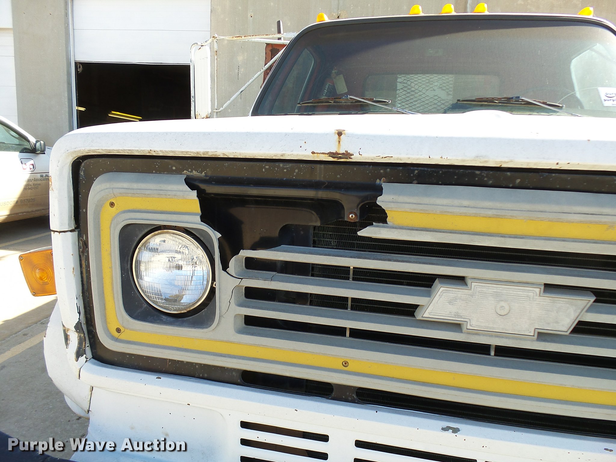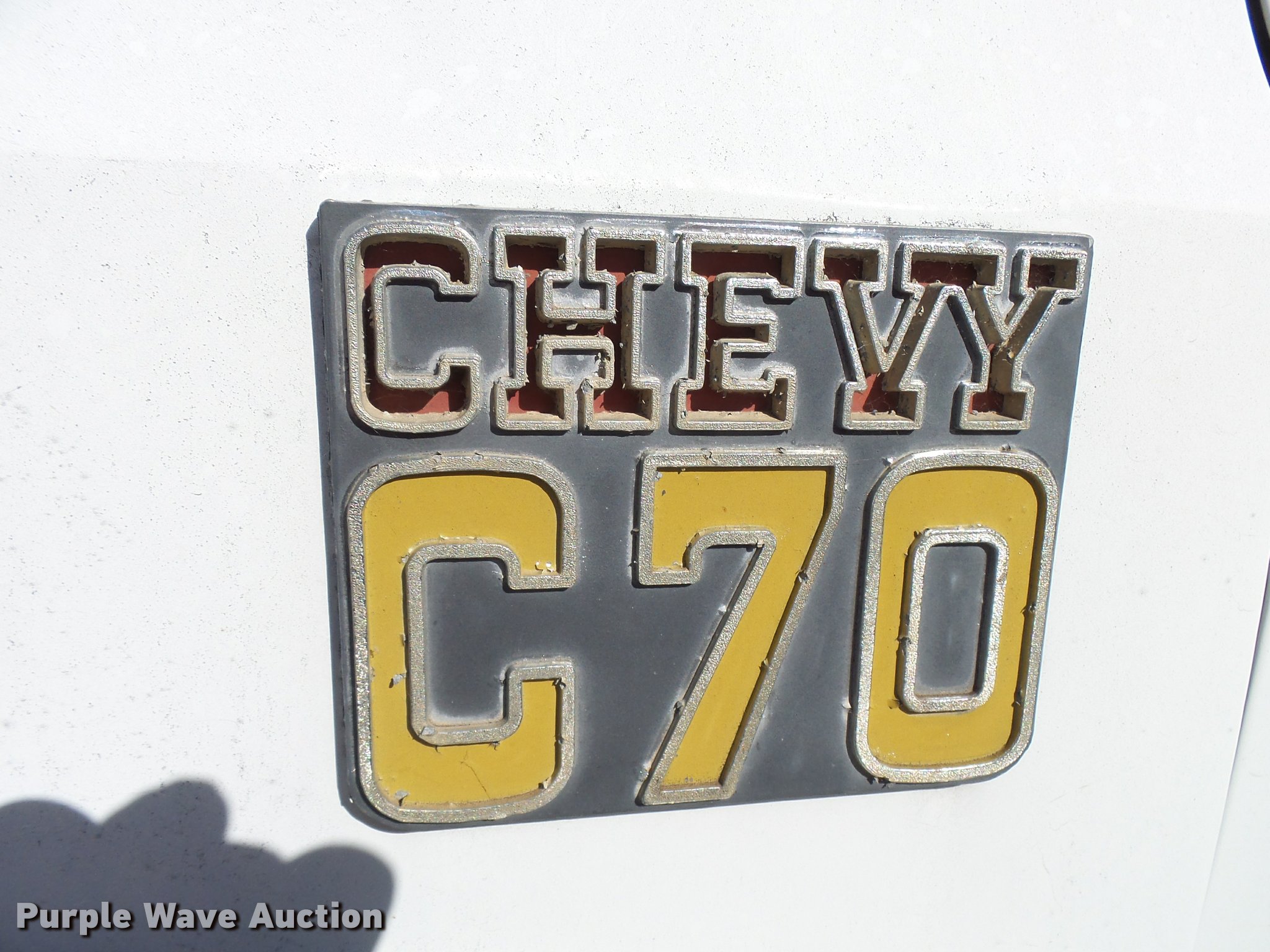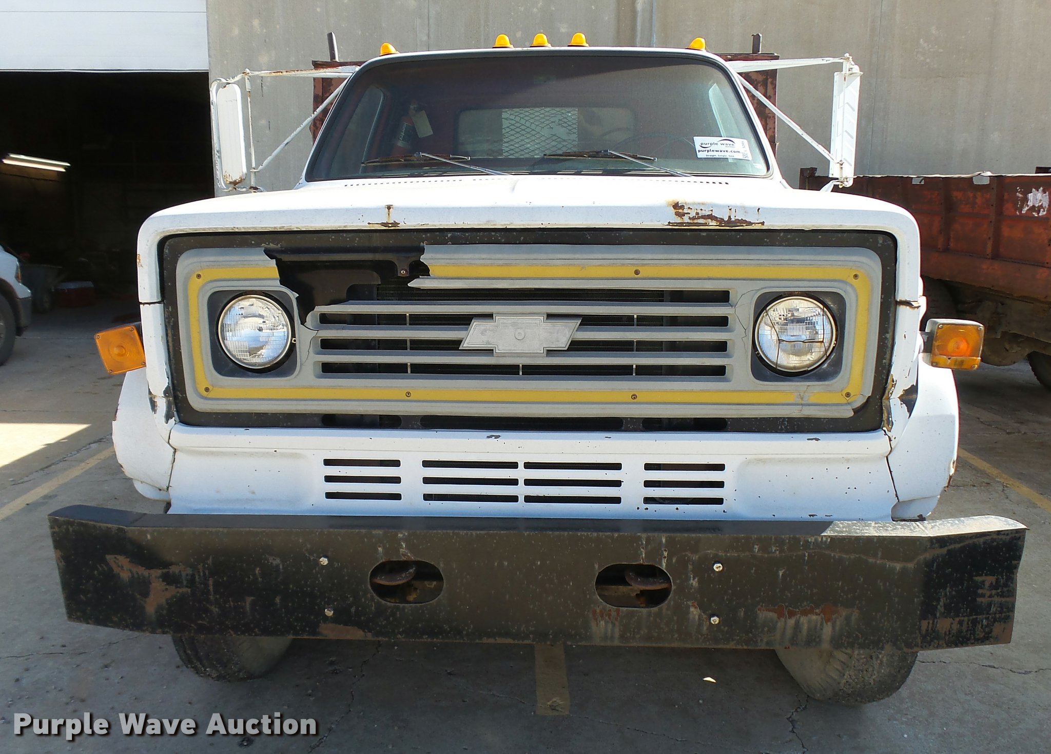Purple Wave is selling a used Flat Bed Truck in Kansas. This item is a 1979 Chevrolet C70 flatbed truck with the following: 83,158 miles on odometer, Eight cylinder gas engine, Five speed manual transmission, Two speed rear end, Single axle, Heat, AM/FM, Manual windows and locks, Vinyl interior, PTO, 14'L x 91"W steel flatbed, Hoist, Single fuel tank, 9.00-20 tires, GVWR 23,160 lbs, Rust, Unit starts hard, Runs rough, No brakes