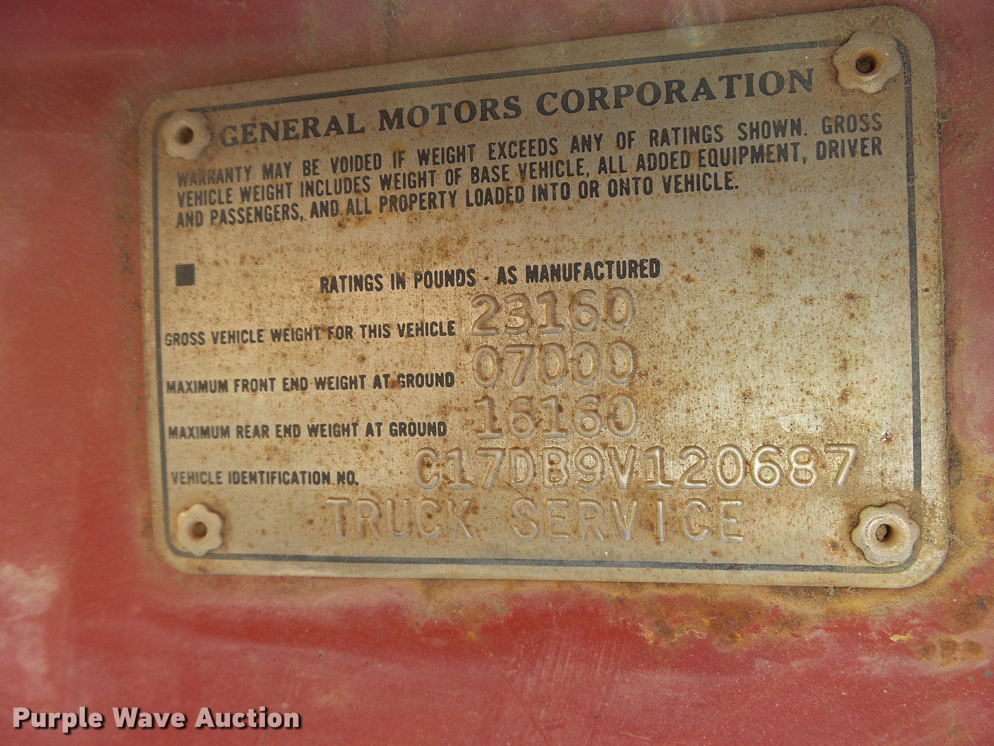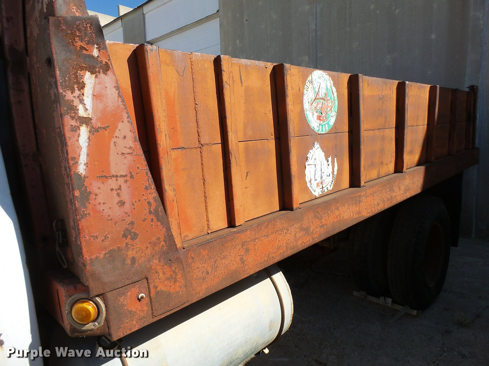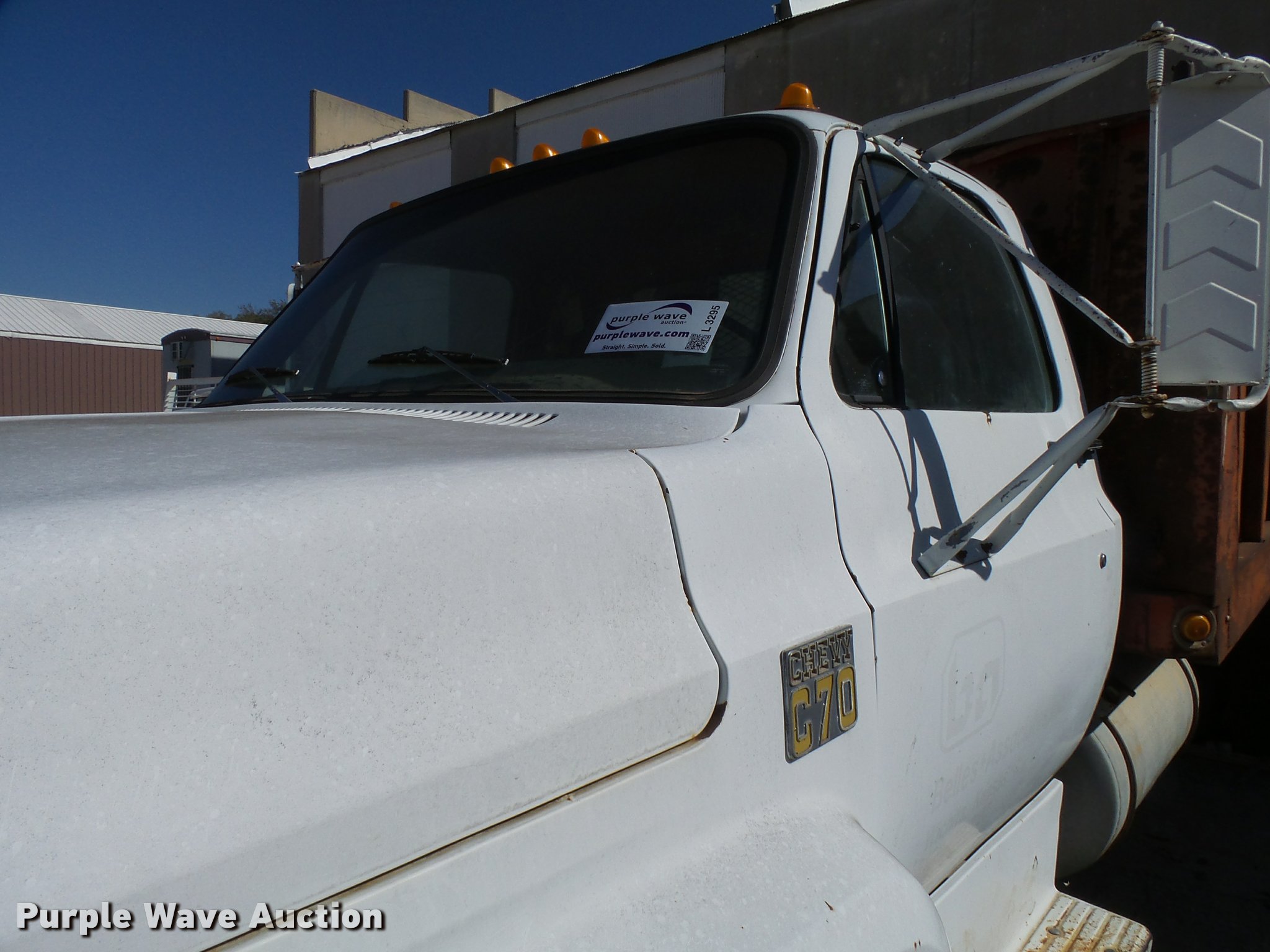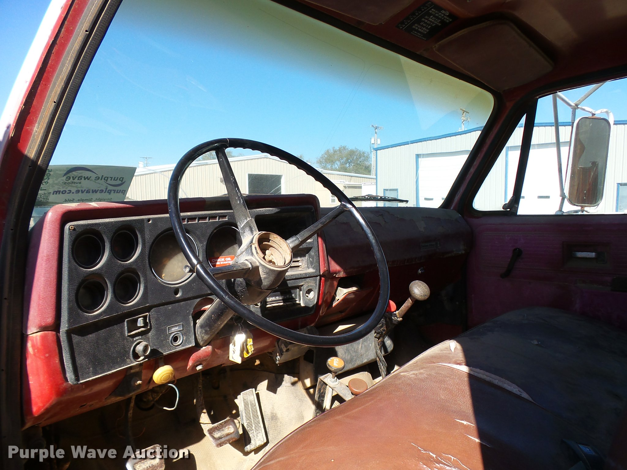 Purple Wave is selling a used Flat Bed Truck in Kansas. This item is a 1979 Chevrolet C70 flatbed truck with the following: 83,158 miles on odometer, Eight cylinder gas engine, Five speed manual transmission, Two speed rear end, Single axle, Heat, AM/FM, Manual windows and locks, Vinyl interior, PTO, 14'L x 91"W steel flatbed, Hoist, Single fuel tank, 9.00-20 tires, GVWR 23,160 lbs, Rust, Unit starts hard, Runs rough, No brakes