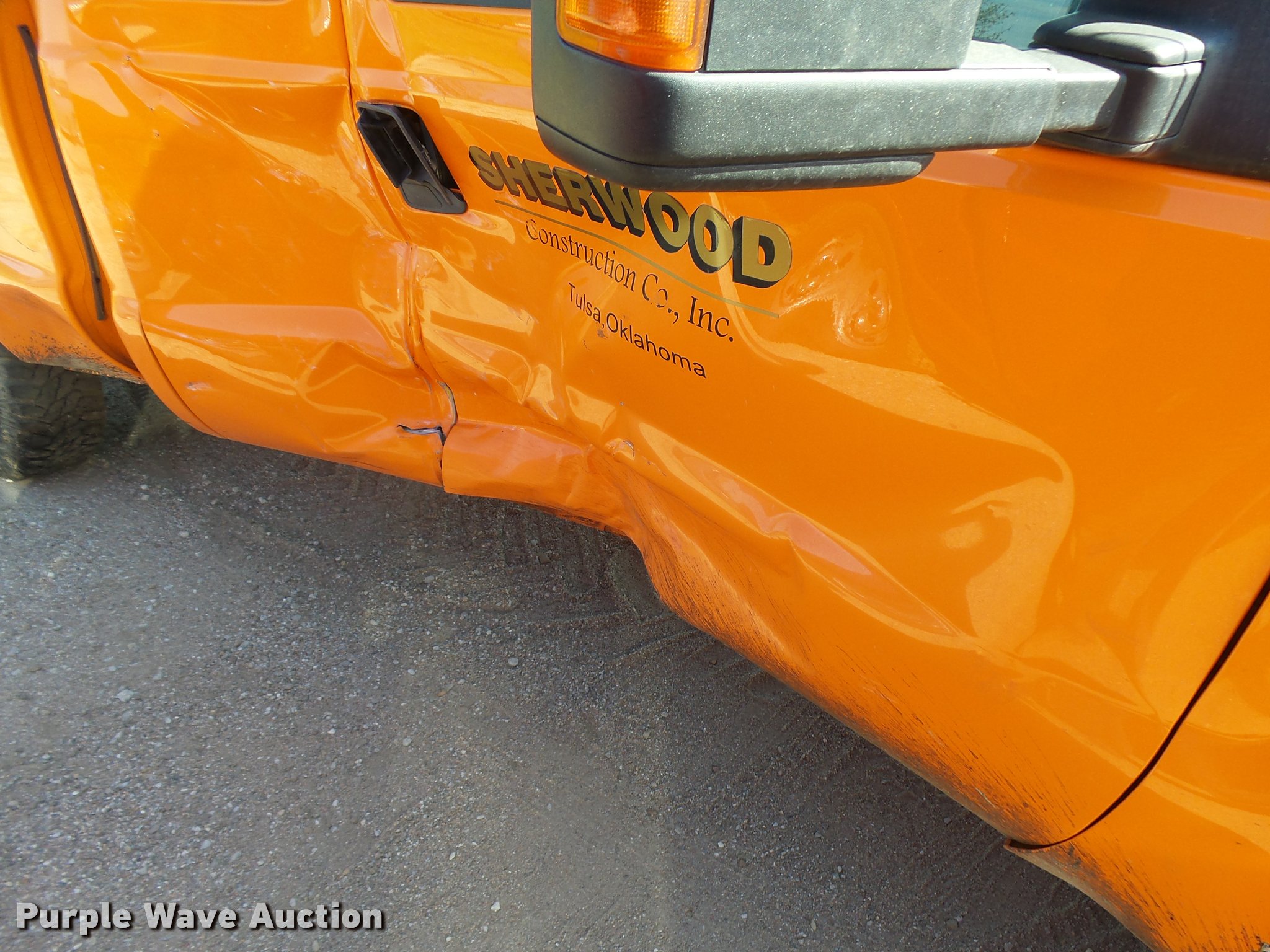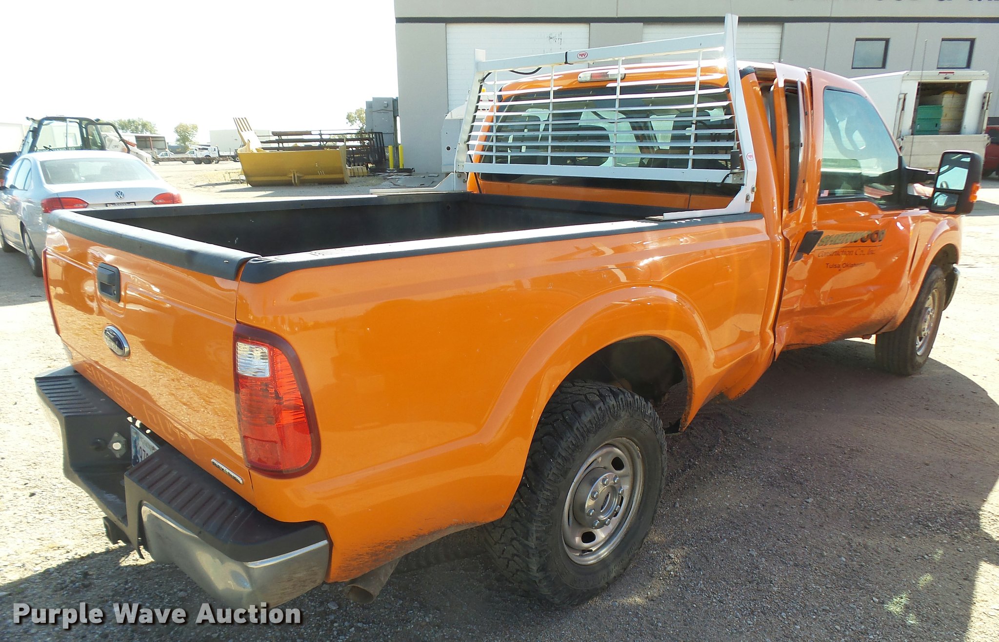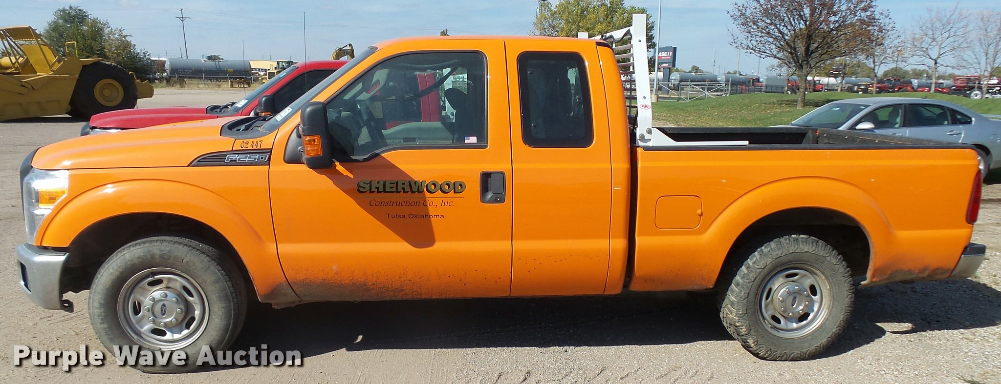 2013 Ford F250 Super Duty SuperCab pickup truck. 100,515 miles on odometer, 6.2L V8 OHV 16V gas engine, Automatic transmission, AC and heat, Tilt, Cruise, AM/FM/CD, Power windows, locks, and mirrors, Cloth interior, Front tow hooks, Headache rack, Receiver hitch, Trailer wiring, LT245/75R17 front tires, LT265/70R17 rear tires, Passenger side body damage, Runs rough, Dead battery, Headliner damage, Passenger seat damage, Unit# 02.447. Oklahoma title. 1FT7X2A69DEA18918. Sherwood Construction Company. 3219 W May St. Wichita, KS 67213