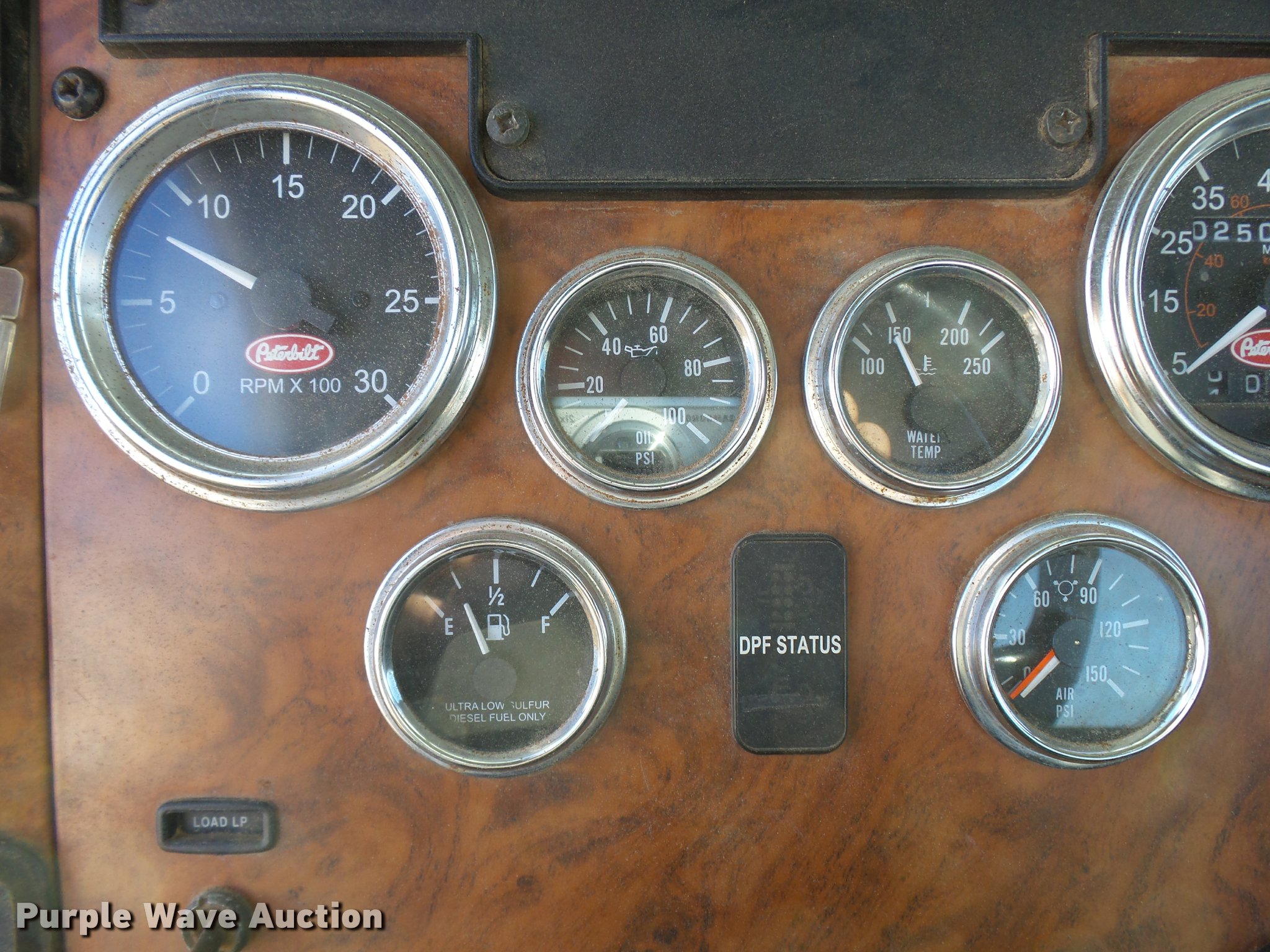 Purple Wave is selling a used Truck Chassis in Kansas. This item is a 2009 Peterbilt 335 truck cab and chassis with the following: 25,053 miles on odometer, Paccar PX-8 8.3L L6 diesel engine, Eaton Fuller 10 speed manual transmission, Single axle, Full differential lock, AC and heat, Cruise, AM/FM, Heated mirrors, Air suspension seat, Exterior visor, Single exhaust stack, Single fuel tank, 4:10 gear ratio, Spring suspension, Air brakes, 14'10" from cab to end of chassis, 11R22.5 tires, GVWR 33,000 lbs, Dead battery, Unknown operating condition