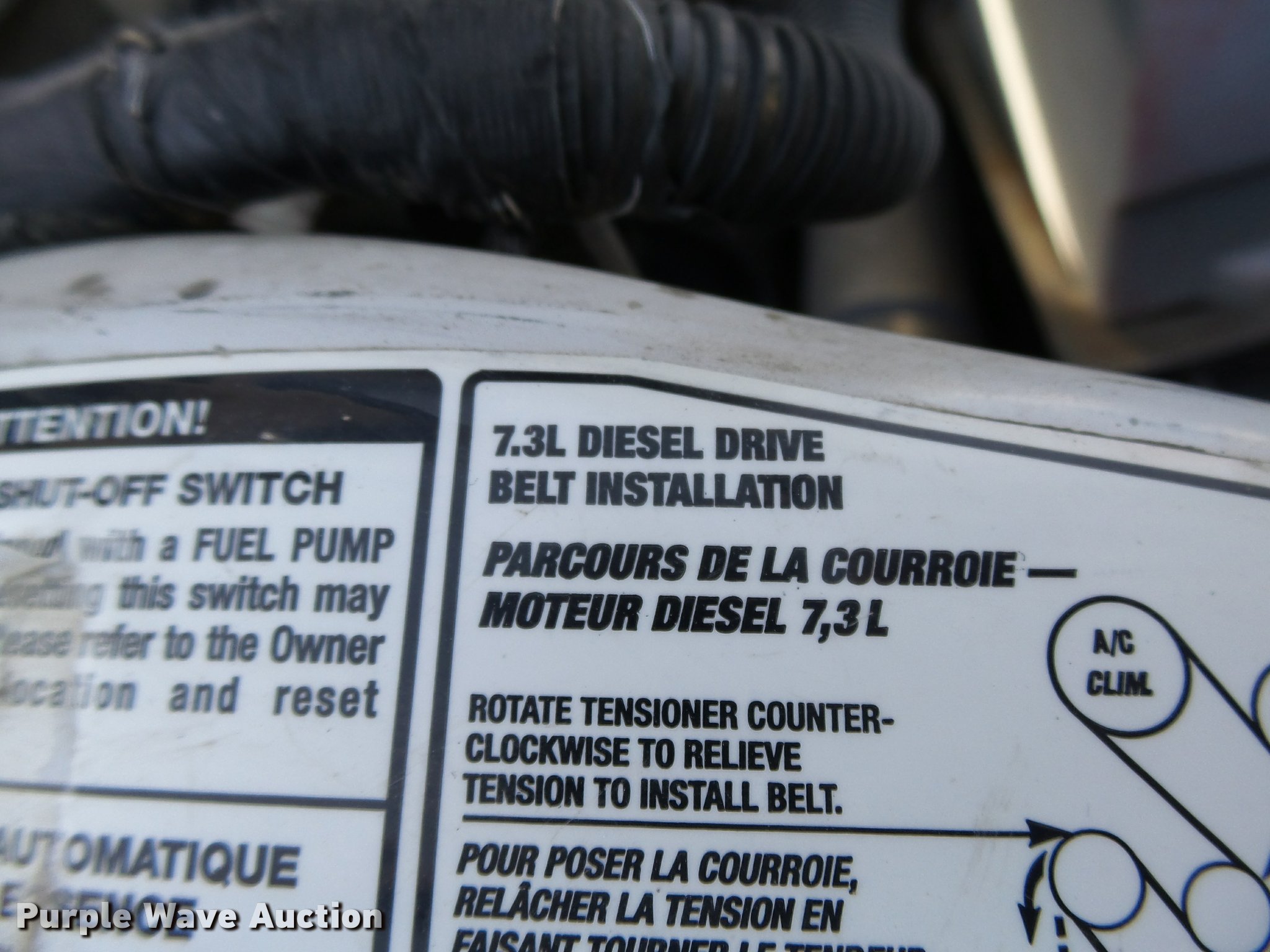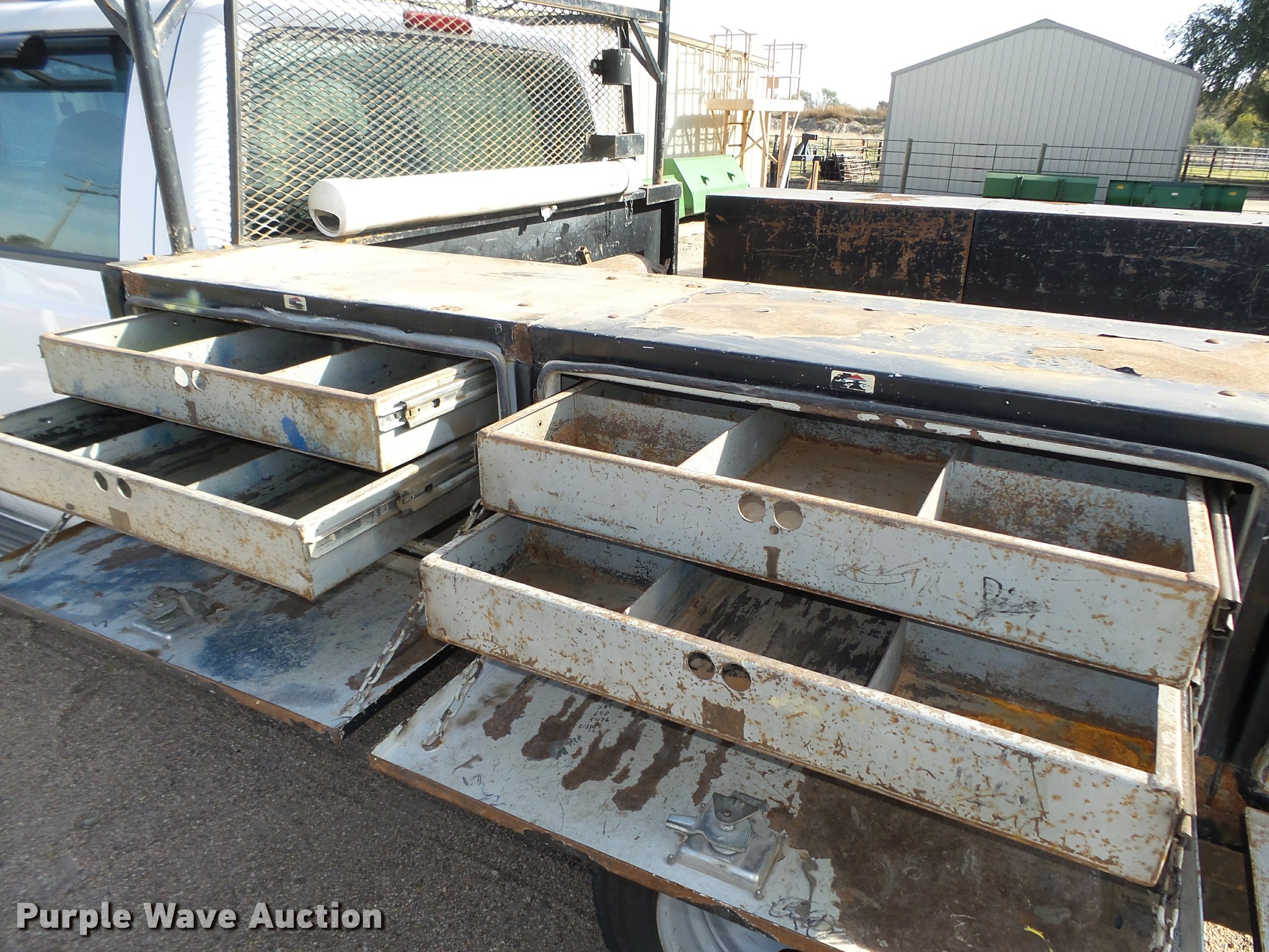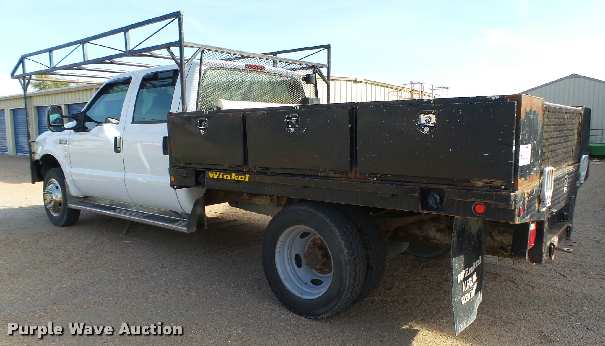 Purple Wave is selling a used Flat Bed Truck in Nebraska. This item is a 1999 Ford F550 Super Duty XLT Crew Cab flatbed truck with the following: 175,634 miles on odometer, 7.3L V8 OHV 16V diesel engine, Six speed manual transmission, AC and heat, Tilt, Cruise, AM/FM/cassette, Power windows, locks, and seats, Vinyl interior, Commander trailer brake controller, Grill guard, LuVerne running boards, Front tow hooks, Winkel flatbed, 9'L x 96"W, 60.5" I.D., (6) compartments, 18"H toolbox, Bottle holder, Folding bed steps, Rear under bed storage, Mesh tailgate, Trailer wiring, Headache rack, 13'L x 82"W overhead storage rack, 6" cross members, 9.5"H sides,, Fuel tank, Auxiliary fuel tank, 60 gallon capacity, Electric fuel pump, PVC tube storage, 225/70R19.5 tires, Annual inspection valid through January 2017, Unit# 399