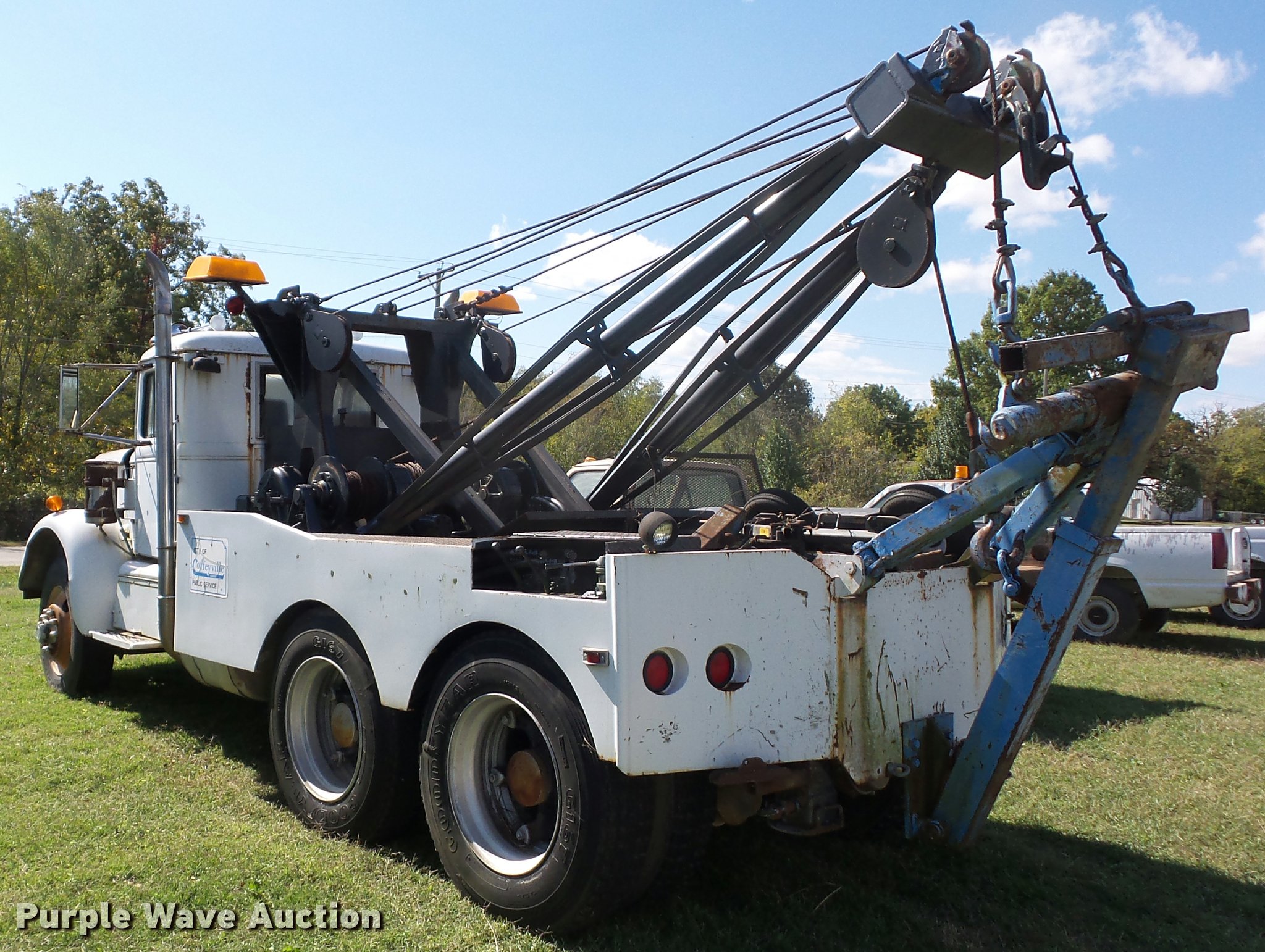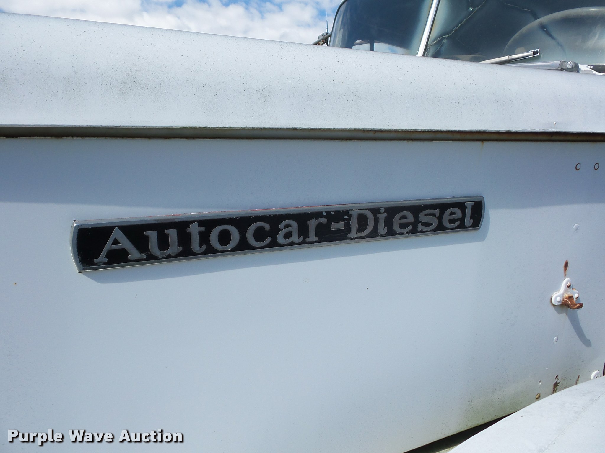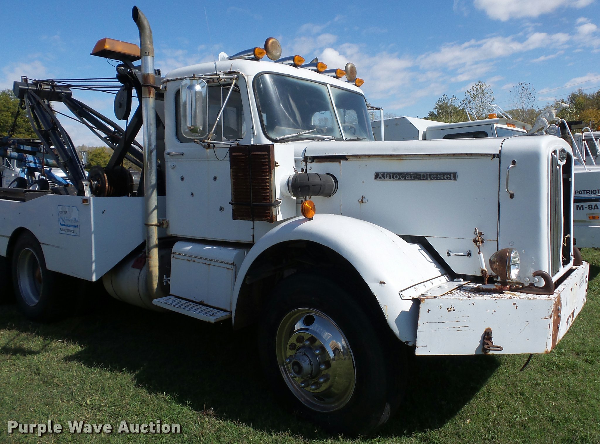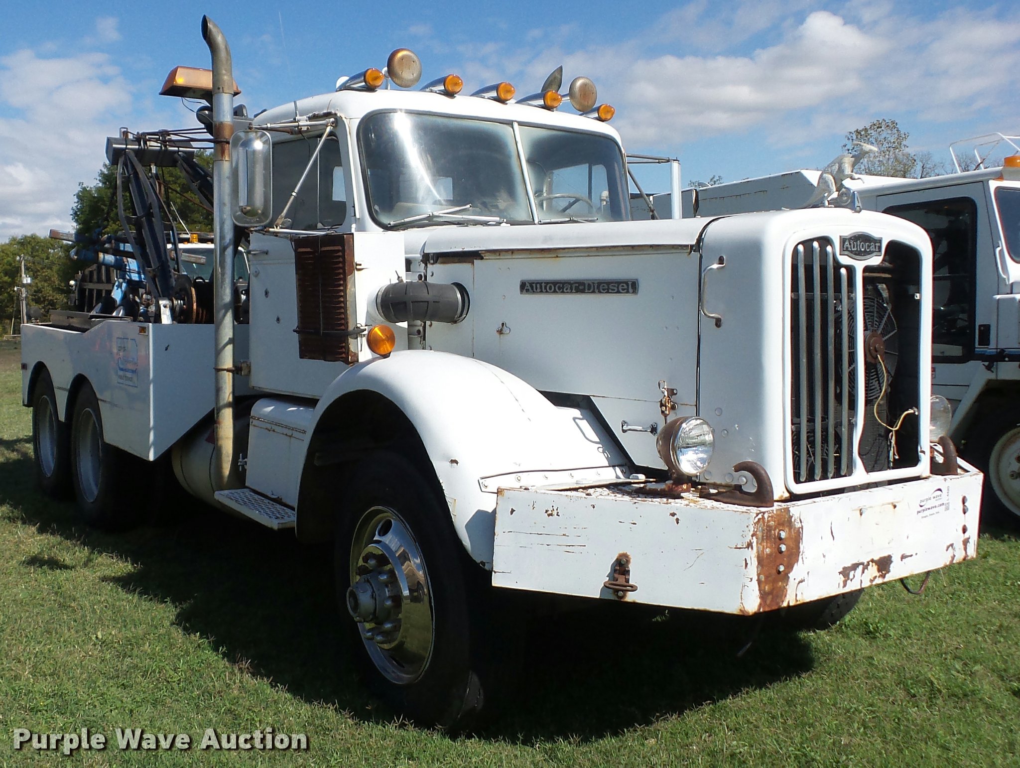 Purple Wave is selling a used Rollback or Tow Truck in Kansas. This item is a 1965 Autocar tow truck with the following: 18,414 miles on odometer, 9,877 hours on meter, Six cylinder turbo diesel engine, Manual transmission, Tandem axle, Heat, Air suspension seat, PTO, Rear hydraulic outriggers, Spring suspension, Air brakes, 11R24.5 tires, Dead battery, Cracked windshield, Unit has to be jump started