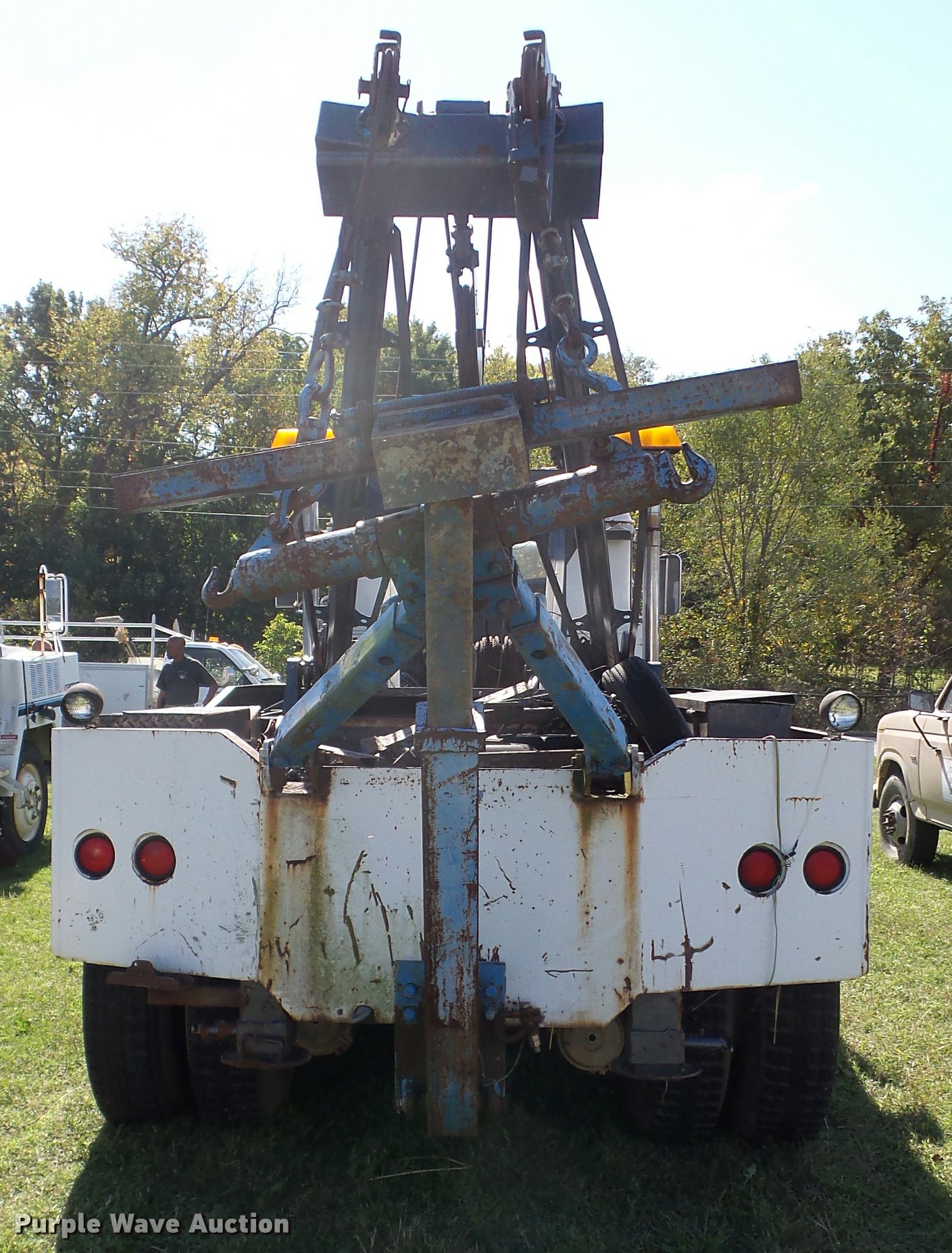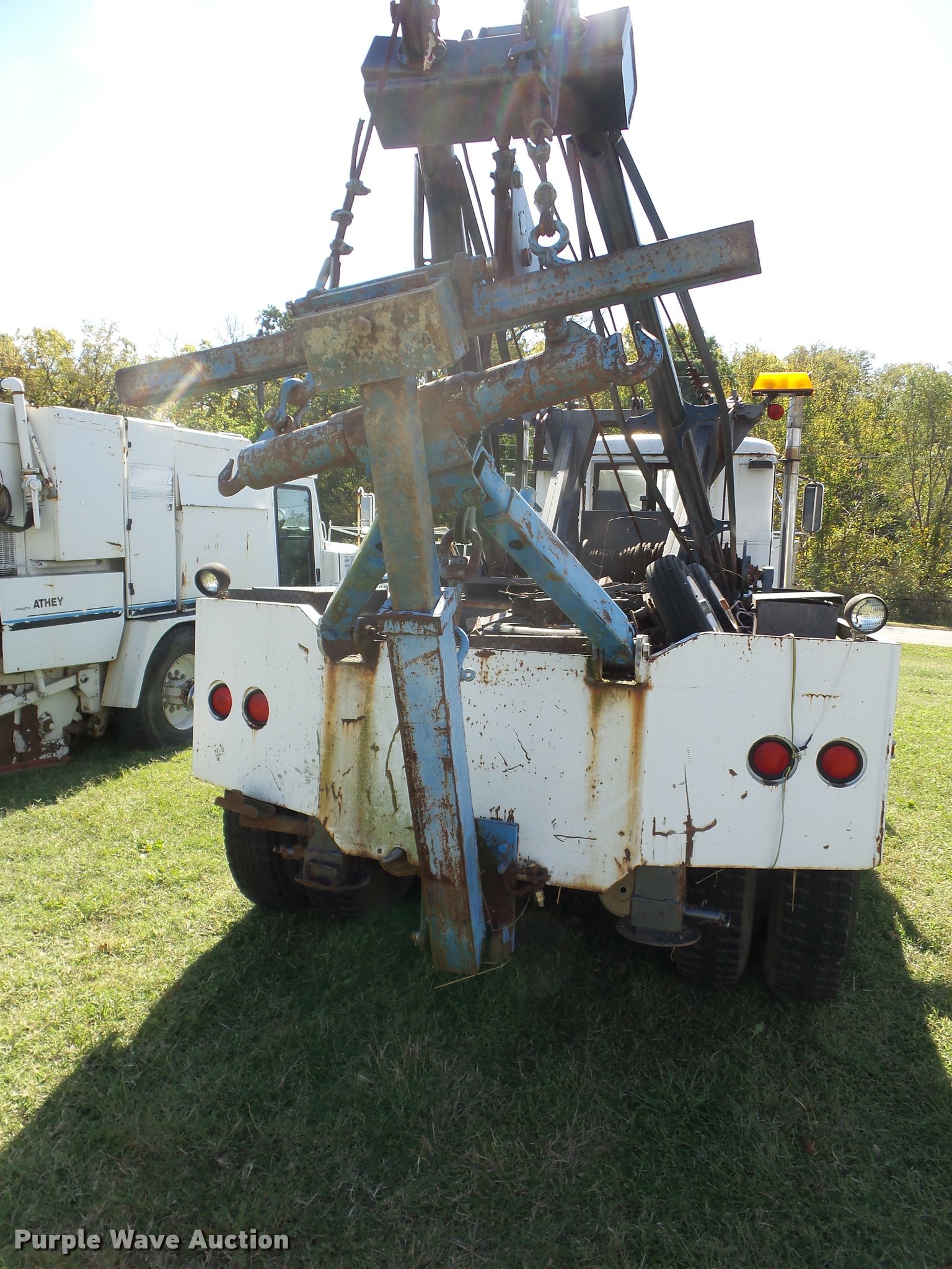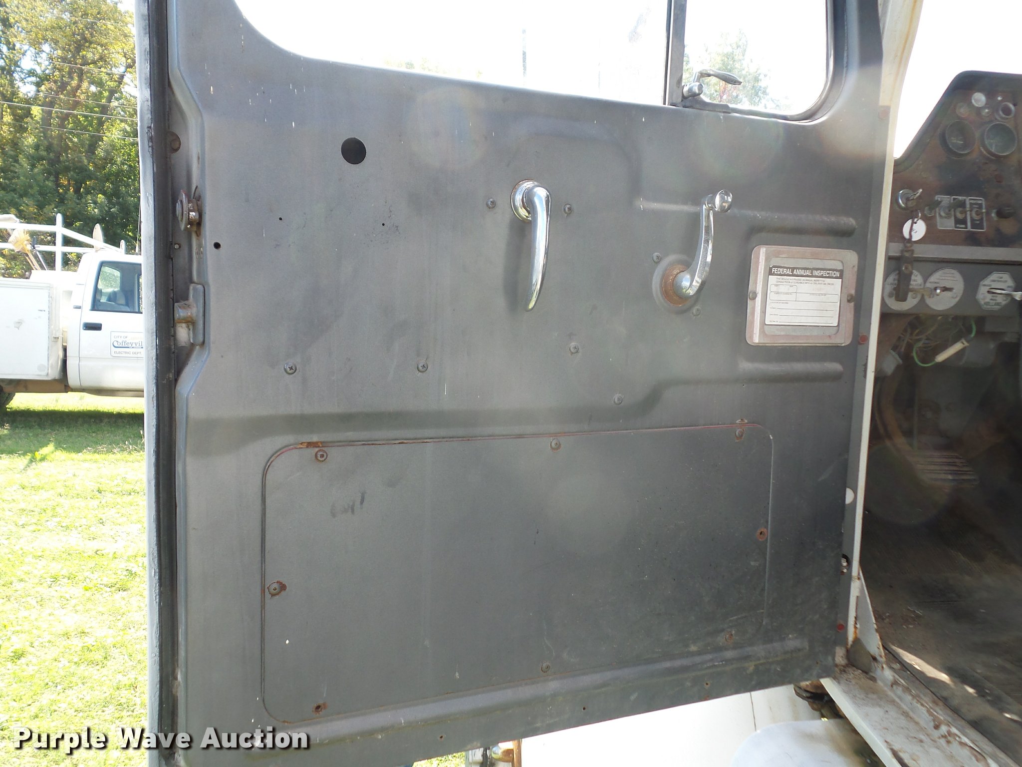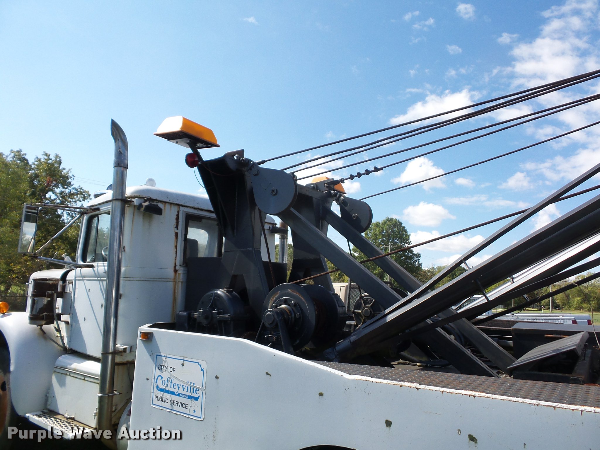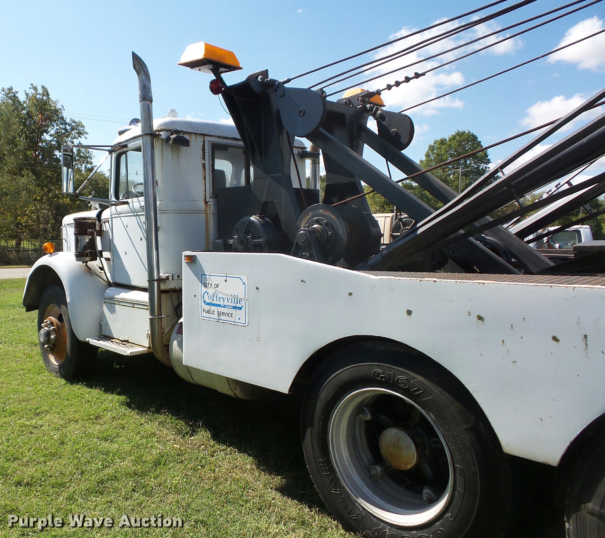 1965 Autocar tow truck. 18,414 miles on odometer, 9,877 hours on meter, Six cylinder turbo diesel engine, Manual transmission, Tandem axle, Heat, Air suspension seat, PTO, Rear hydraulic outriggers, Spring suspension, Air brakes, 11R24.5 tires, Dead battery, Cracked windshield, Unit has to be jump started. Kansas title. DC7564T57139. City of Coffeyville. 1106 Stark. Coffeyville, KS 67337