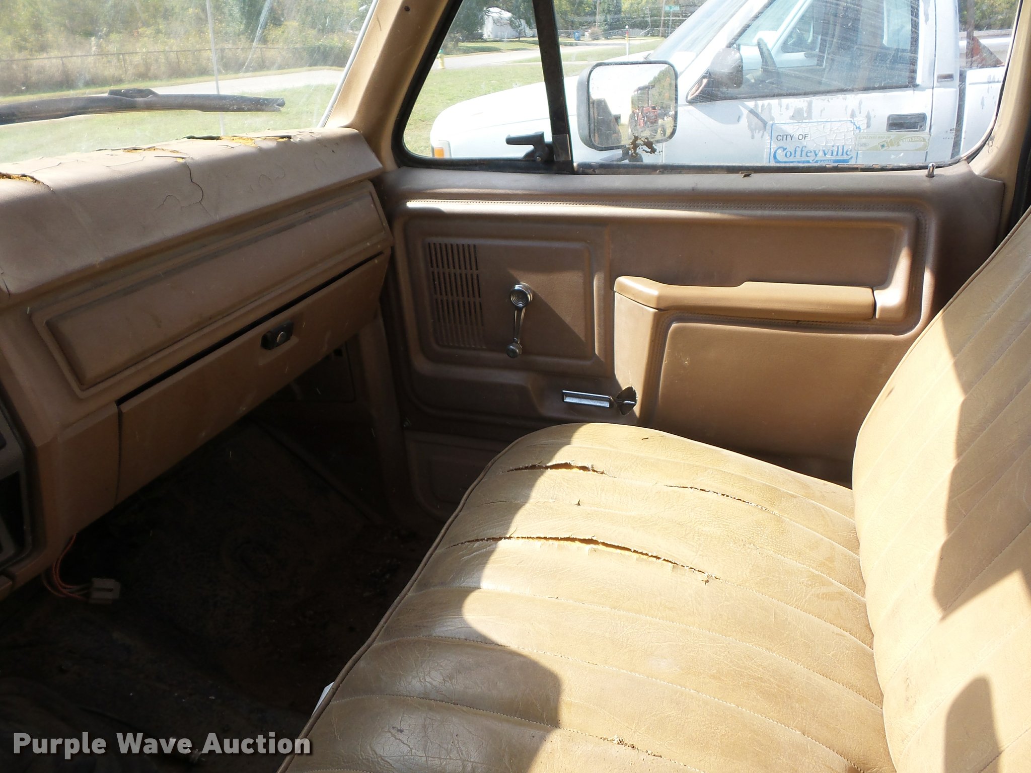 1986 Ford F350 flatbed pickup truck. 60,977 miles on odometer, 7.5L V8 OHV 16V gas engine, Four speed manual transmission, Heat, AM/FM, Manual windows and locks, Vinyl interior, 235/85R16 tires, Dead battery, Non-operational unit. Kansas title. 1FDJF37L7GPB18645. City of Coffeyville. 1106 Stark. Coffeyville, KS 67337