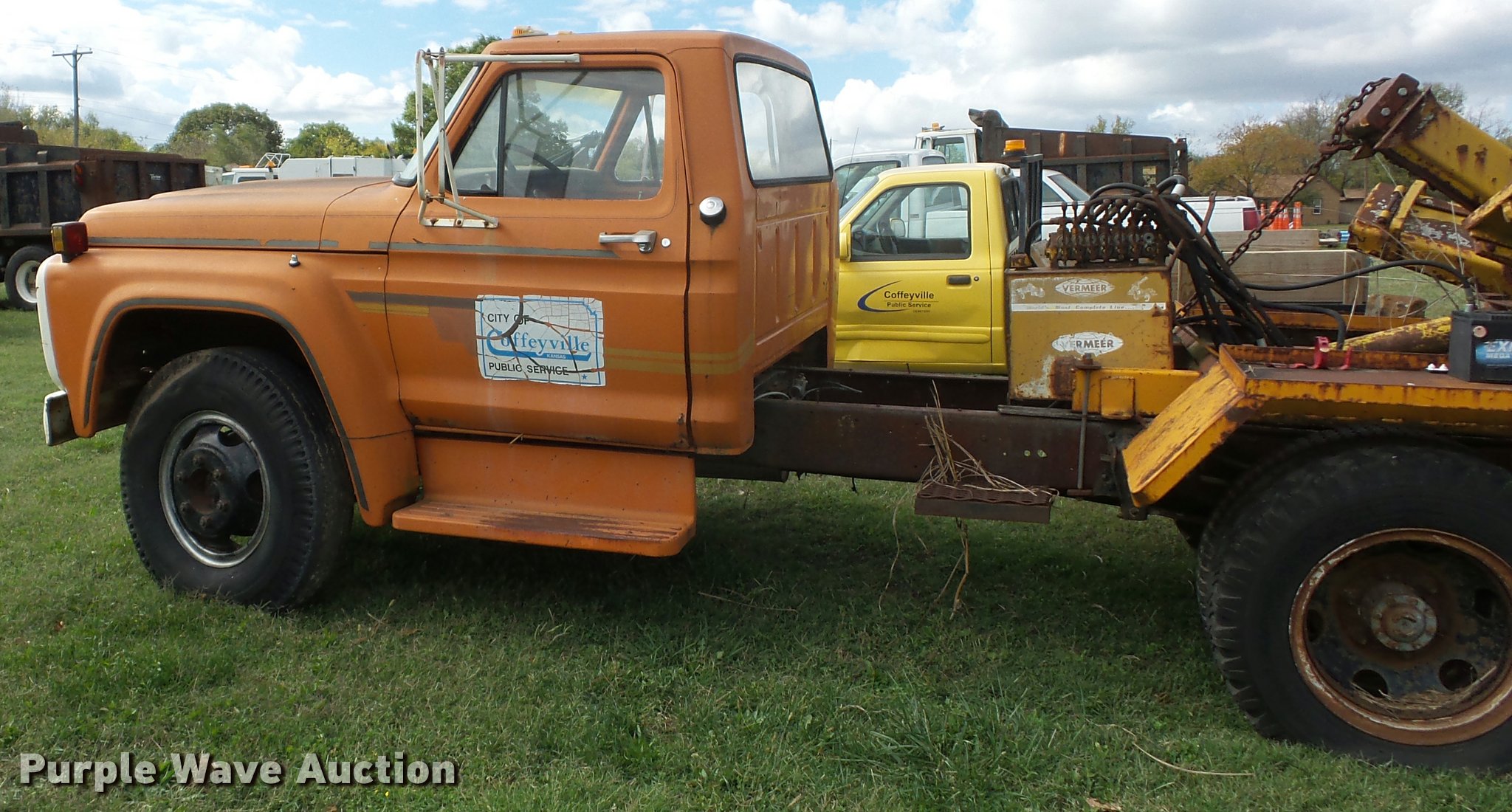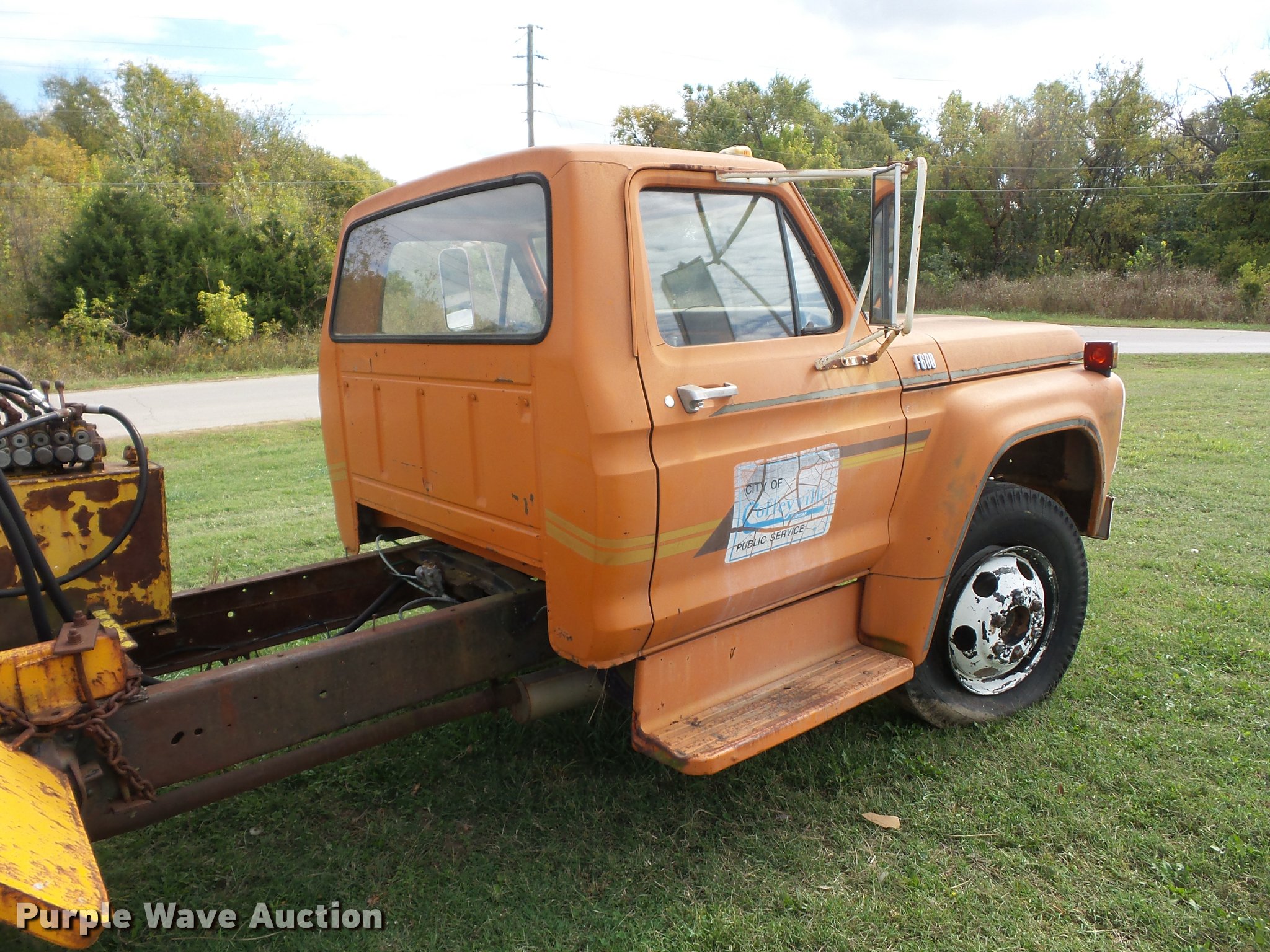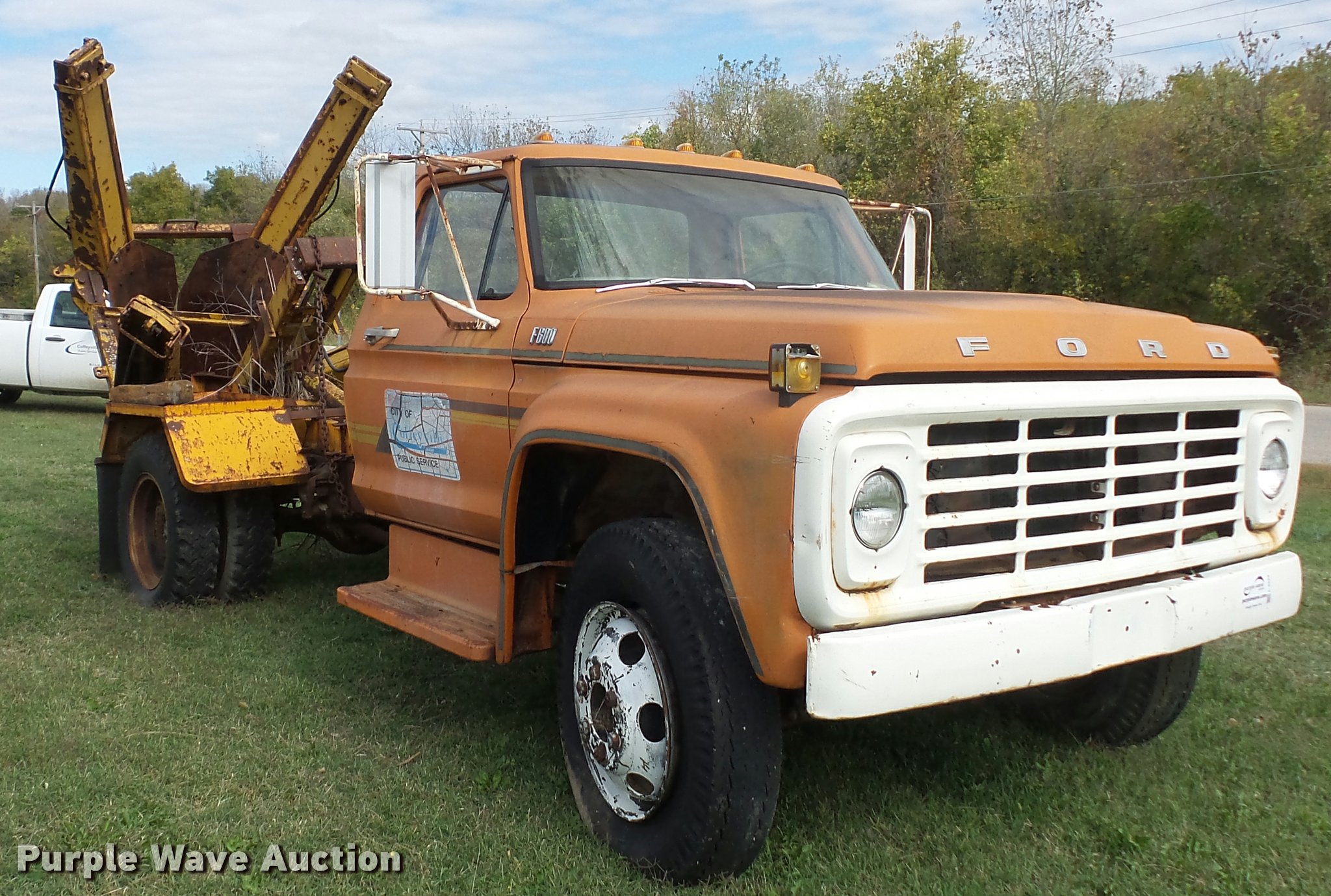 1974 Ford F600 truck with tree spade. 20,409 miles on odometer Actual mileage unknown, Eight cylinder gas engine, Four speed manual transmission, Heat, Manual windows and locks, Vinyl interior, PTO, 146" wheelbase, 10-20 front tires, 8.25-20 rear tires, GVWR 16,000 lbs, Dead battery, Unknown operating condition. Kansas title. F60DVT82812. City of Coffeyville. 1106 Stark. Coffeyville, KS 67337