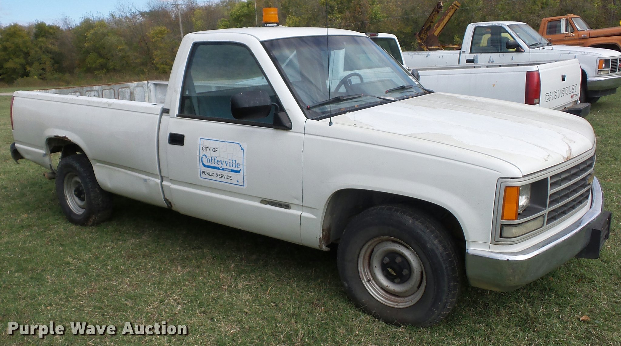 1990 Chevrolet 1500 pickup truck. 68,913 miles on odometer, 4.3L V6 gas engine, Automatic transmission, Heat, AM/FM, Manual windows and locks, Cloth interior, 235/75R15 tires. Kansas title. 1GCDC14K7LE217157. City of Coffeyville. 1106 Stark. Coffeyville, KS 67337
