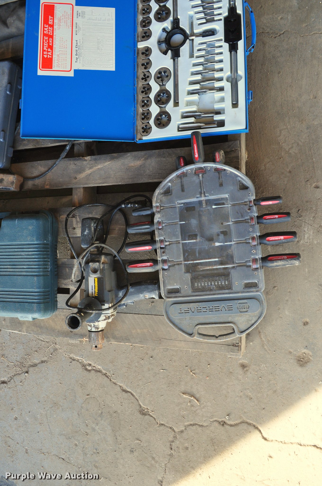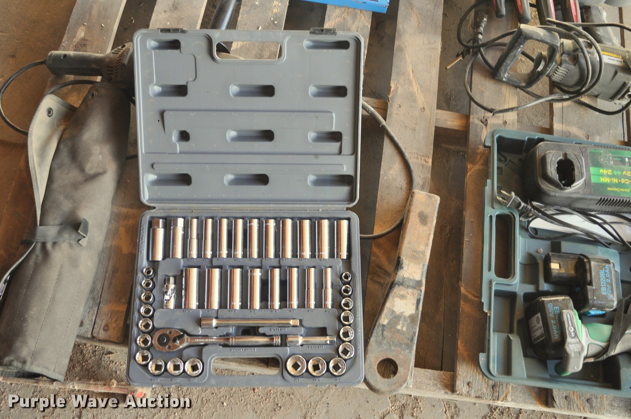 Purple Wave is selling a used Tools in Colorado. This item is a Tools with the following: John Deere impact wrench, 1/2", Socket set, 1/2" drive, John Deere metric end wrench set, 45 piece tap and die set, Screw driver set, 1/2" drill, Buffer, Snap-On battery load tester