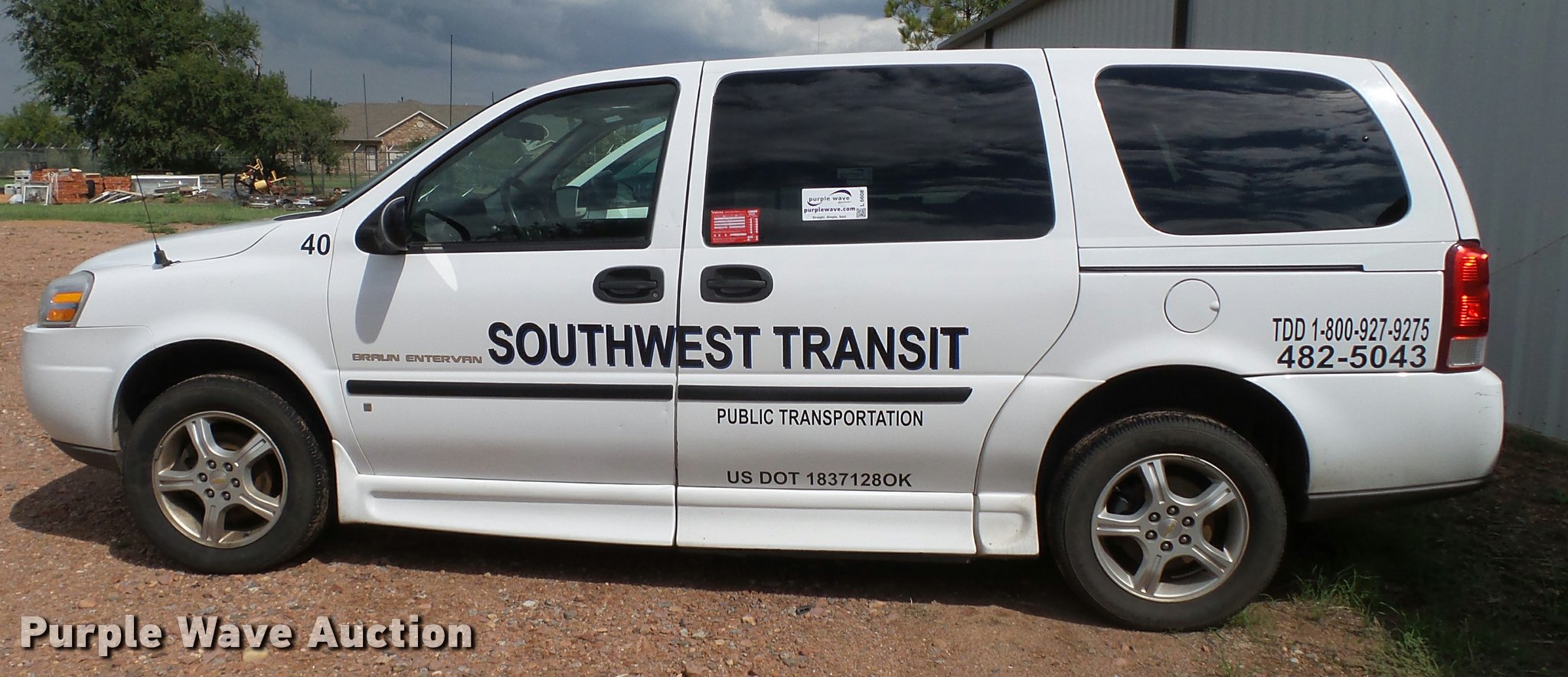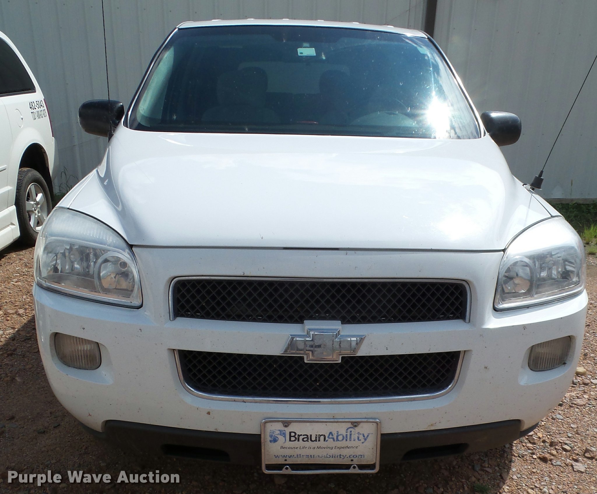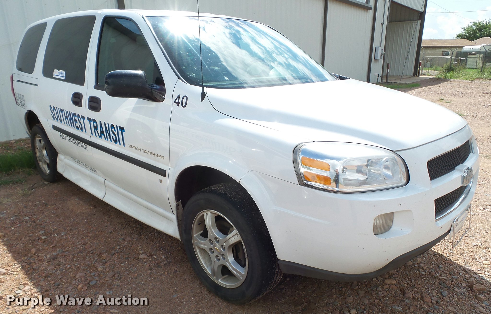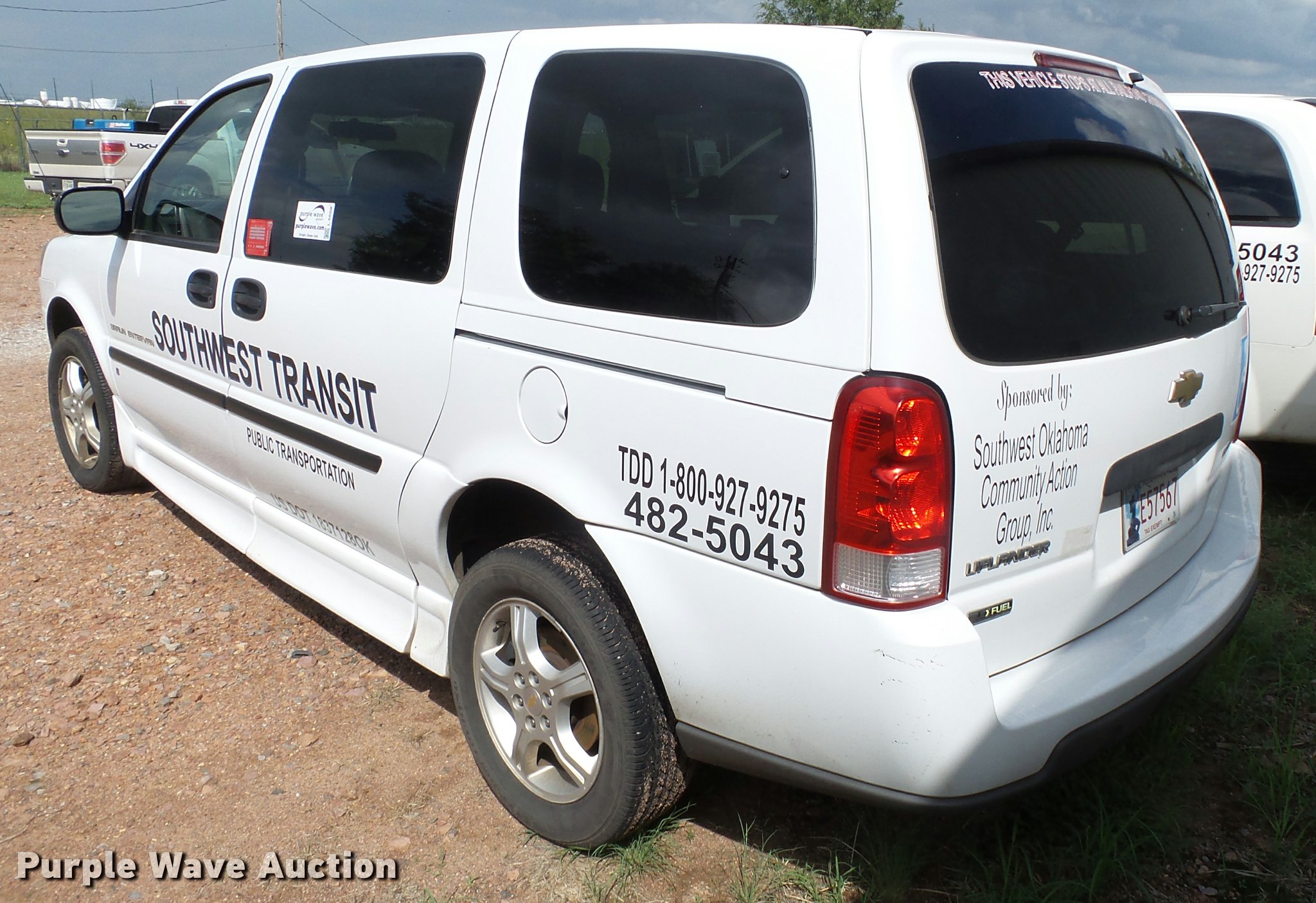 Purple Wave is selling a used Passenger Vehicle in Oklahoma. This item is a 2008 Chevrolet Uplander van with the following: 335,277 miles on odometer, 3.9L V6 OHV 12V FFV gas engine, 240 HP, Automatic transmission, AC and heat, Tilt, Cruise, AM/FM/CD, Power windows and locks, Cloth interior, Wheelchair lift, 225/60R17 tires, Dead battery