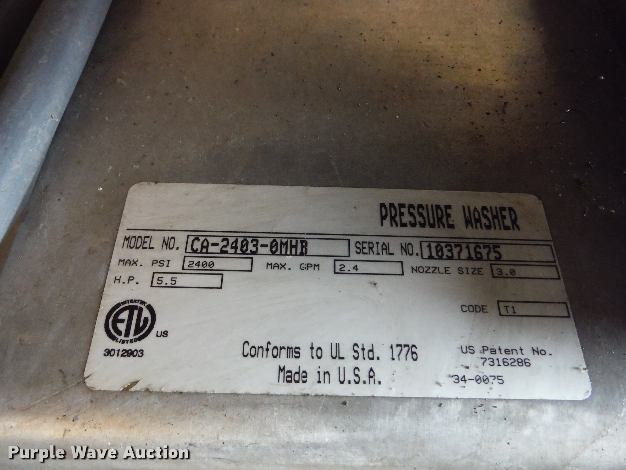 Purple Wave is selling a used Pressure Washer in Illinois. This item is a 2008 Mi-T-M CA-2403-0MHB pressure washer with the following: Honda gas engine, 6.5 HP, 2,400 psi at 2.4 gallons per minute, 50'L hose, Wand, Serial 10371675