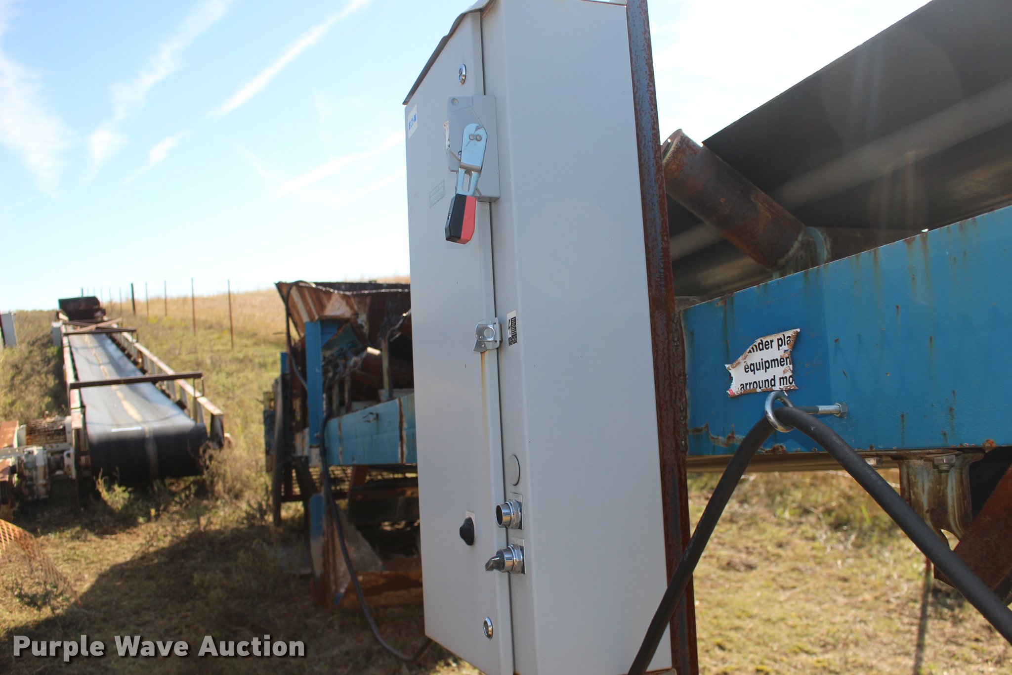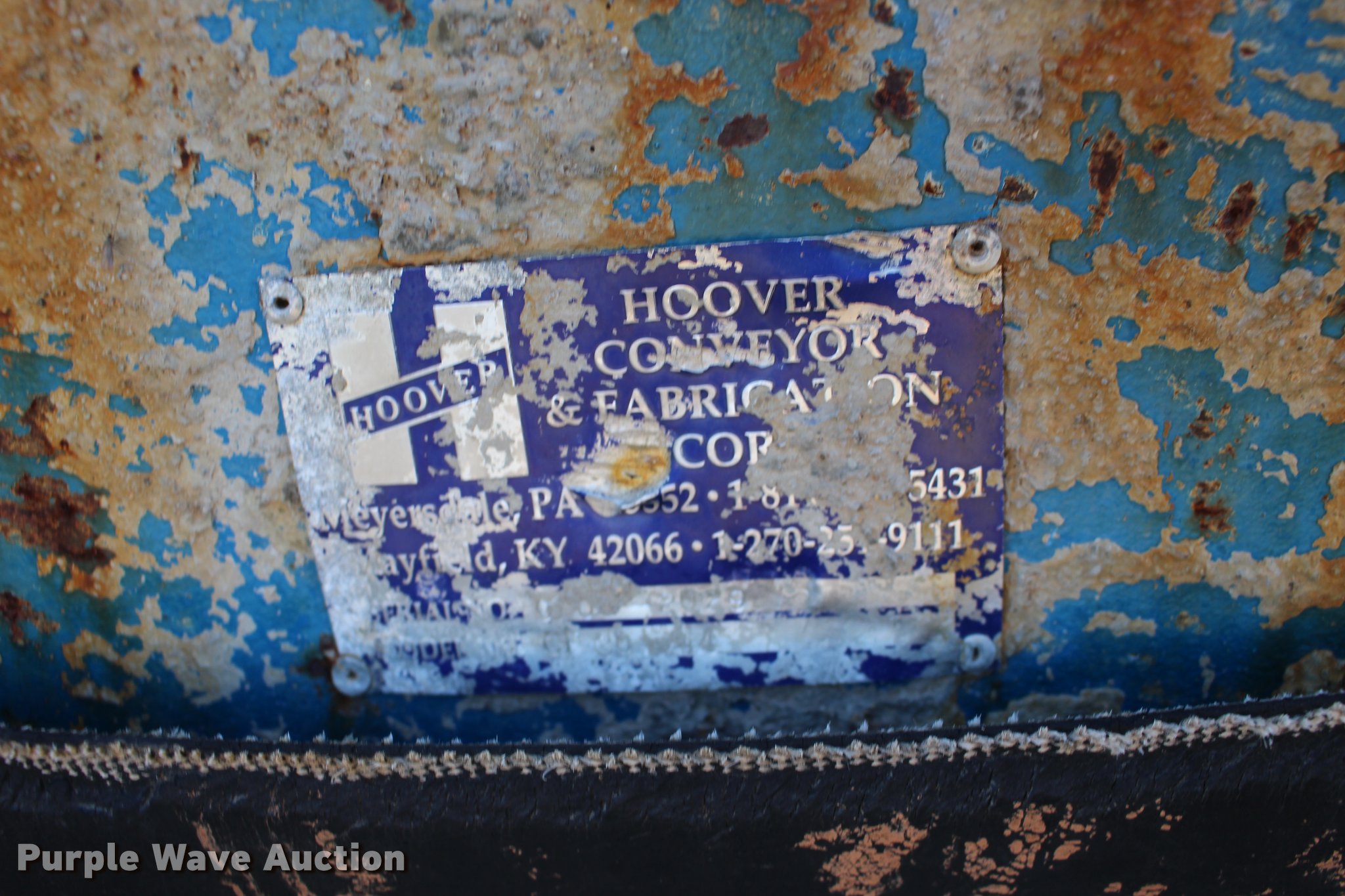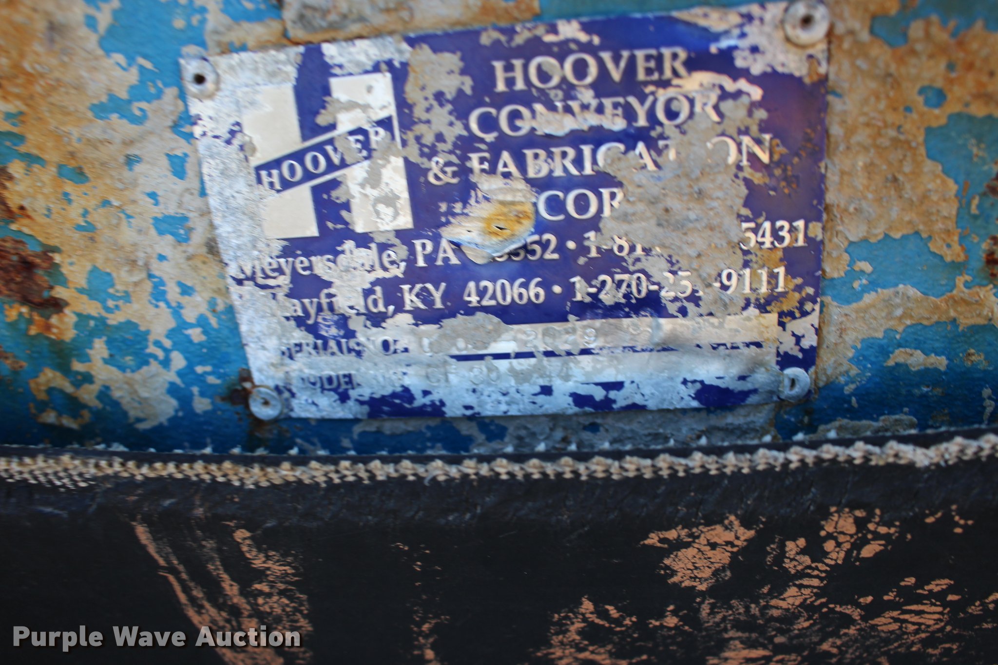 Purple Wave is selling a used Conveyor in Kansas. This item is a Hoover CF30-44 aggregate conveyor with the following: Siemens electric motor, 10 HP, 208-230/460V, 44'L, 30"W belt, Serial 00-2029