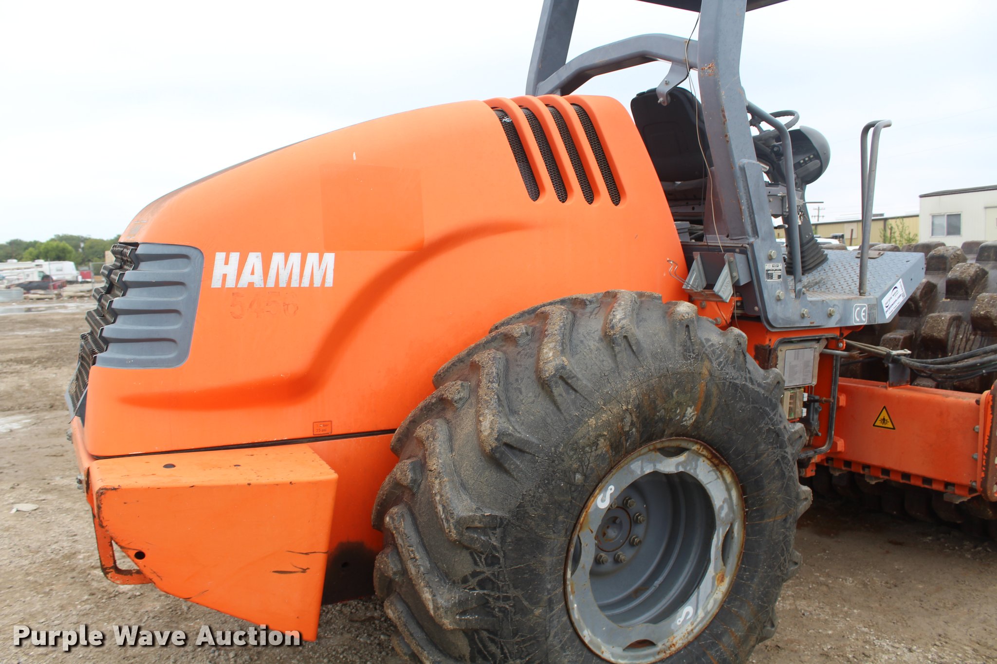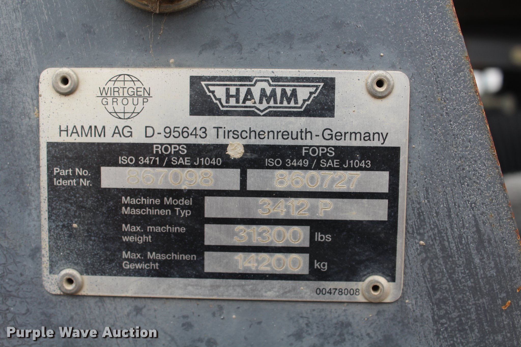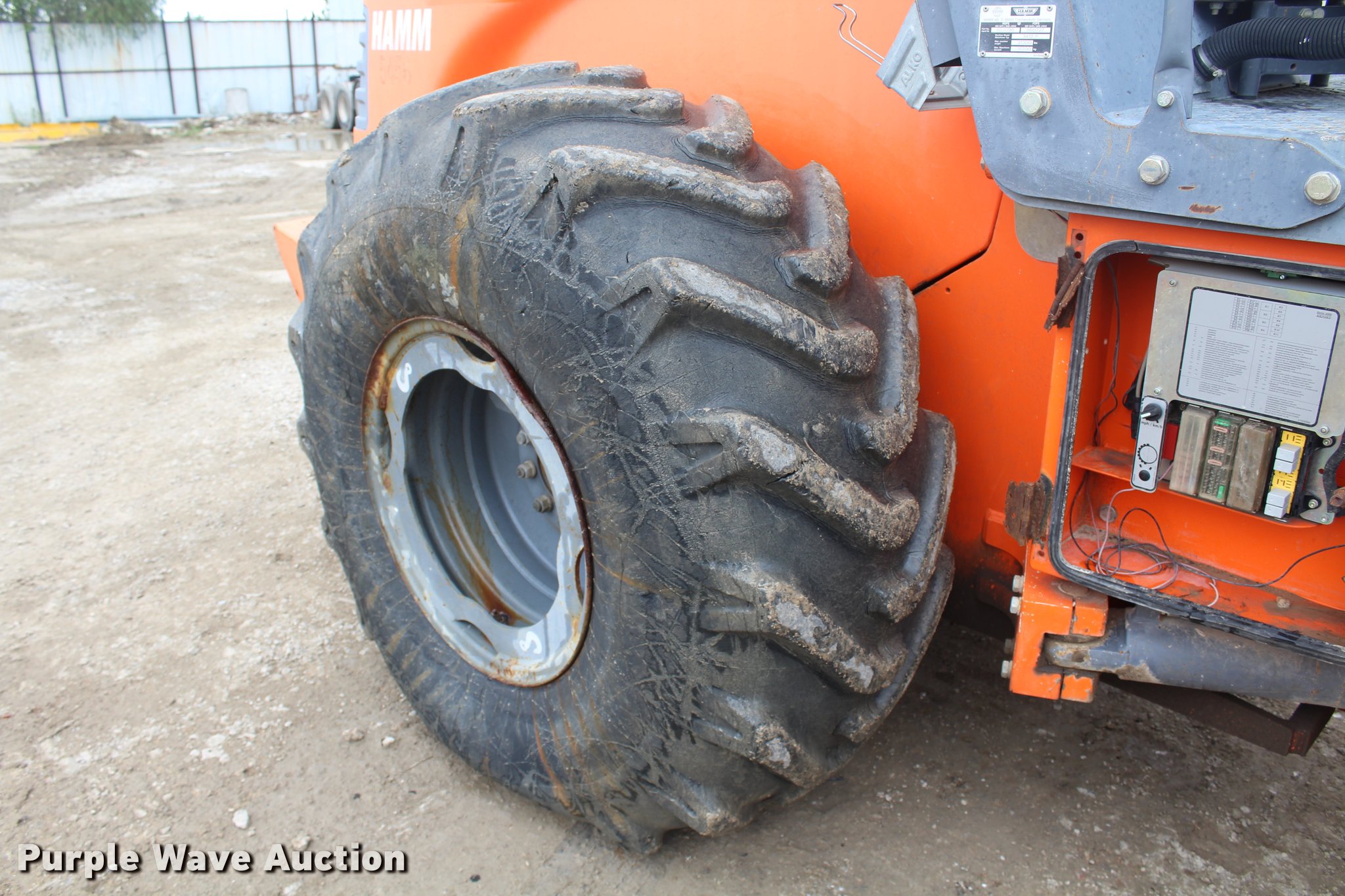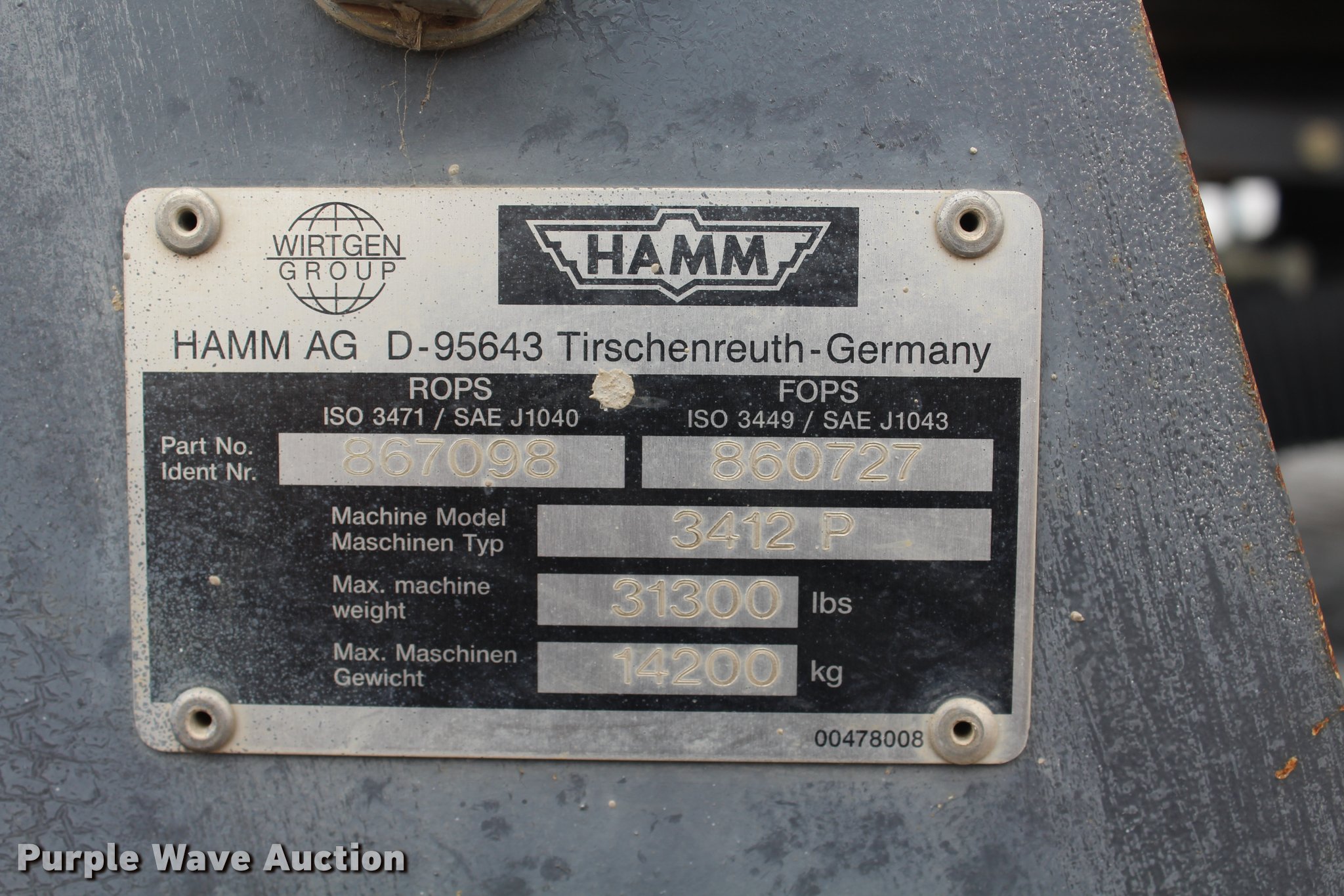 Hamm 3412P single drum roller. 3,105 hours on meter, Duetz BF-4M-2012-C four cylinder turbo diesel engine, Hydrostatic transmission, Canopy, Tilt, Suspension seat, 84"W x 60" diameter padfoot drum, Front and rear drum scrapers, 23.1-26 rear tires, Unit must be jump started. Lewisville, TX 75056