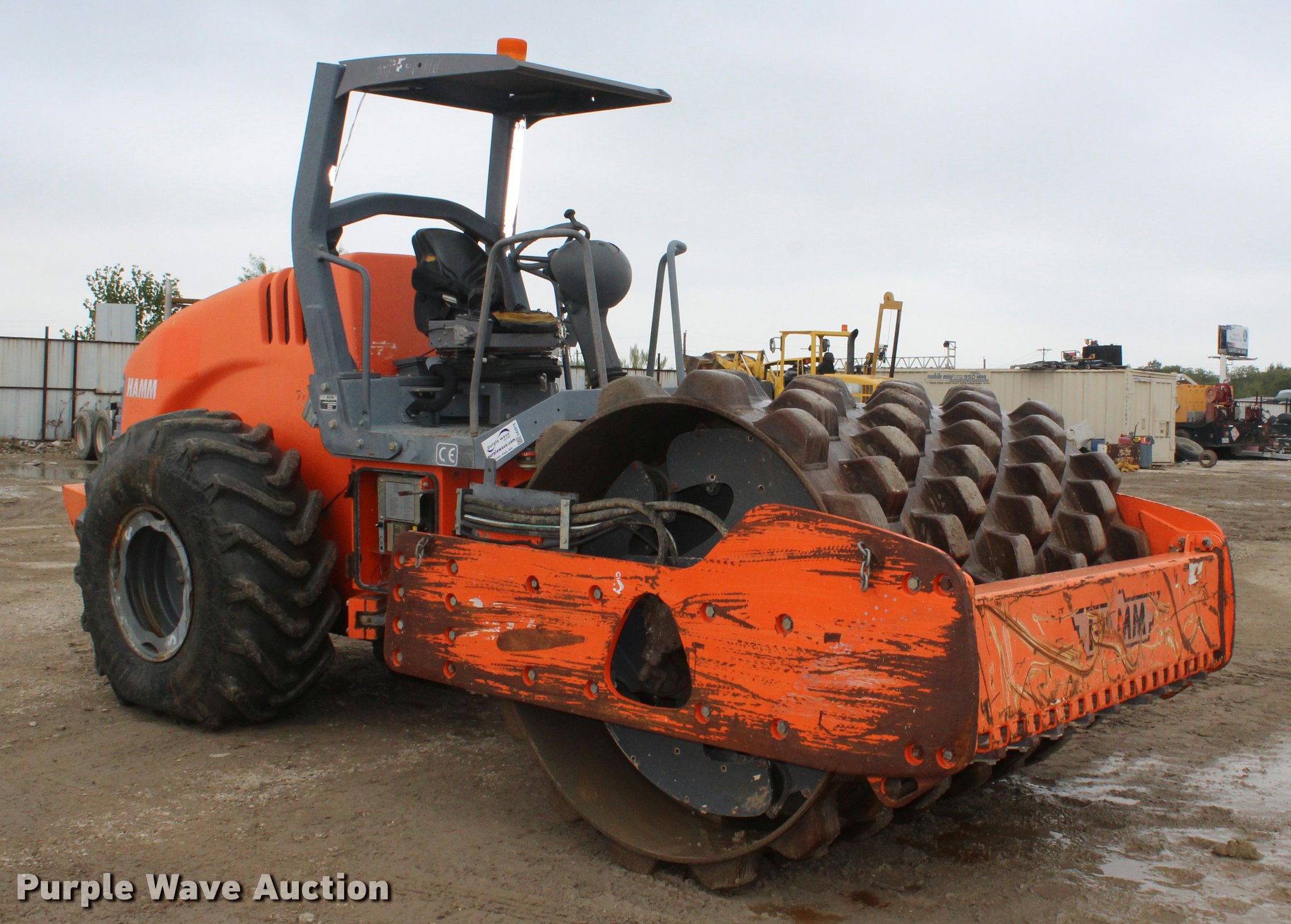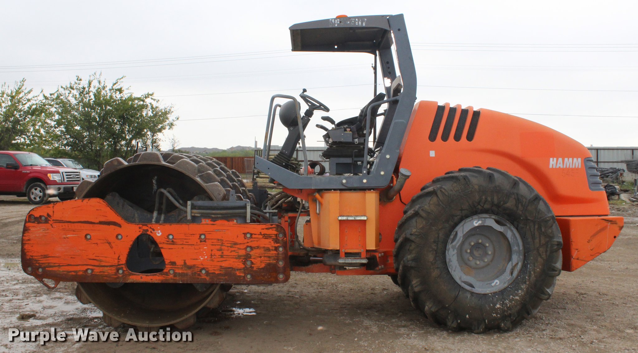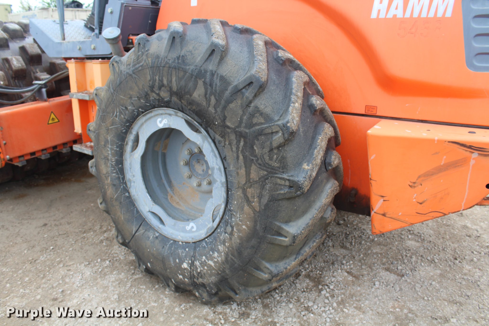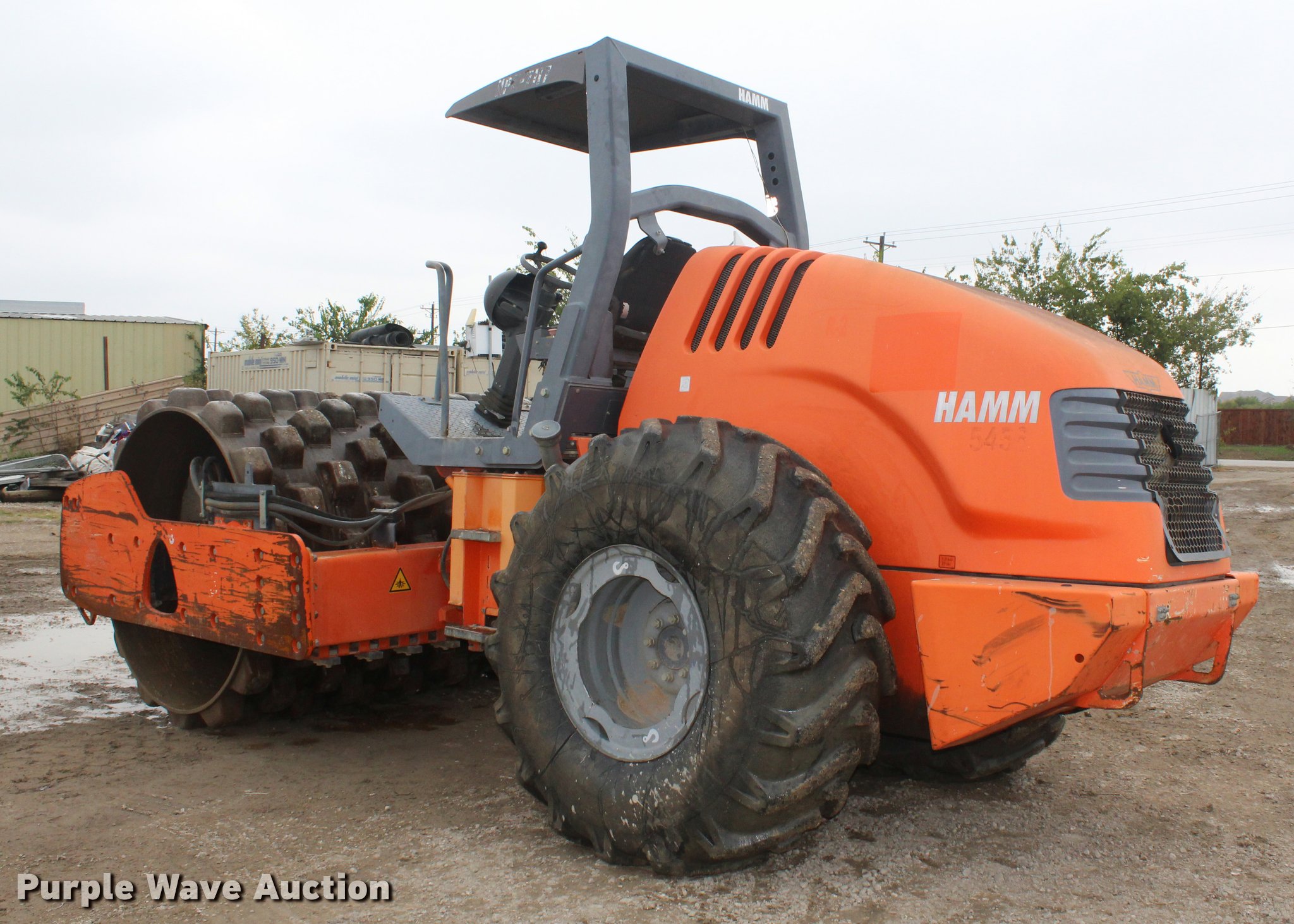 Hamm 3412P single drum roller. 3,105 hours on meter, Duetz BF-4M-2012-C four cylinder turbo diesel engine, Hydrostatic transmission, Canopy, Tilt, Suspension seat, 84"W x 60" diameter padfoot drum, Front and rear drum scrapers, 23.1-26 rear tires, Unit must be jump started. Lewisville, TX 75056